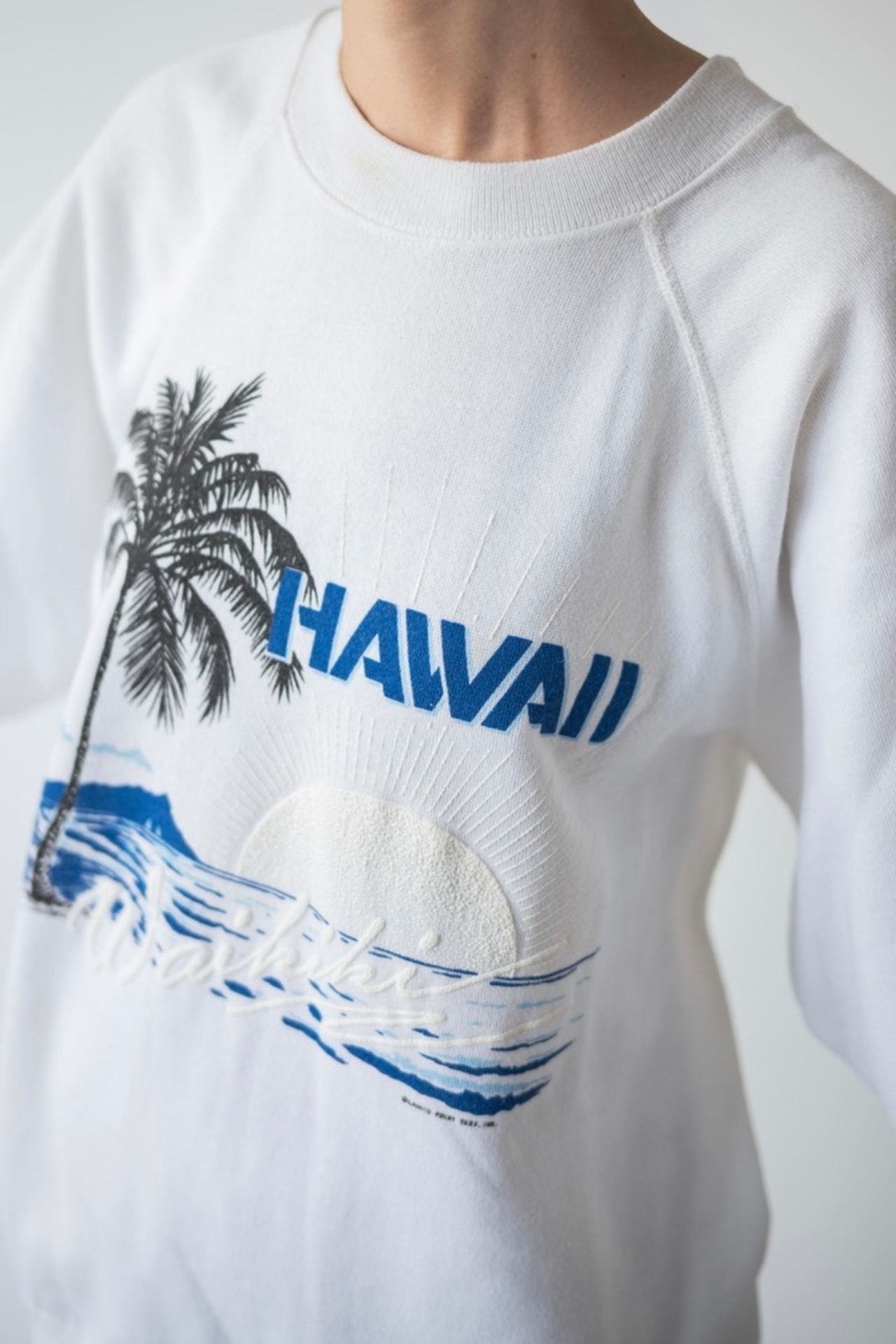 もっちりとした生地の質感と、もこもこプリントがかわいらしいトレーナー。"HAWAII" のブルーがカラーアクセントになった涼しげな一着。