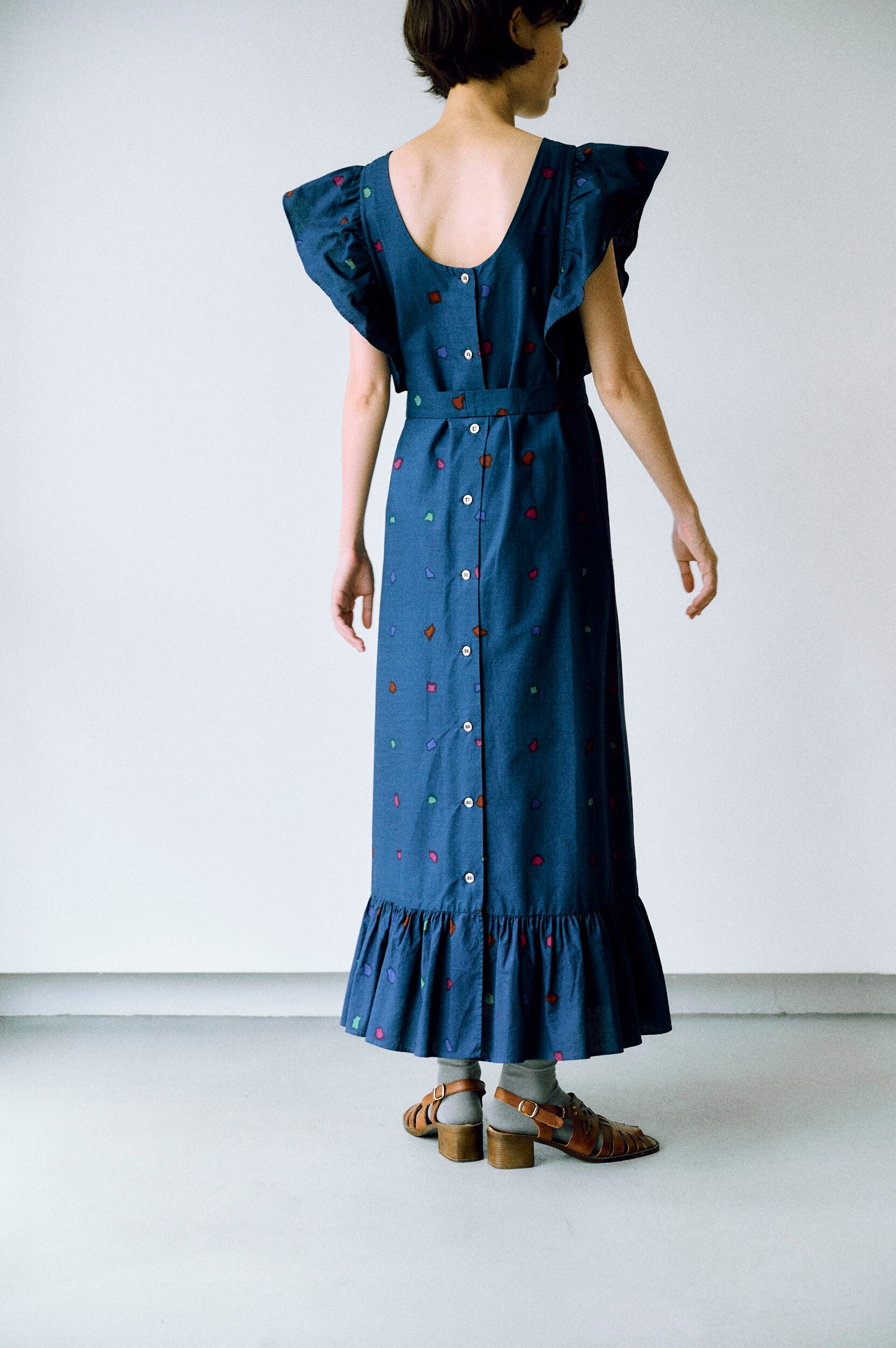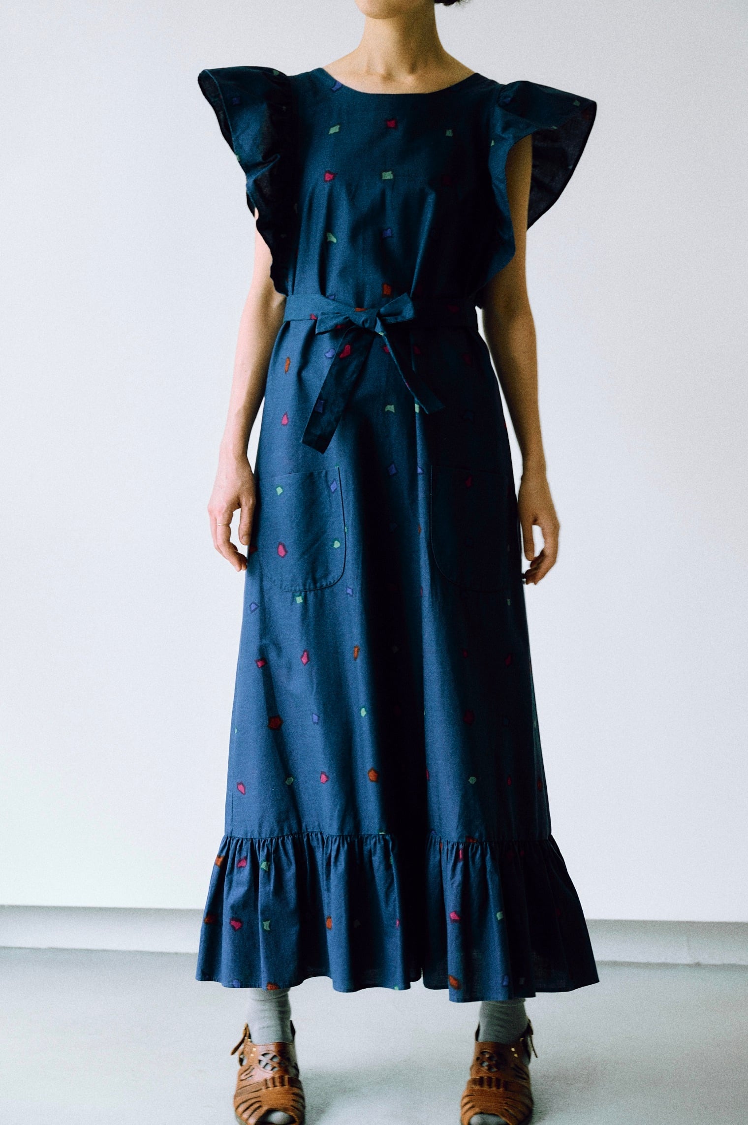 ボタン留めが特徴的なMarimekko(マリメッコ)のエプロンドレス。通称Essu(=フィンランド語でエプロン) dressと呼ばれる1970年代のアイテムで、こちらは色鮮やかな鉱物を散りばめたようなテキスタイルデザインが魅力的な一着です。