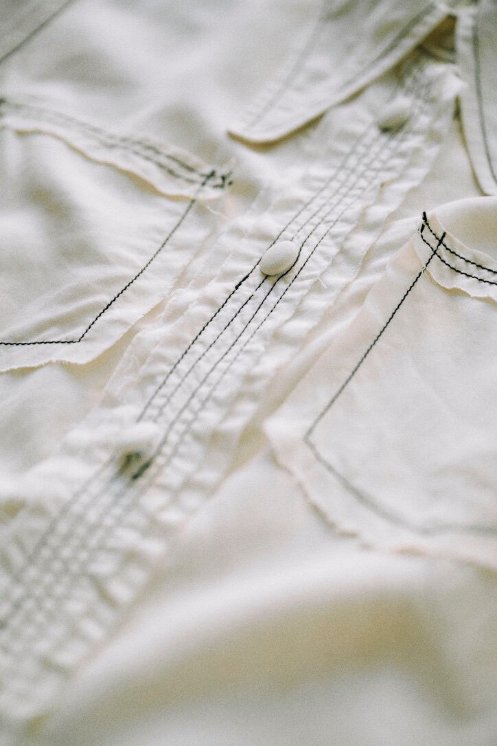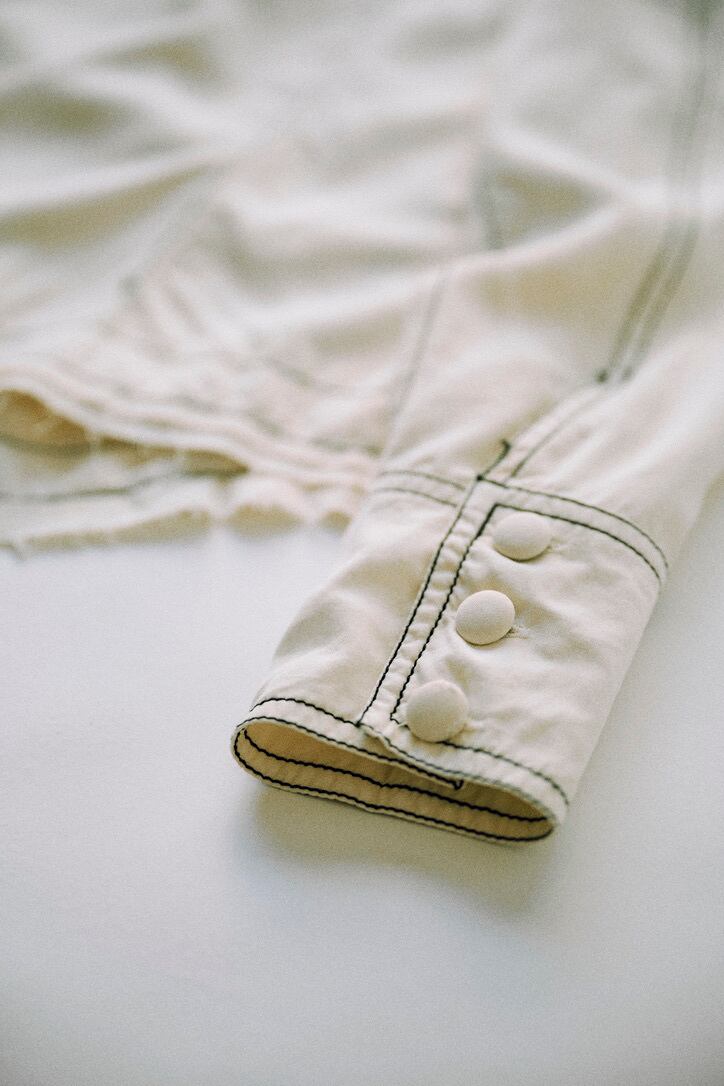 やわらかな光沢と、なめらかな乳白色が上品なムードの生地を使いながら、布端の切りっぱなしやスリムロングな襟など、ステッチのみならずアバンギャルドな要素が散りばめられたデザイン。