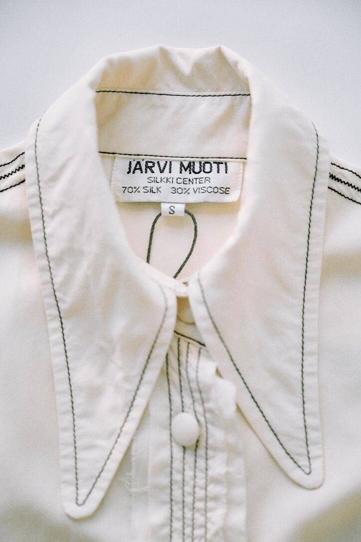 ステッチをドローイングのようにデザインに昇華したシルクレーヨン素材のブラウス。1990年代前後のフィンランド製のアイテムで、「Jarvi Muoti / Silkki Center」というシルク衣類を専門に生産していたブランドによる一枚です。