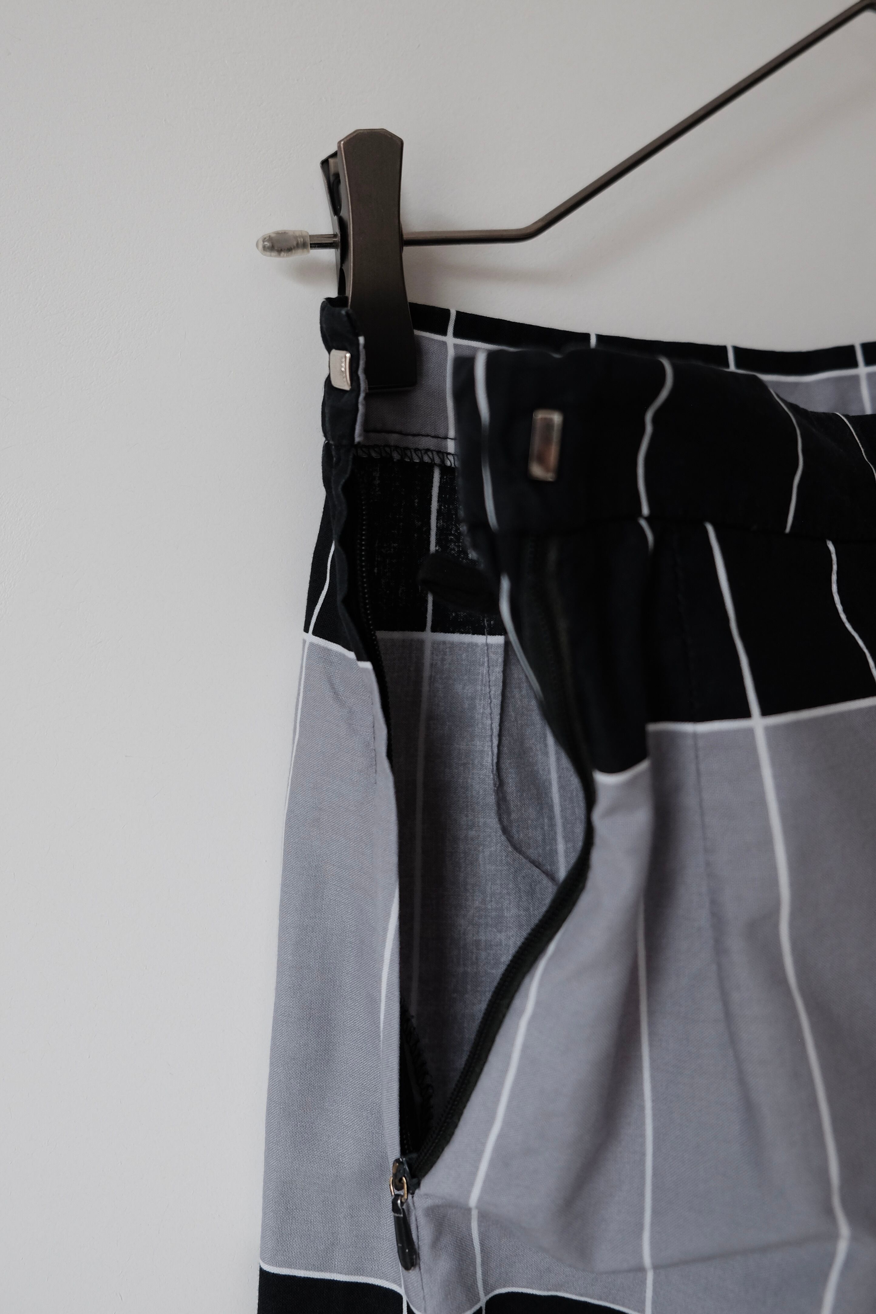 ブラック×グレーにホワイトのアクセントが効いたクールなデザイン。ウエスト周りはタイトに、ヒップの途中あたりから広がるシルエットが特徴的です。