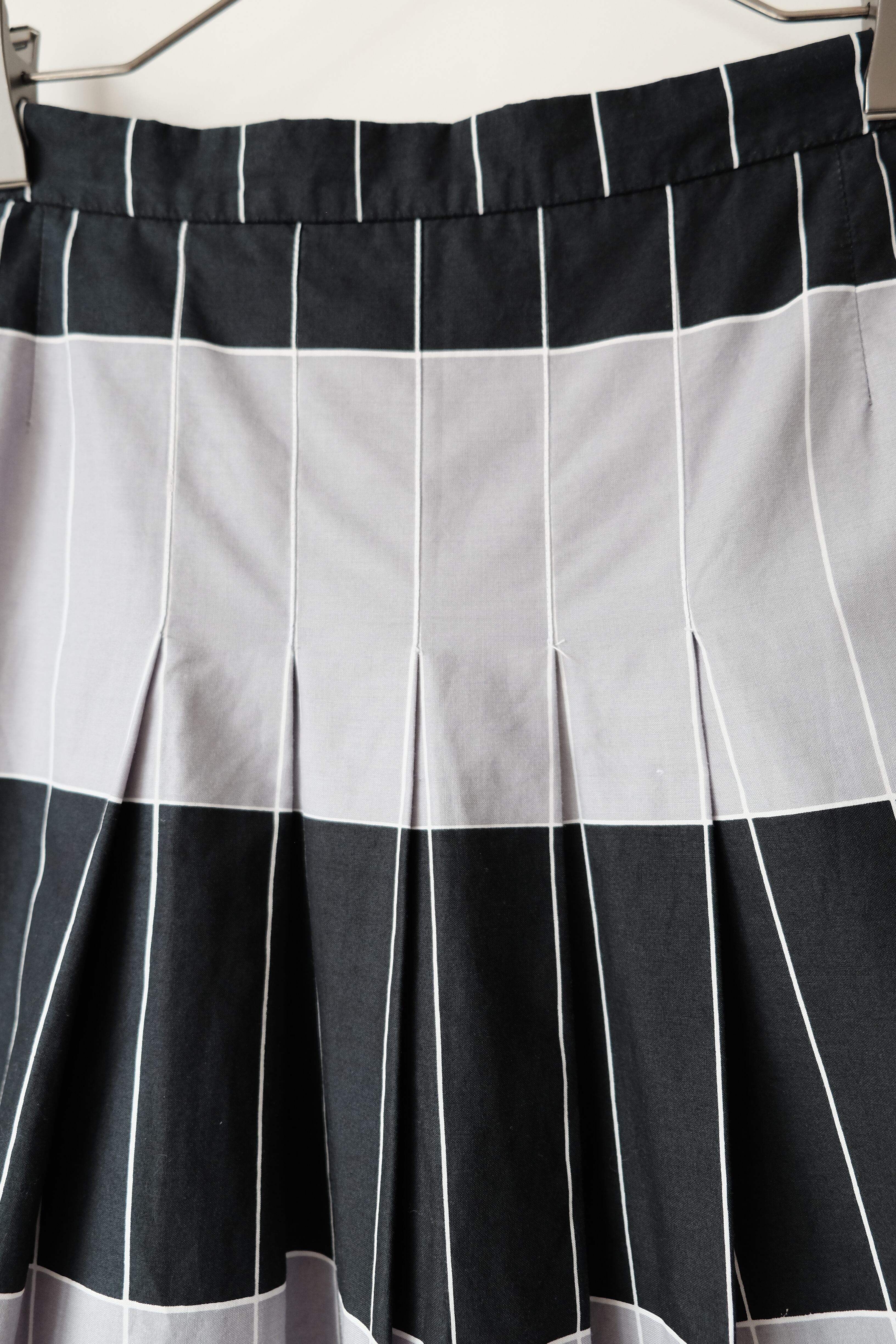 前後5本ずつ、控えめにプリーツが入った膝丈スカート。フィンランドて見つけたハンドメイドと思われるアイテムで、マリメッコっぽいプリントですが定かではありません。