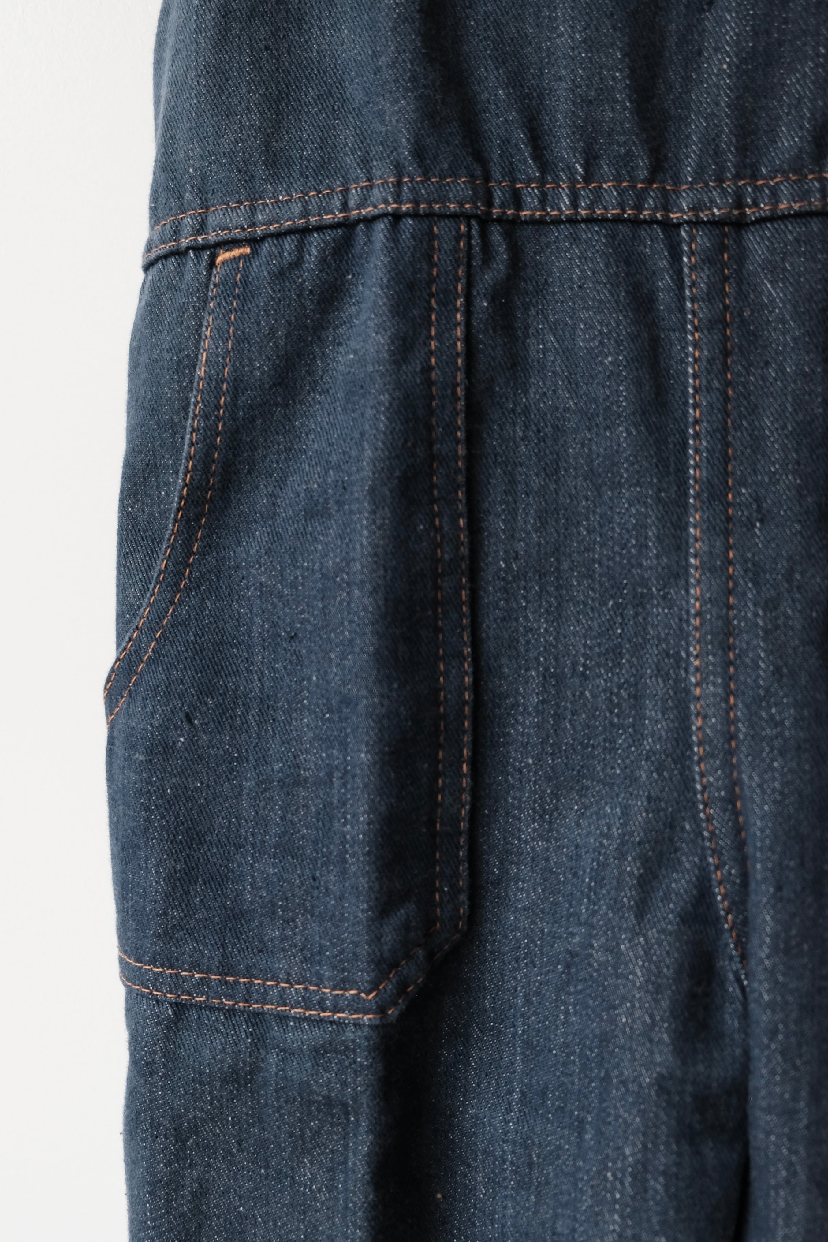 生地はほどよく厚みのあるコットン100%の素材。うっすらと赤みがかったデニム生地とオレンジ色のステッチのカラーマッチが、レトロなムードを加味しています。