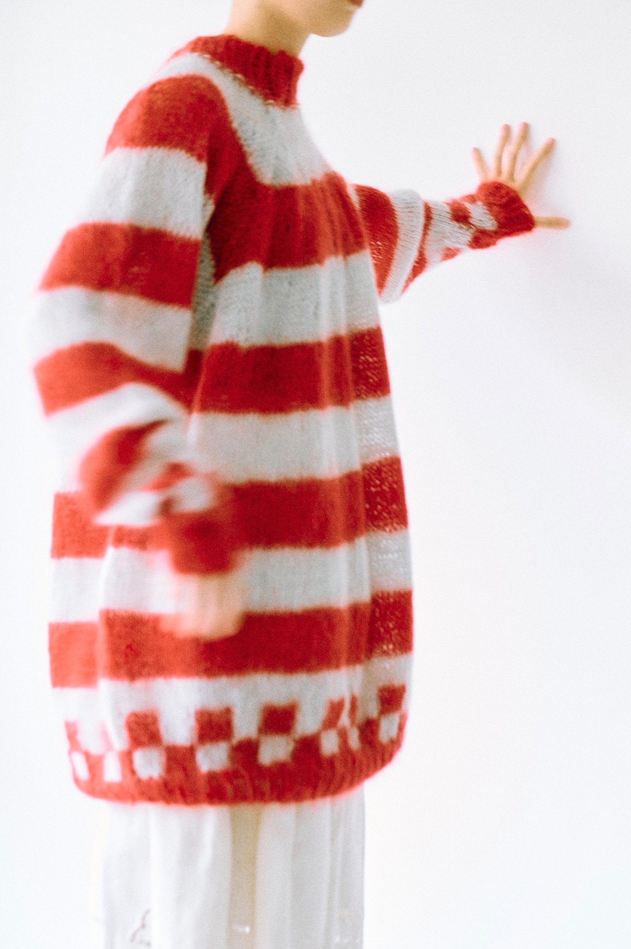 軽くてふんわりとしたローゲージのモヘアセーター。ビビッドな赤とアイシーなブルーグレーのボーダー柄がインパクトのある一着です。