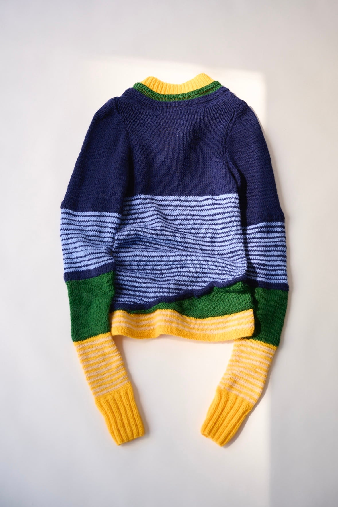 親指出しができる袖の長いセーター。ストライプや柄の切り返しがうねうねと立体的に編まれた、視覚的に楽しめる一着です。