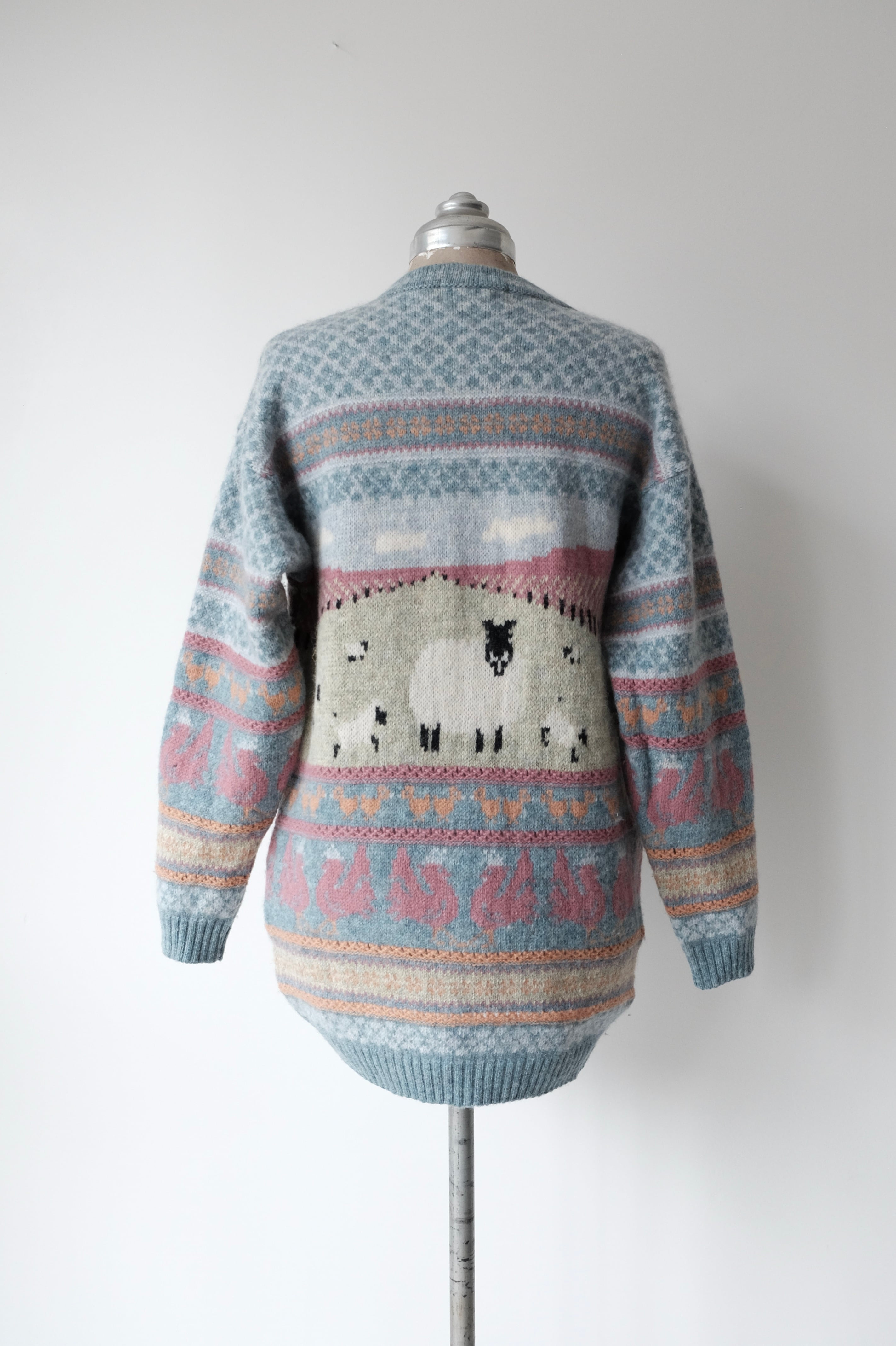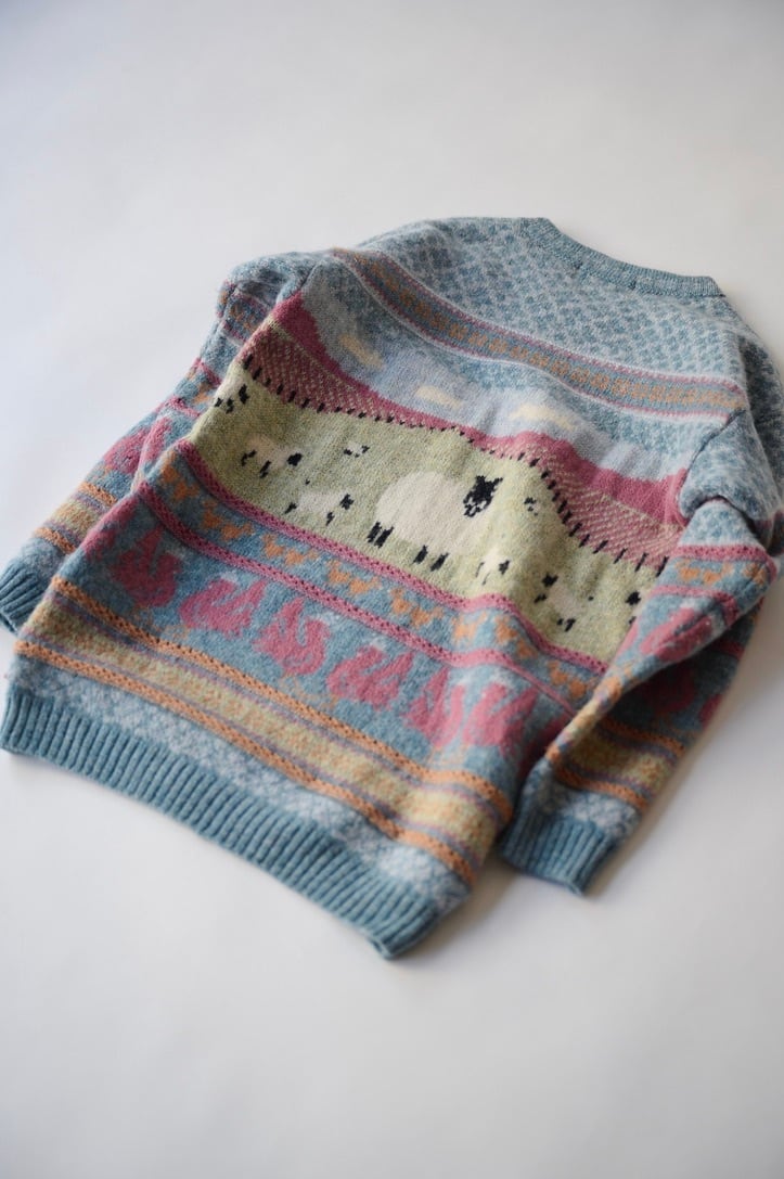 羊がこちらを見つめるフェアアイル調のニットセーター。パステルトーンで牧場の風景が編み上げられています。