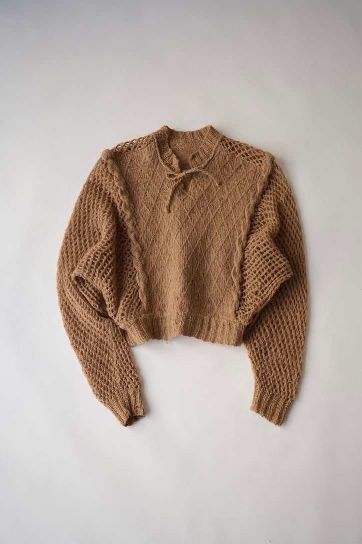 ショート丈のケーブルニットプルオーバー。前身頃はダイヤ柄とケーブル編み、袖はざっくりとしたメッシュ編みになった、編地のコントラストが印象的な手編みの一着。
