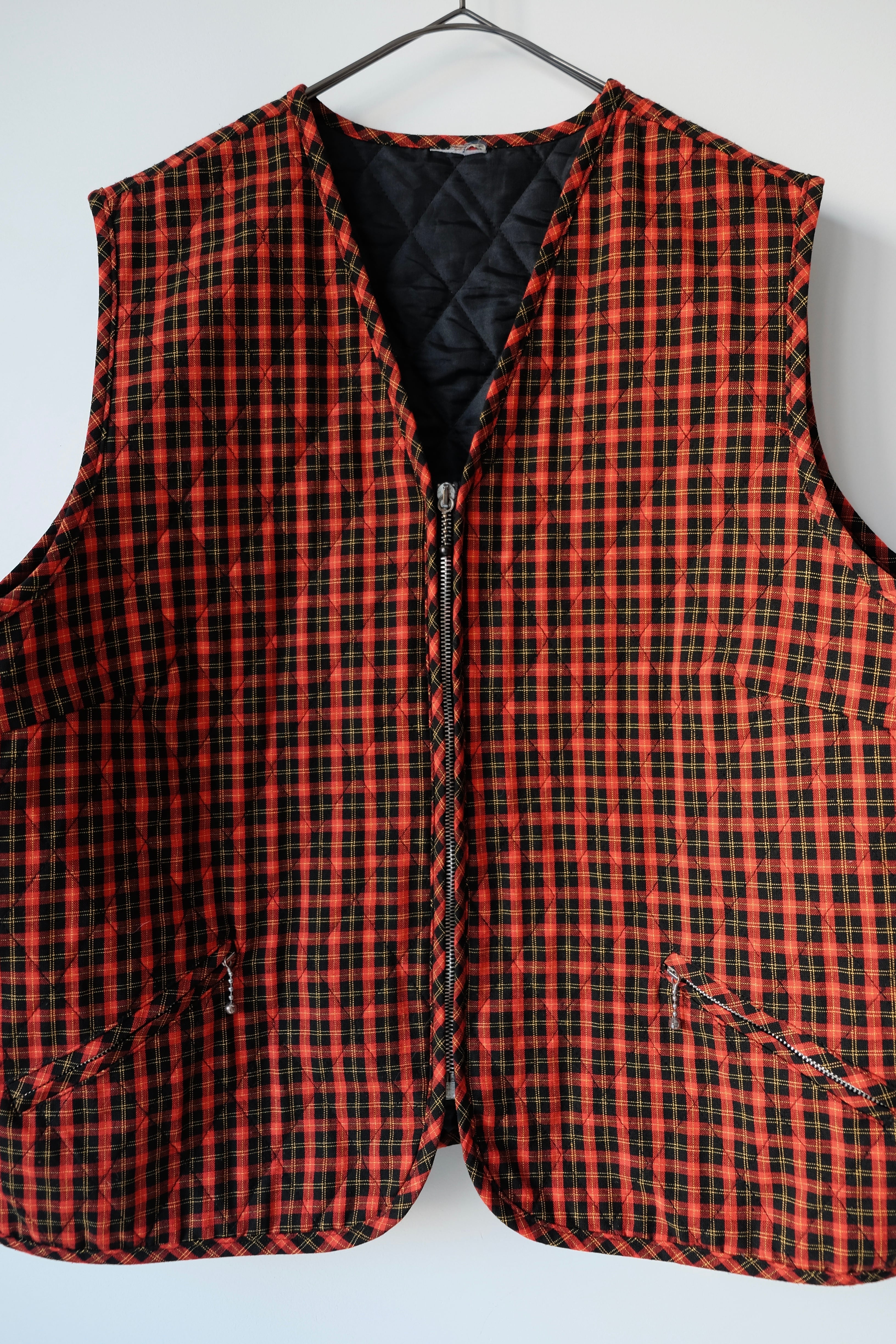 80〜90年代初期のムードを感じる赤いチェック柄キルティングベスト。身幅ゆったりのシルエットで、コートの上からでも羽織れるサイズ感です。