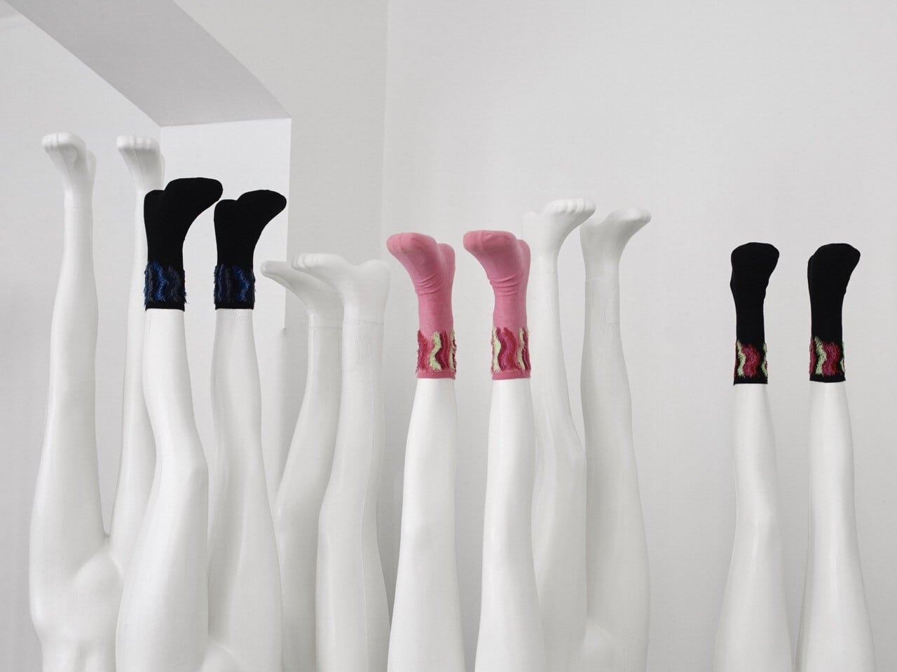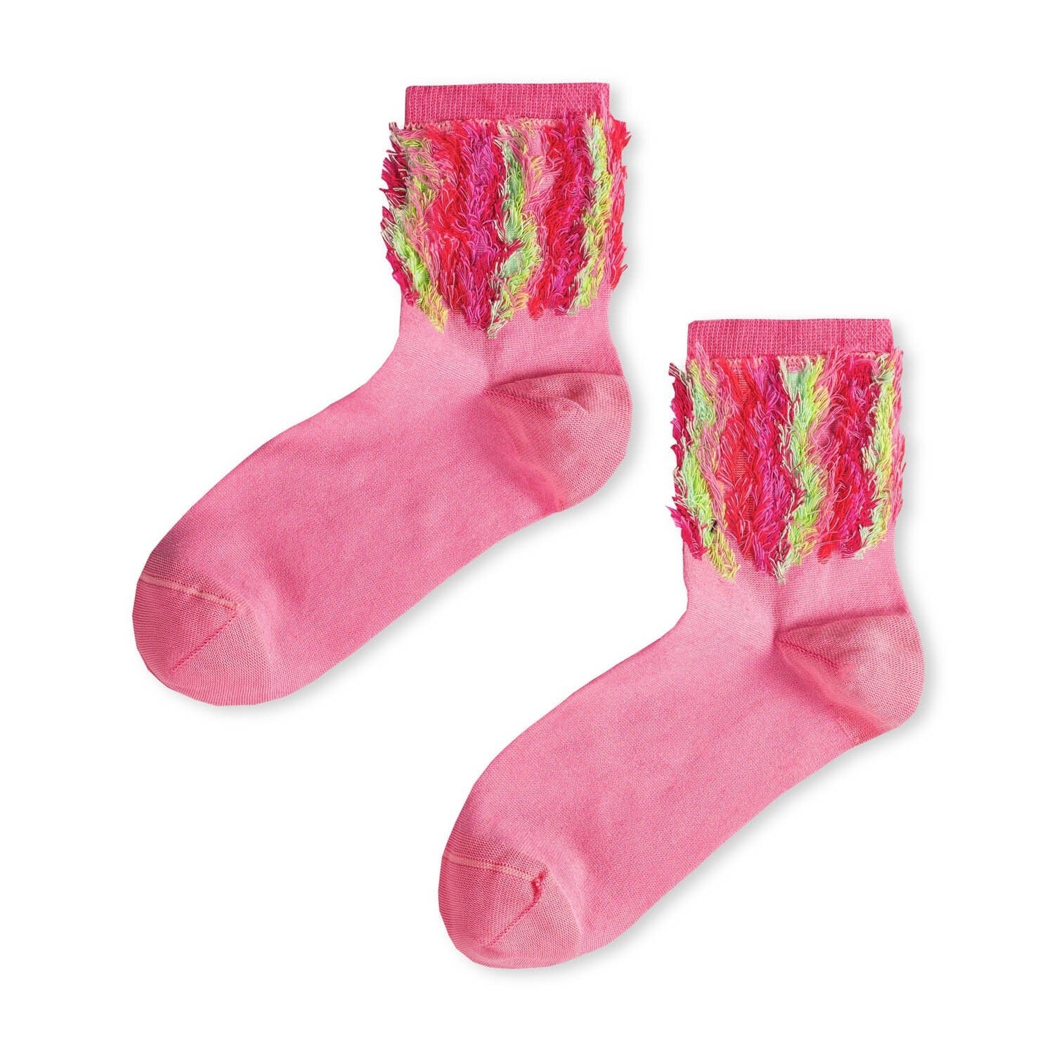 靴下が本来そうであるべき裏表をひっくり返し、織り糸を切り裂いて足首に炎をまとったかのように仕立てたソックス。チェコのファッションデザイナー、テレザ・ロザリー・クラドショヴァーによるデザインです。短めの丈感で、足元でもけもけとした存在感を放ちます。