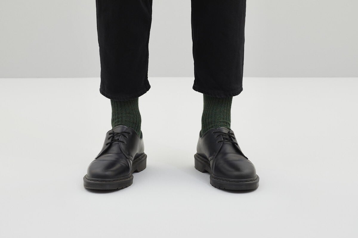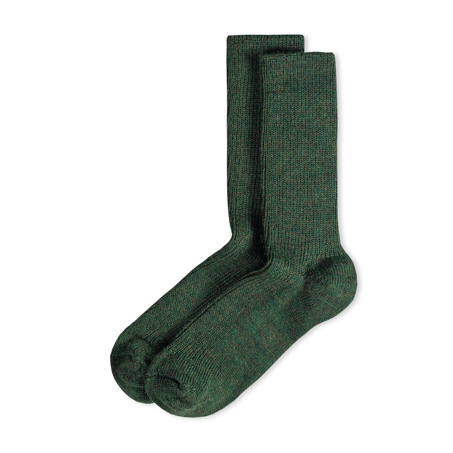 クリスマスグリーンの厚手ニットソックス。素材にウール混の糸を使用しています。あまり緩みのない、しっかりとした着用感なので外履きとして履きやすいニットソックスです。