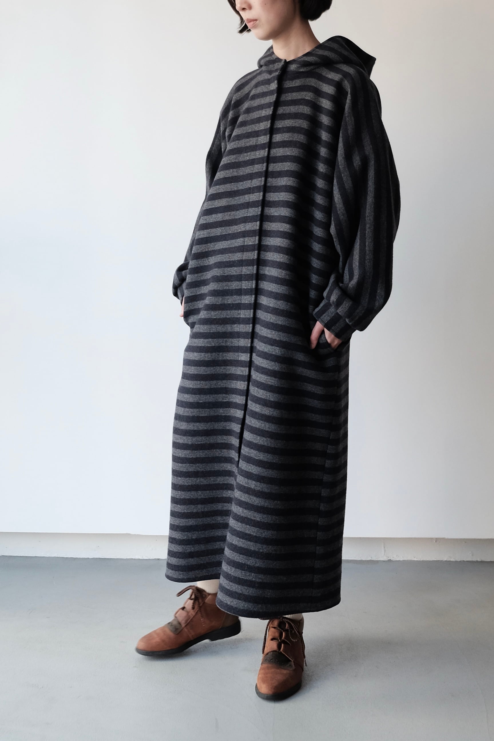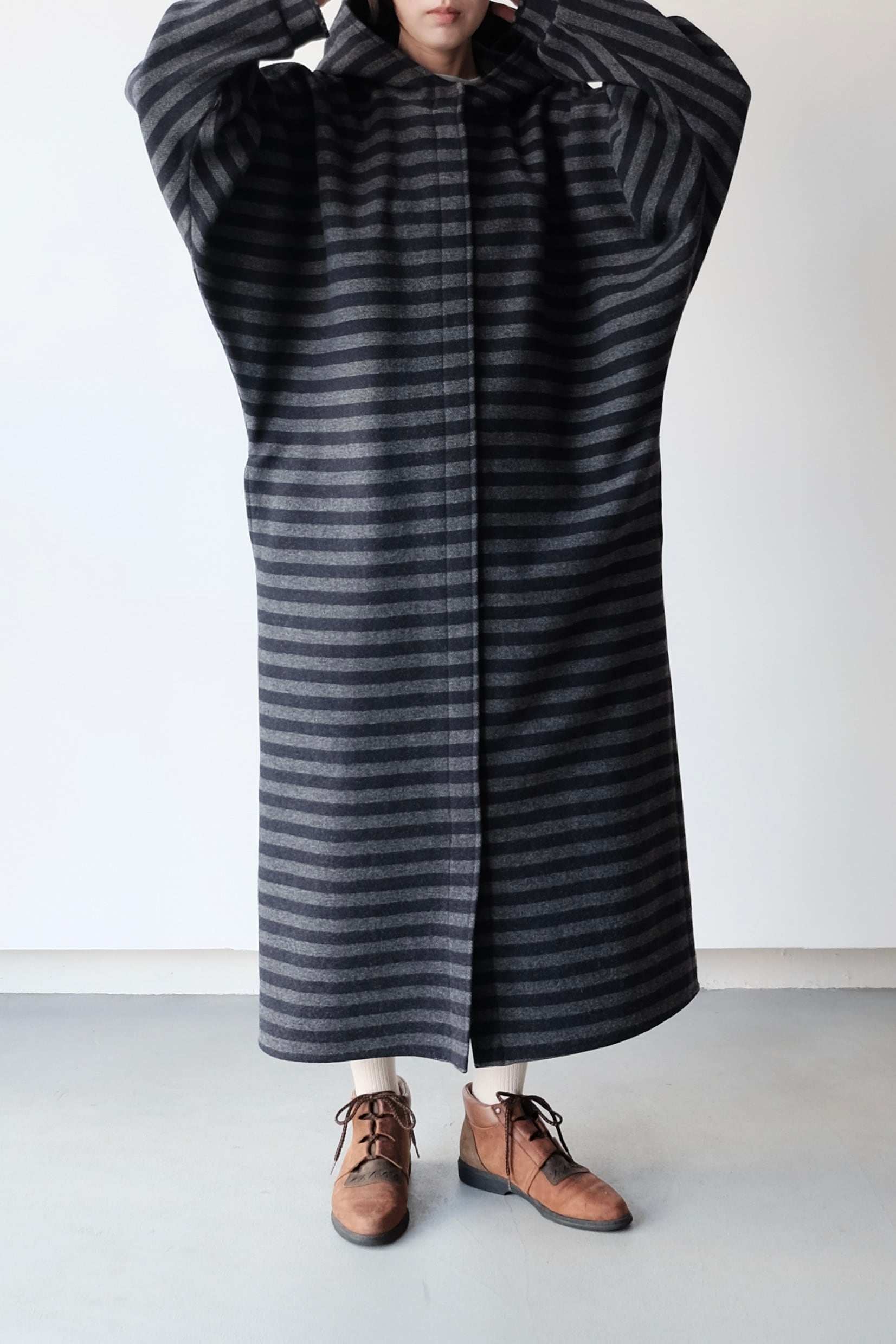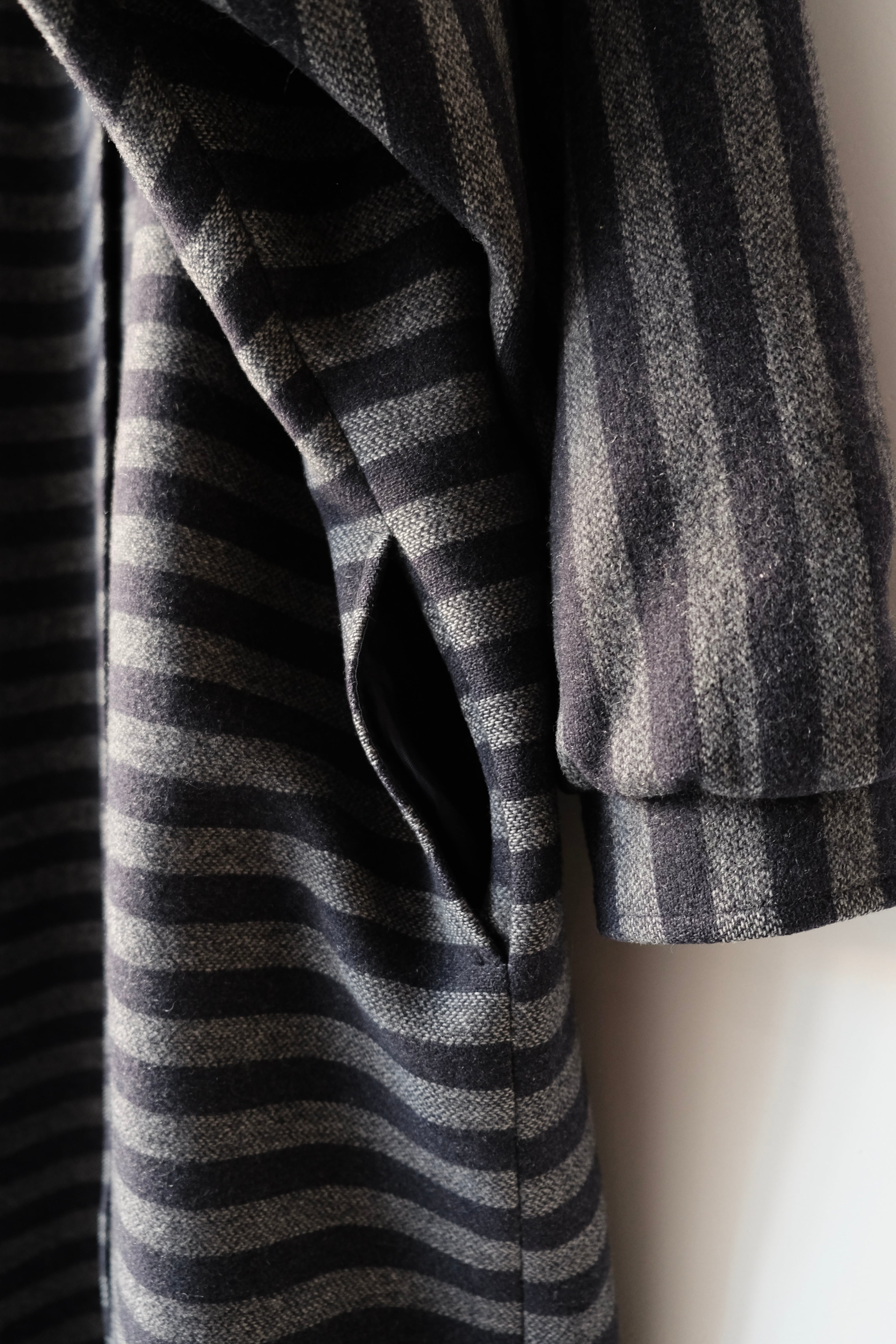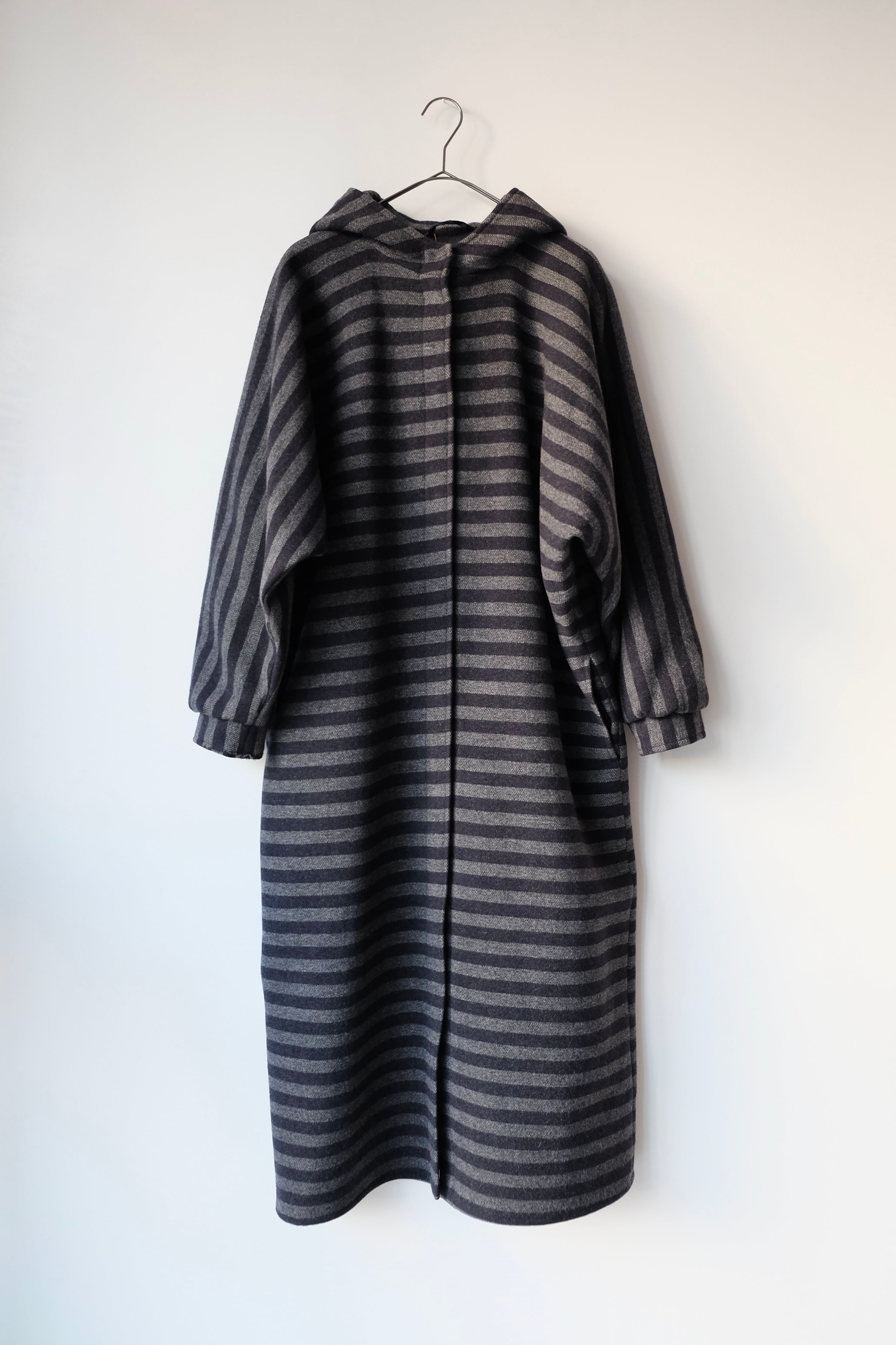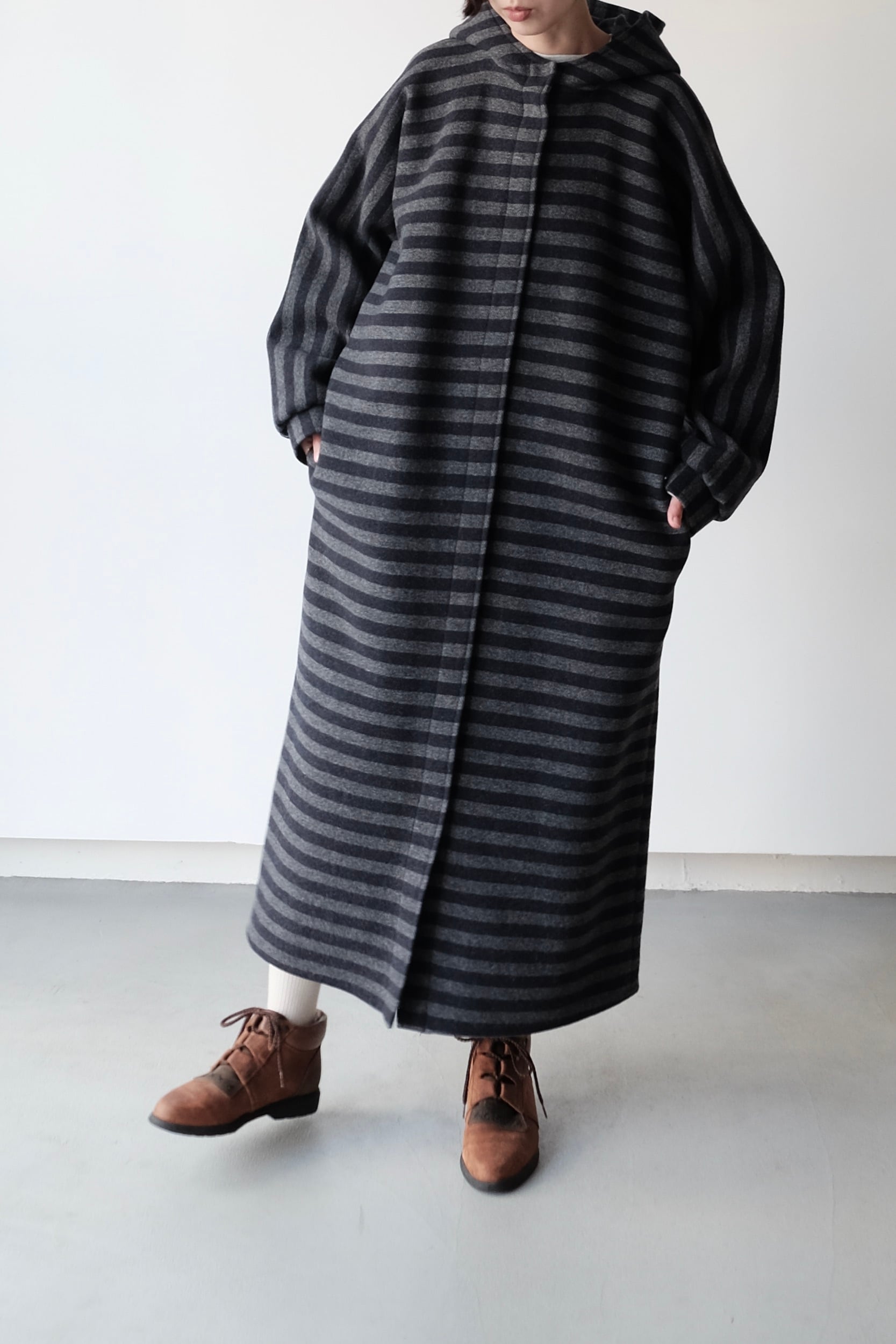 深みのあるグレーにネイビーのストライプが、シンプルにも大胆にも感じさせる絶妙な佇まいがVUOKKOらしいデザイン。生地にはほどよく厚みのあるピュアウール素材が使われており、しっかりとした防寒性を併せ持っています。