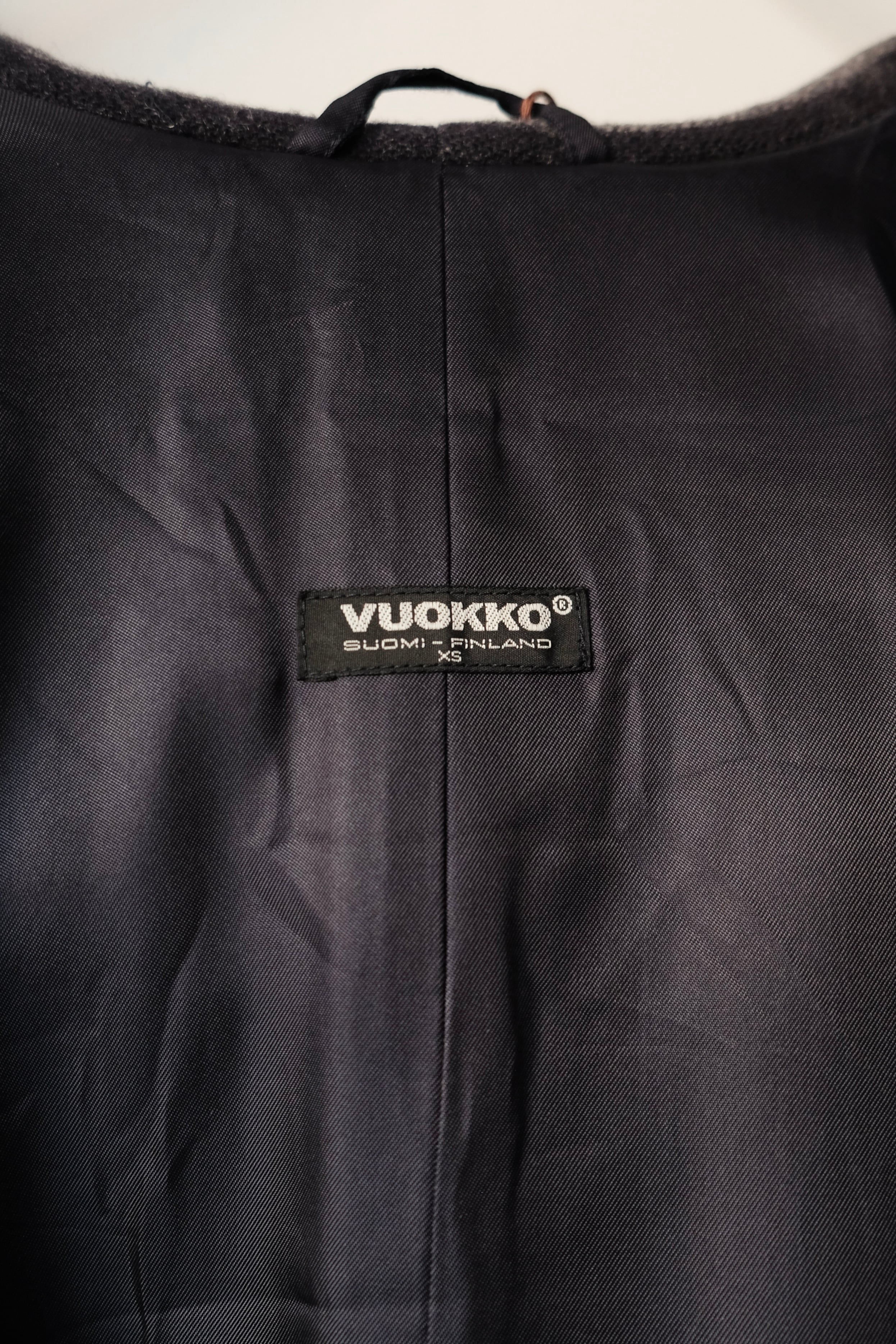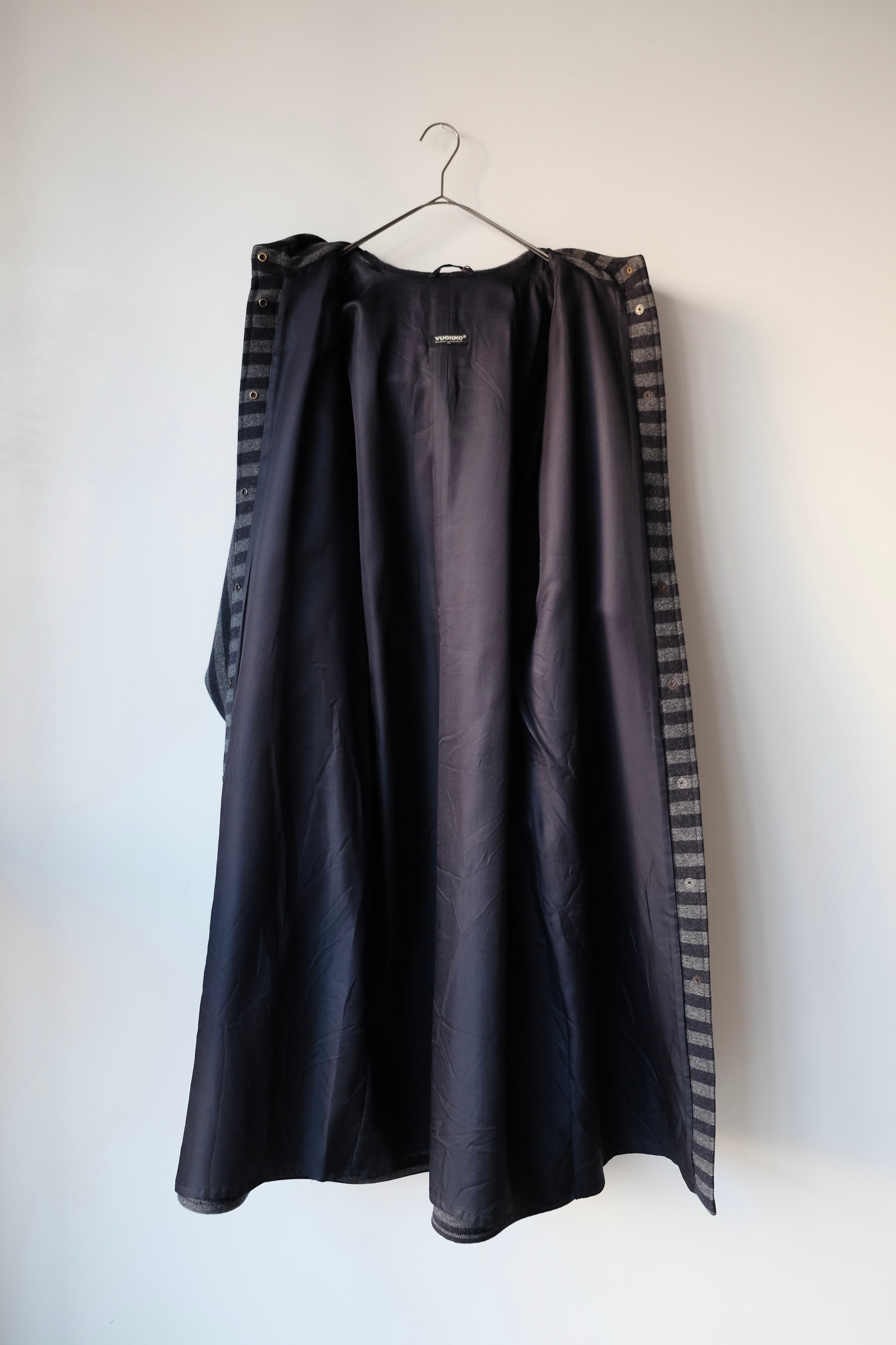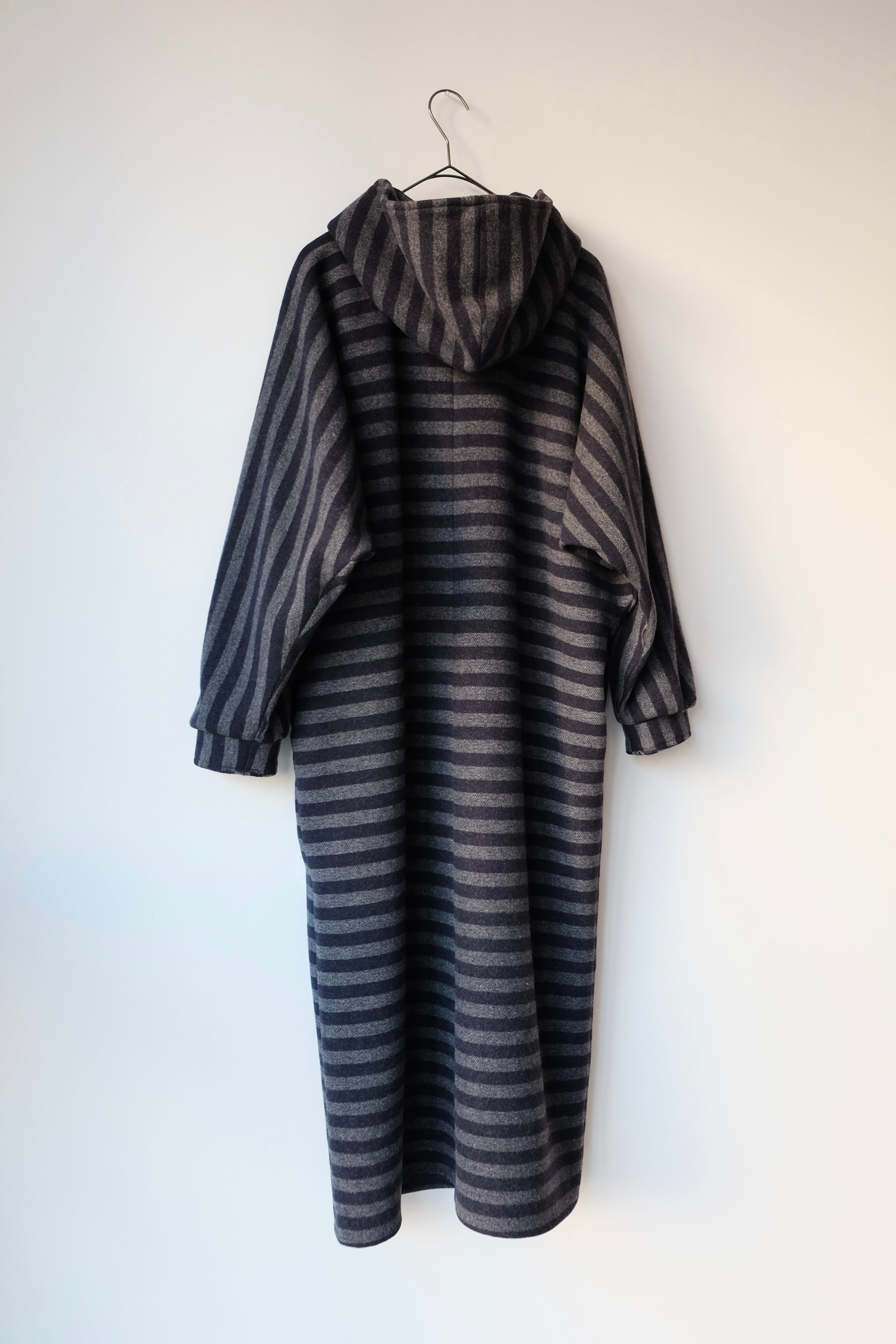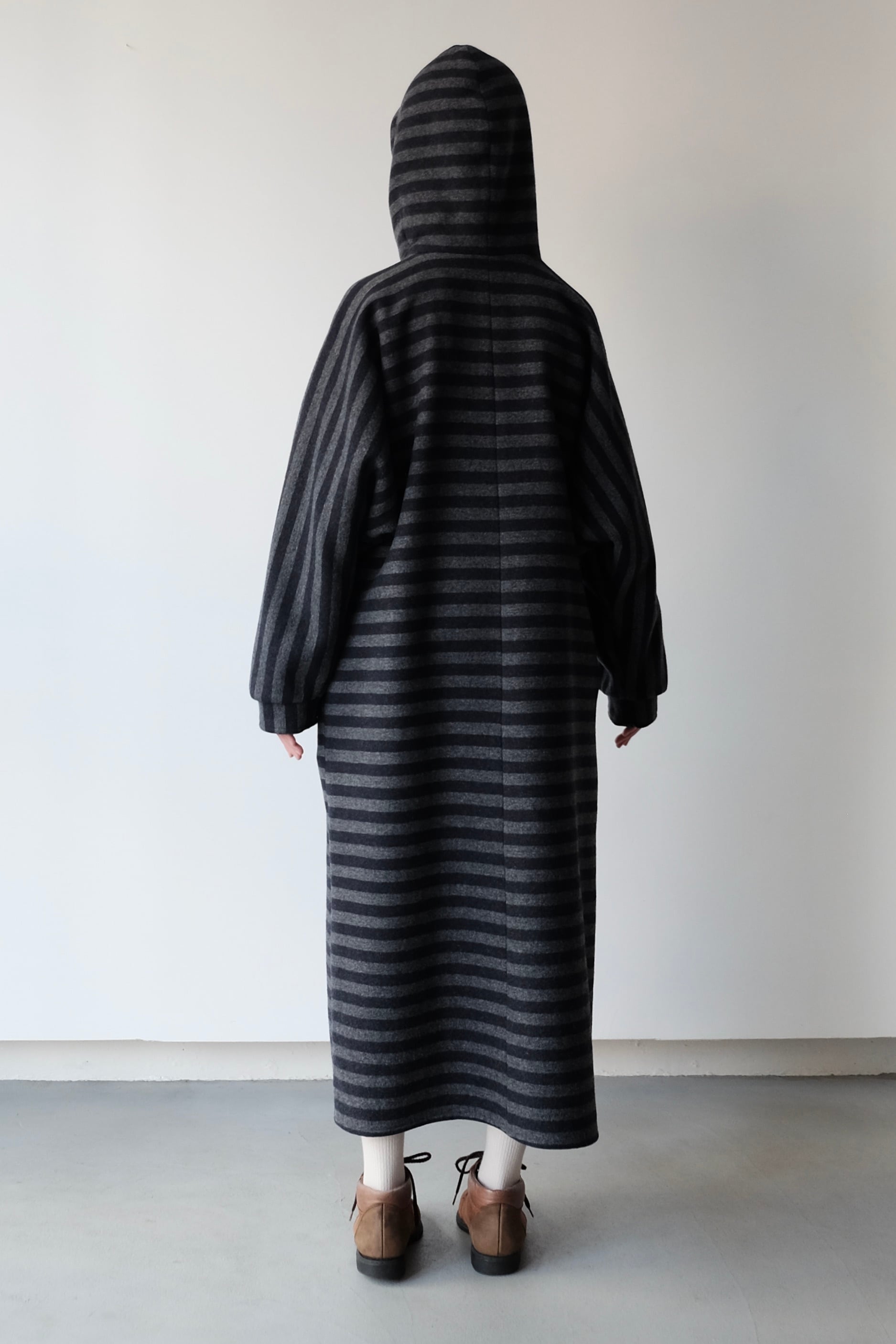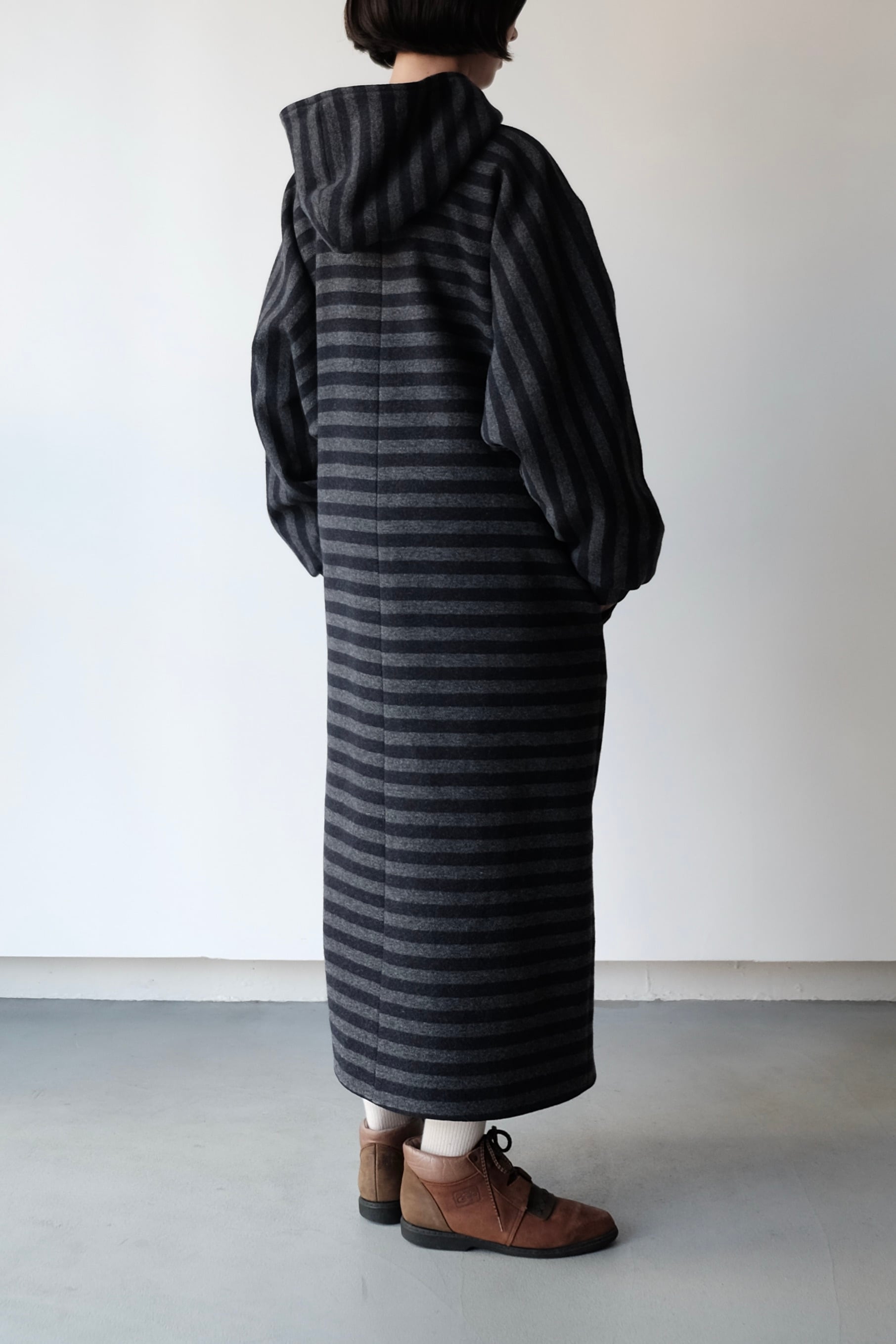 深みのあるグレーにネイビーのストライプが、シンプルにも大胆にも感じさせる絶妙な佇まいがVUOKKOらしいデザイン。生地にはほどよく厚みのあるピュアウール素材が使われており、しっかりとした防寒性を併せ持っています。