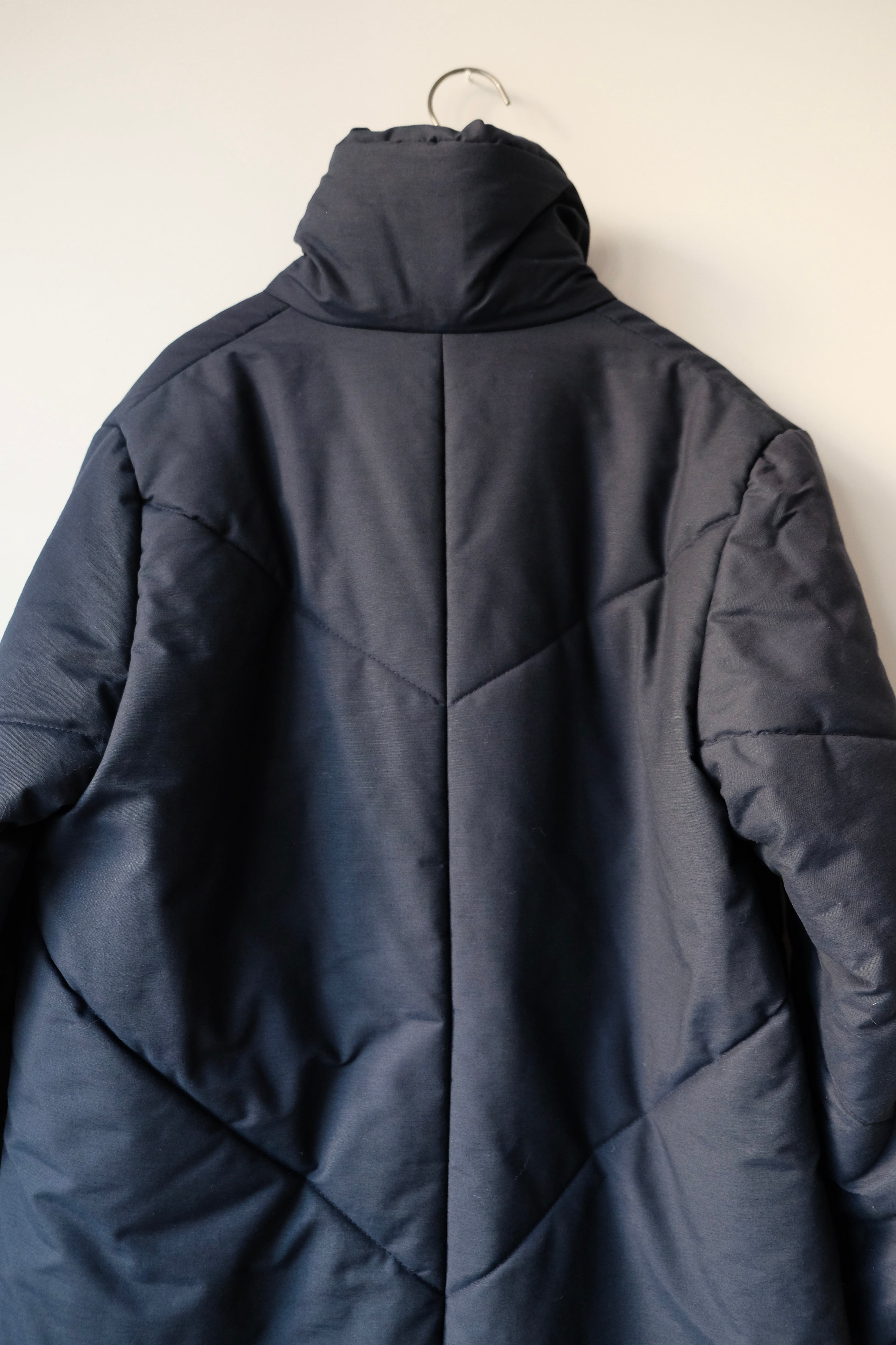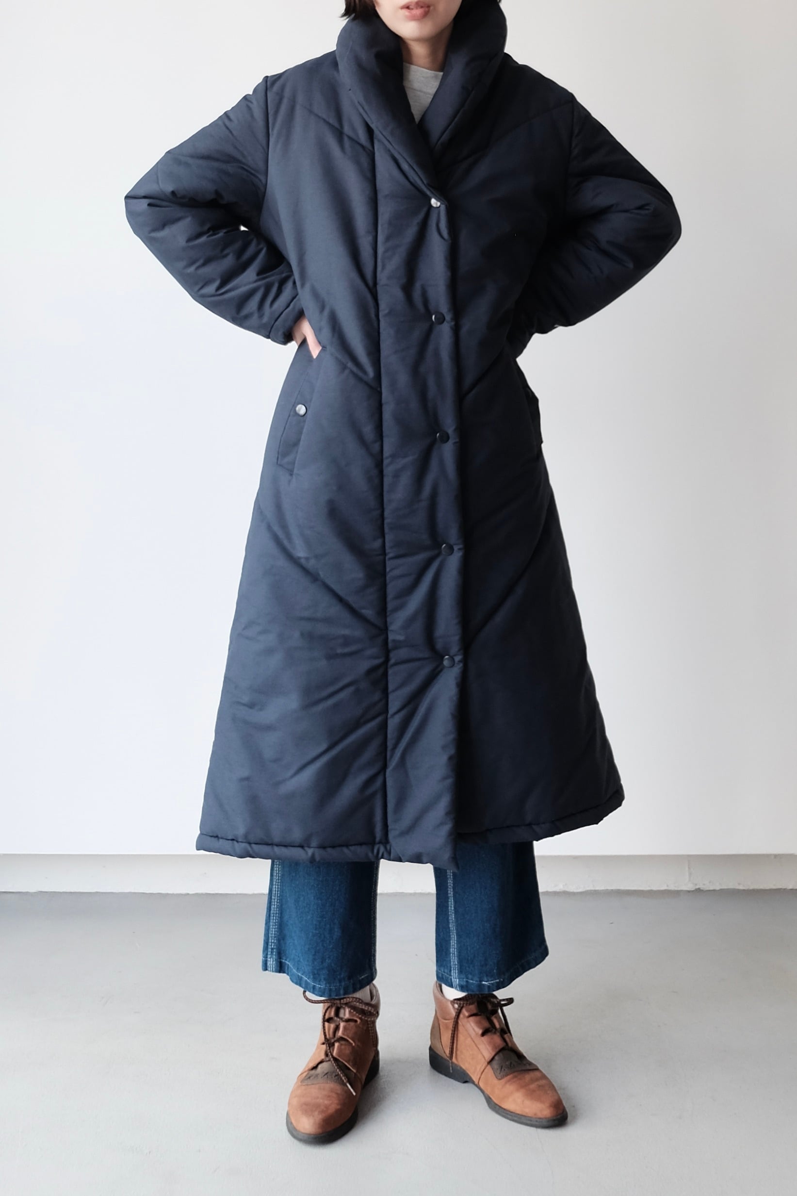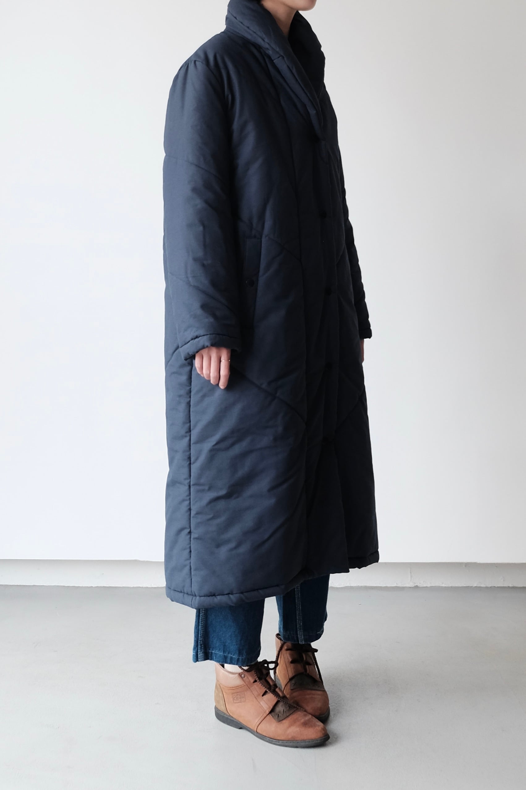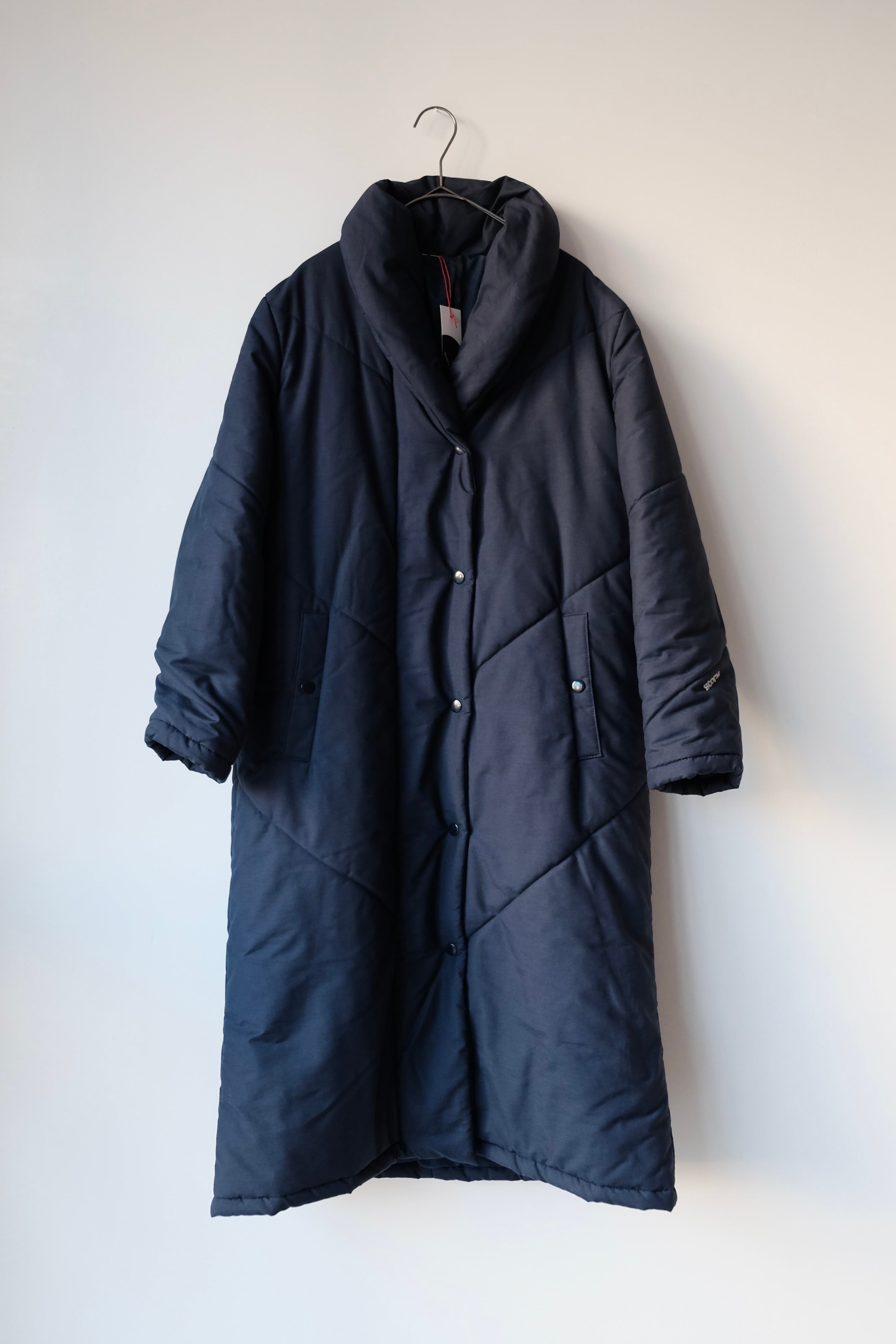 首元をすっきりと包み込む、枕のようにボリュームのあるスタンドVカラーが印象的な中綿ロングコート。こちらは1980年代頃のフィンランドのヴィンテージアイテムです。