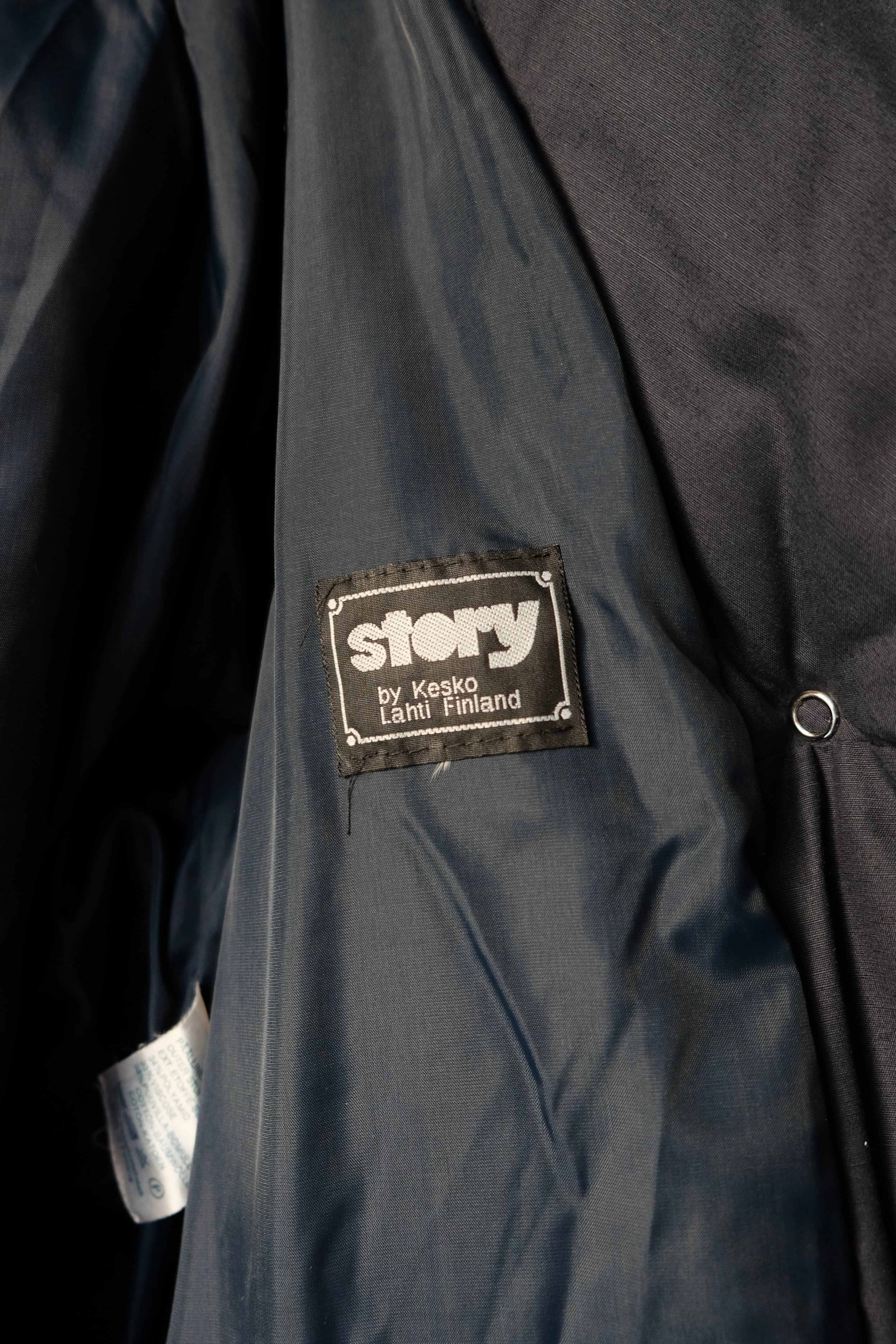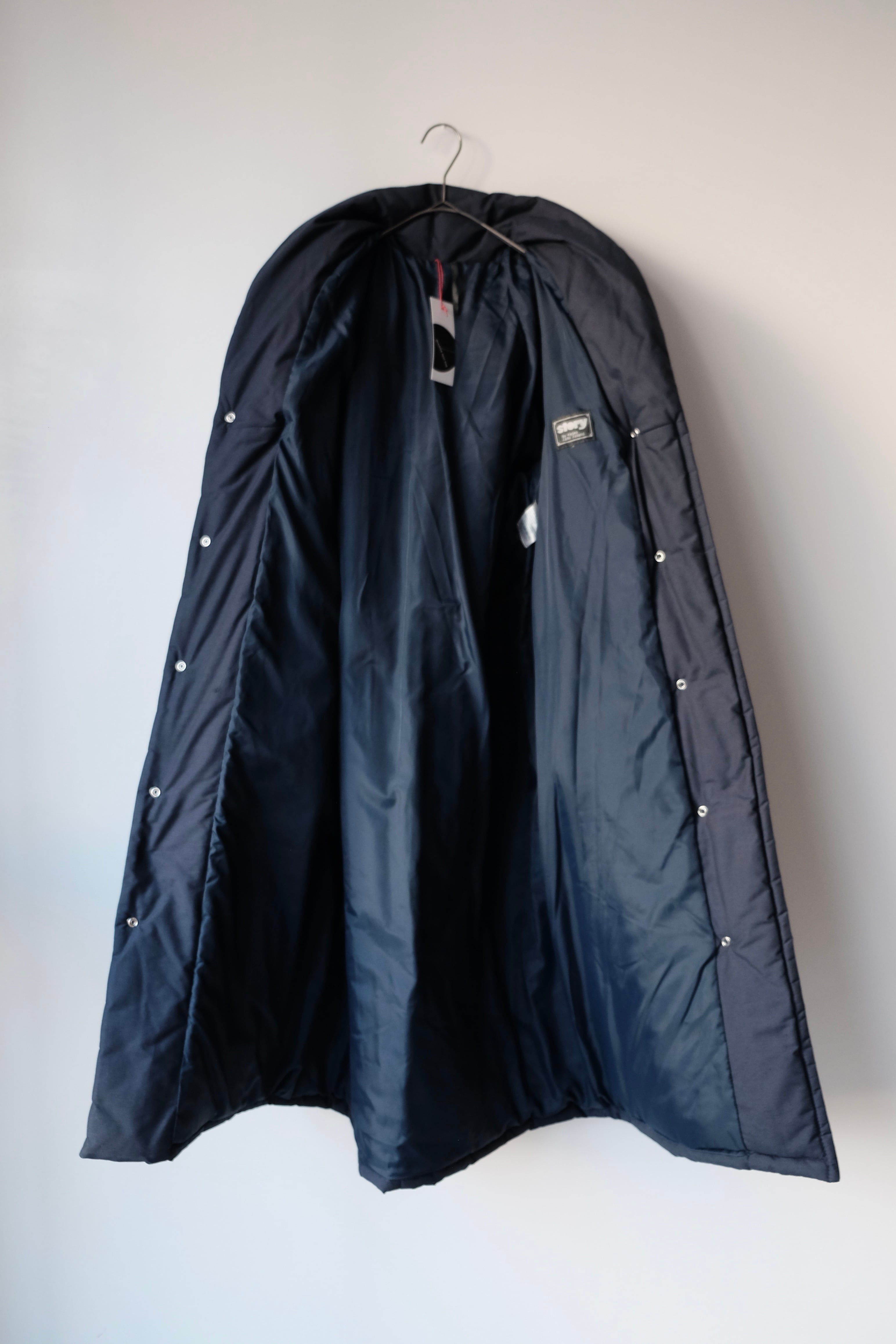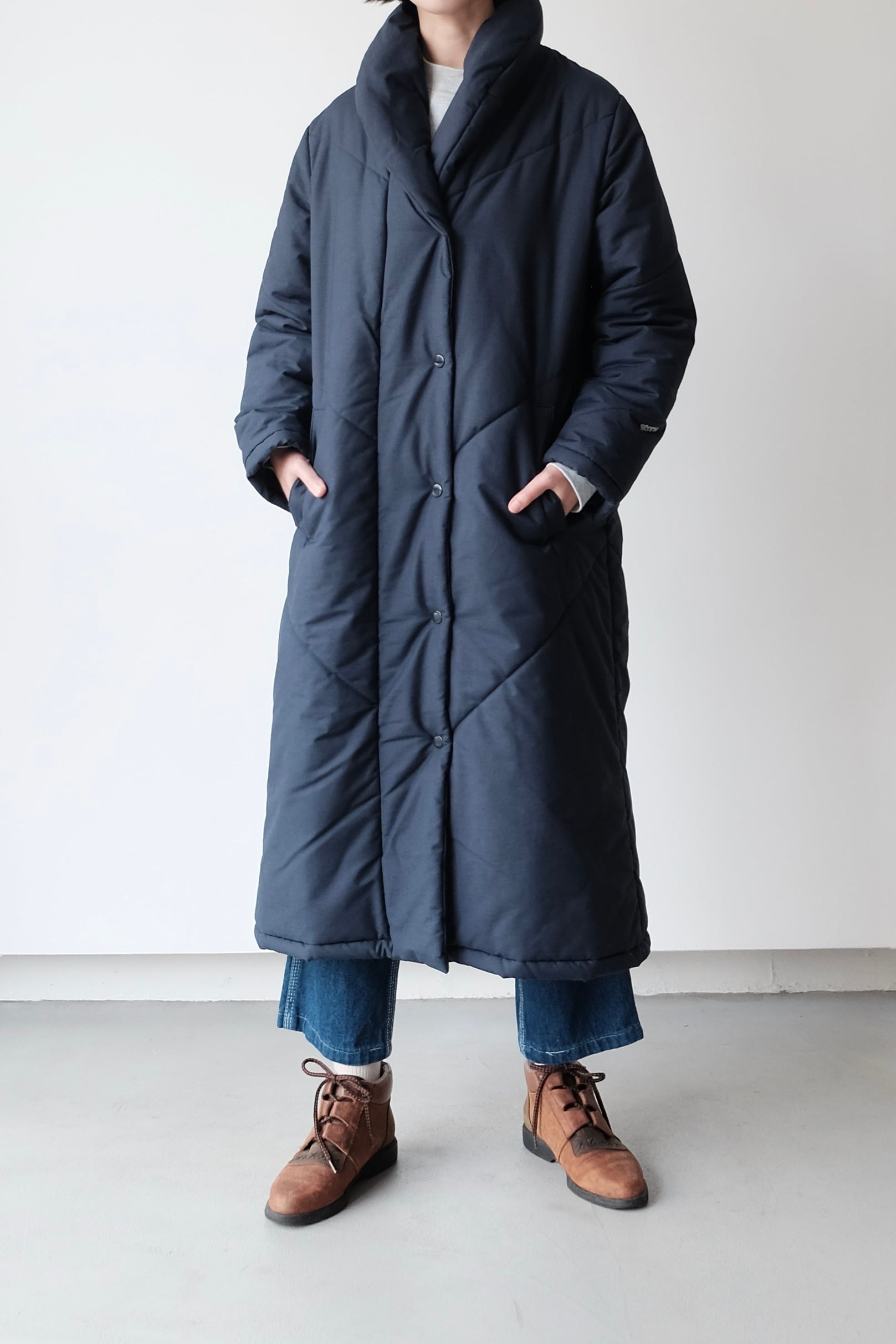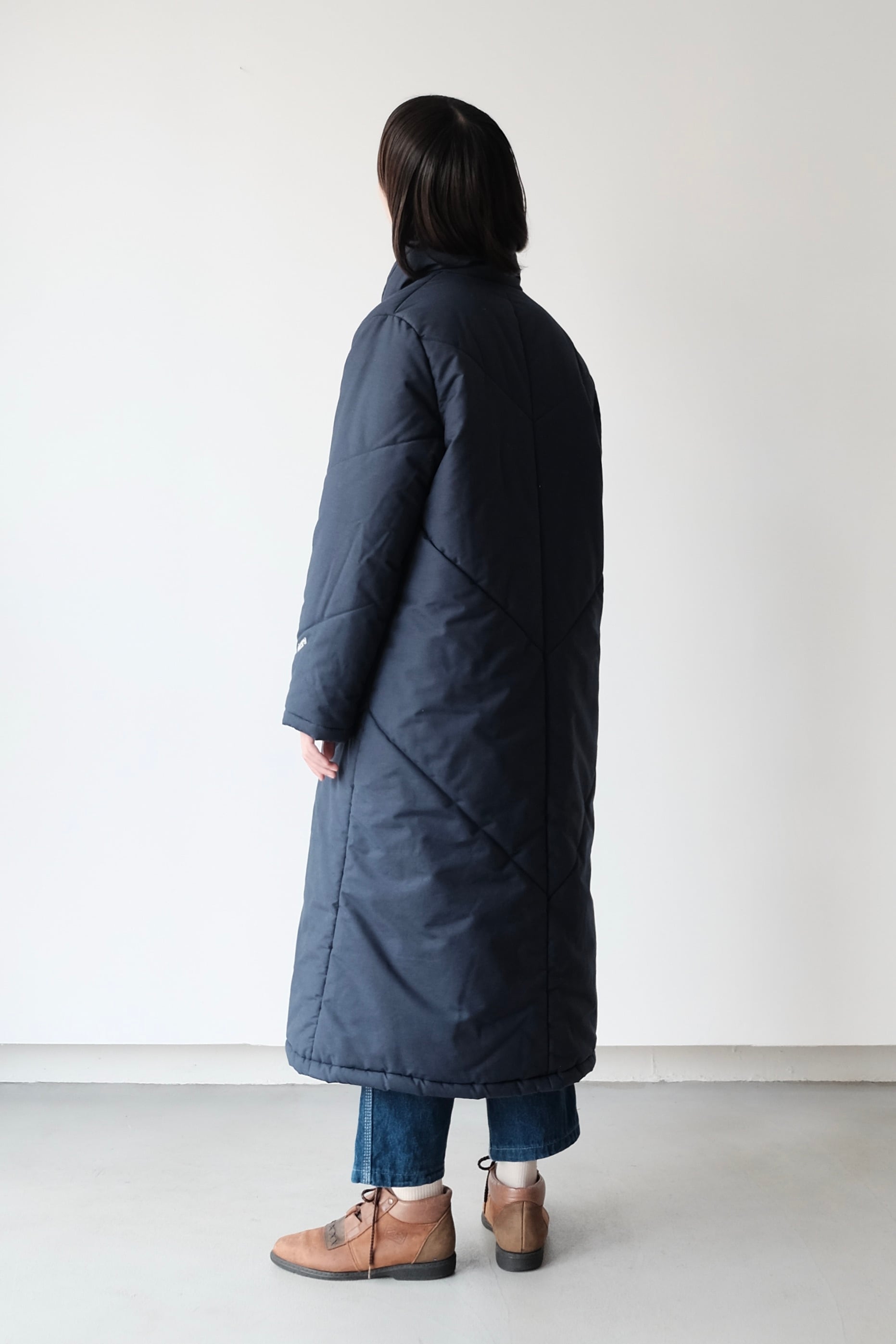 首元をすっきりと包み込む、枕のようにボリュームのあるスタンドVカラーが印象的な中綿ロングコート。こちらは1980年代頃のフィンランドのヴィンテージアイテムです。