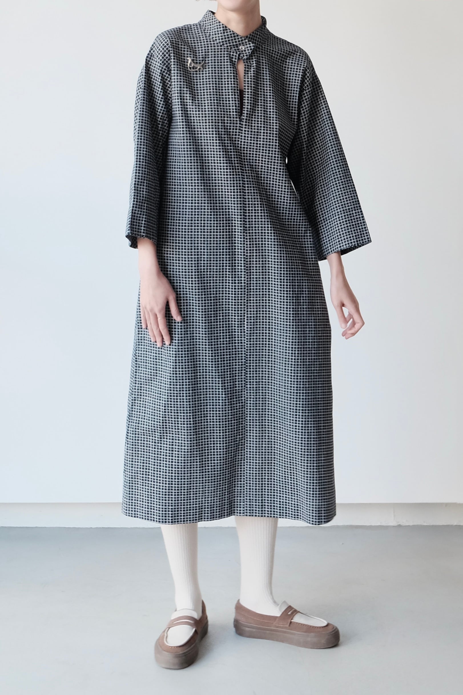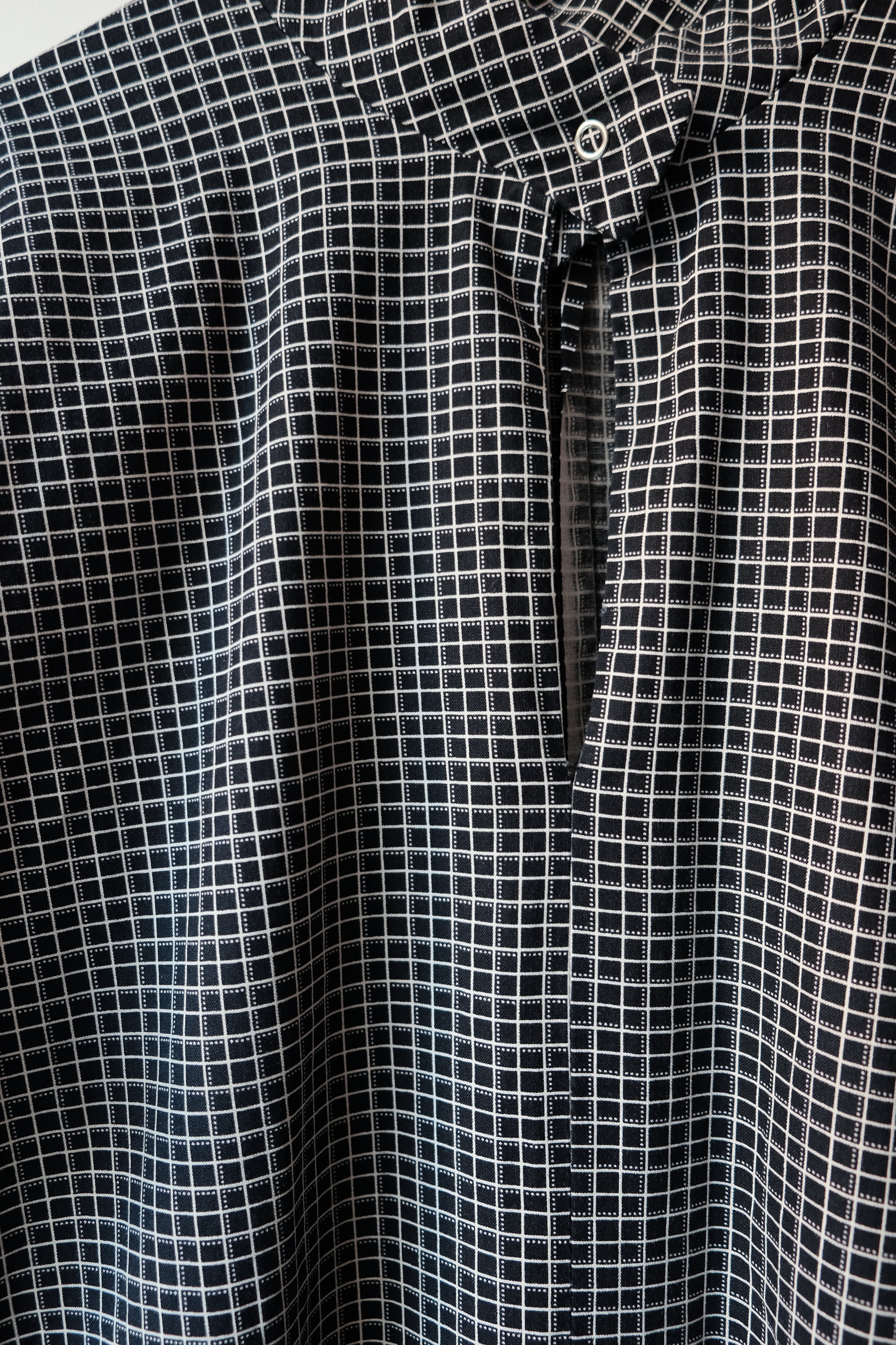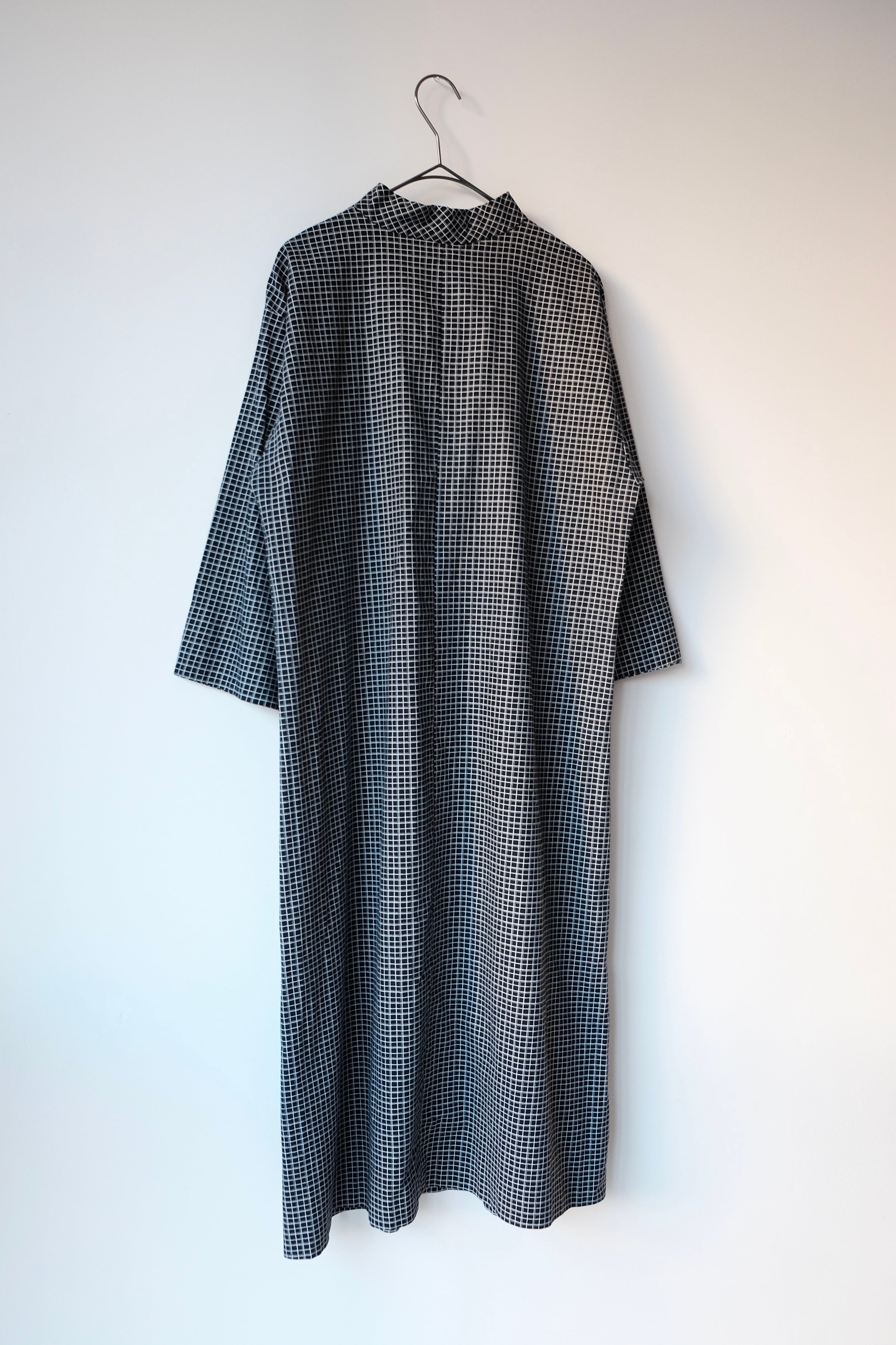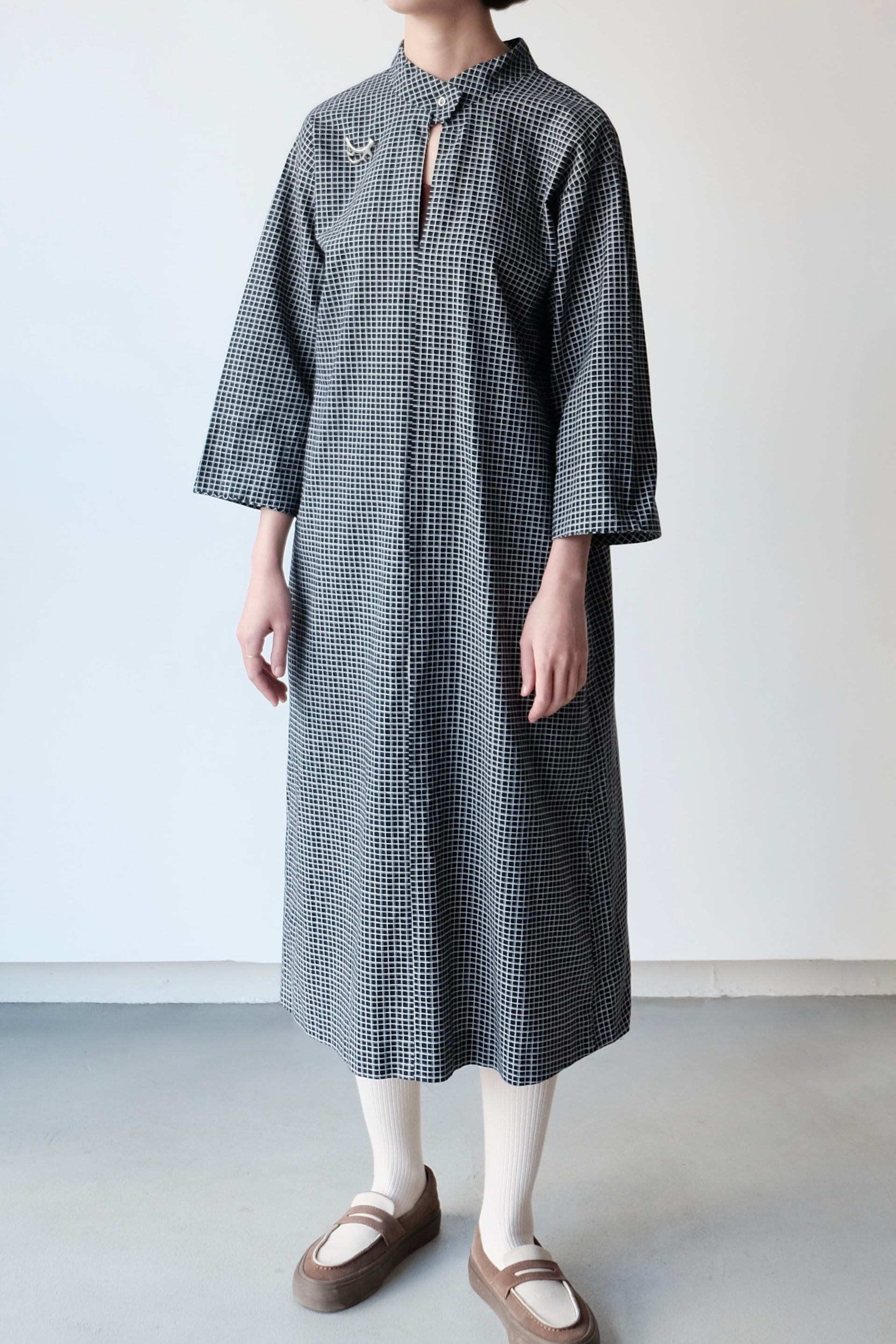 ブラックとホワイトの細かなグラフチェックがシックな印象のミディ丈ドレス。マス目一つひとつの中によく見ると逆L字形に「:」の模様が小さくプリントされた、ユニークで遊び心のあるテキスタイルが見どころの一着です。