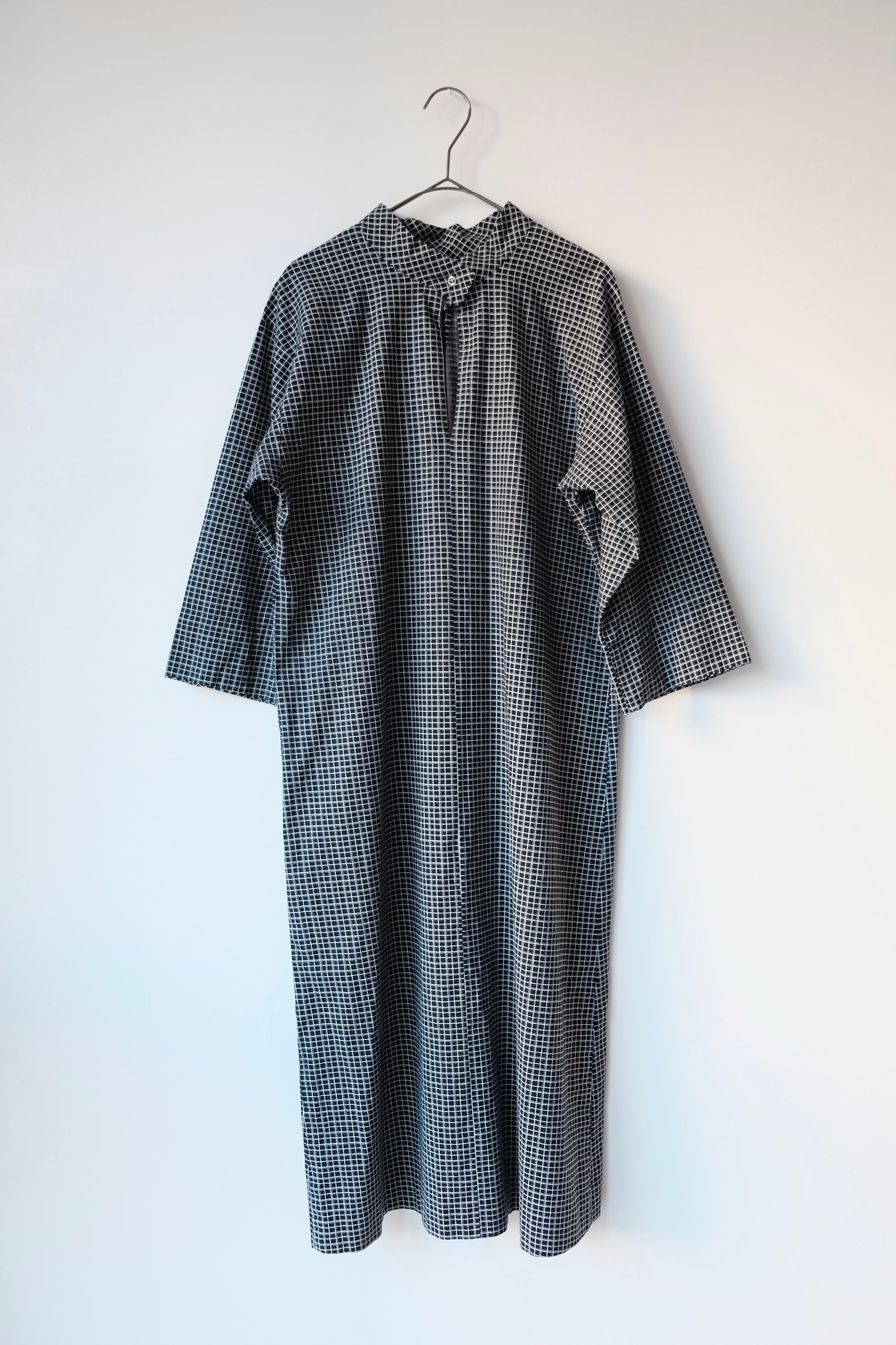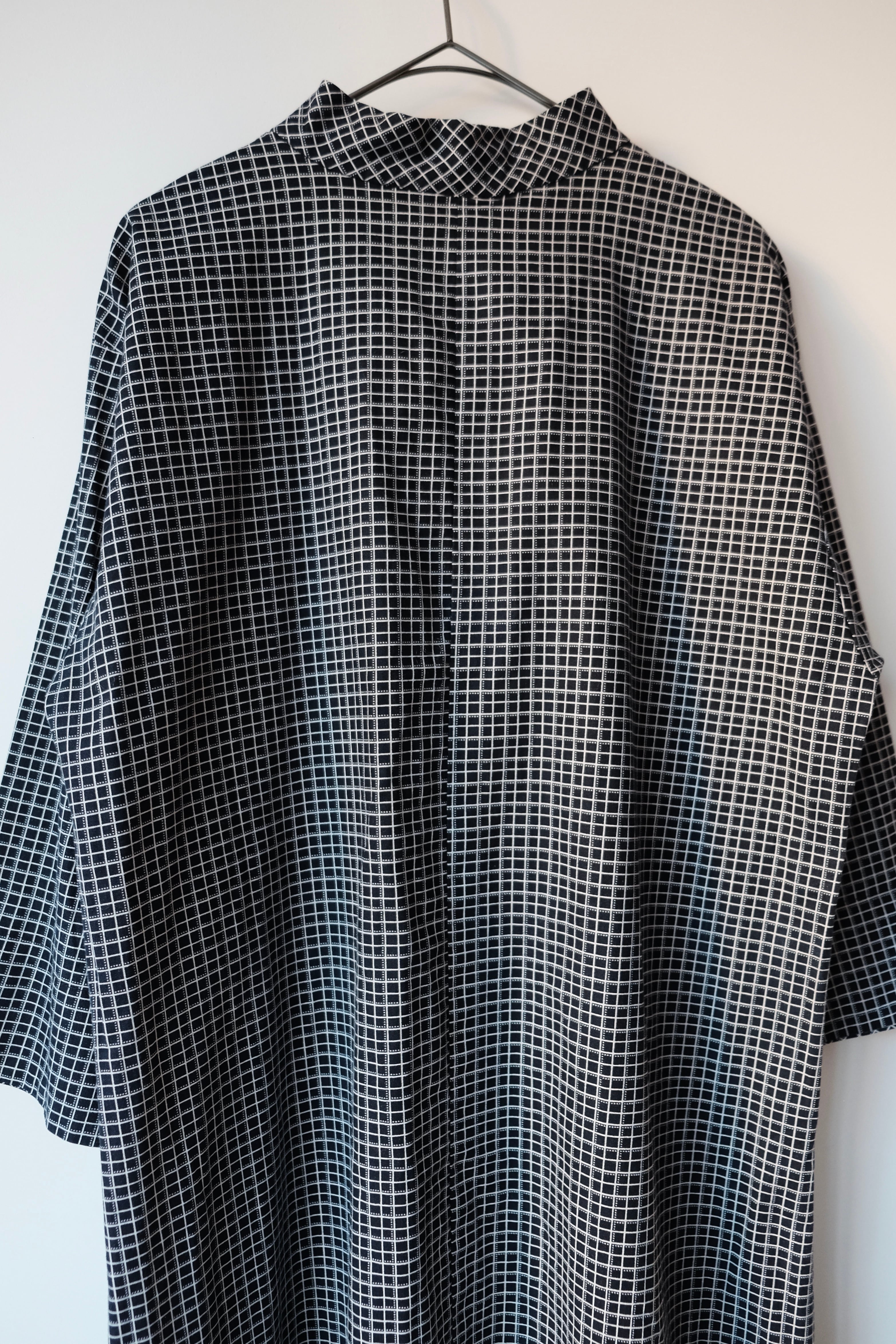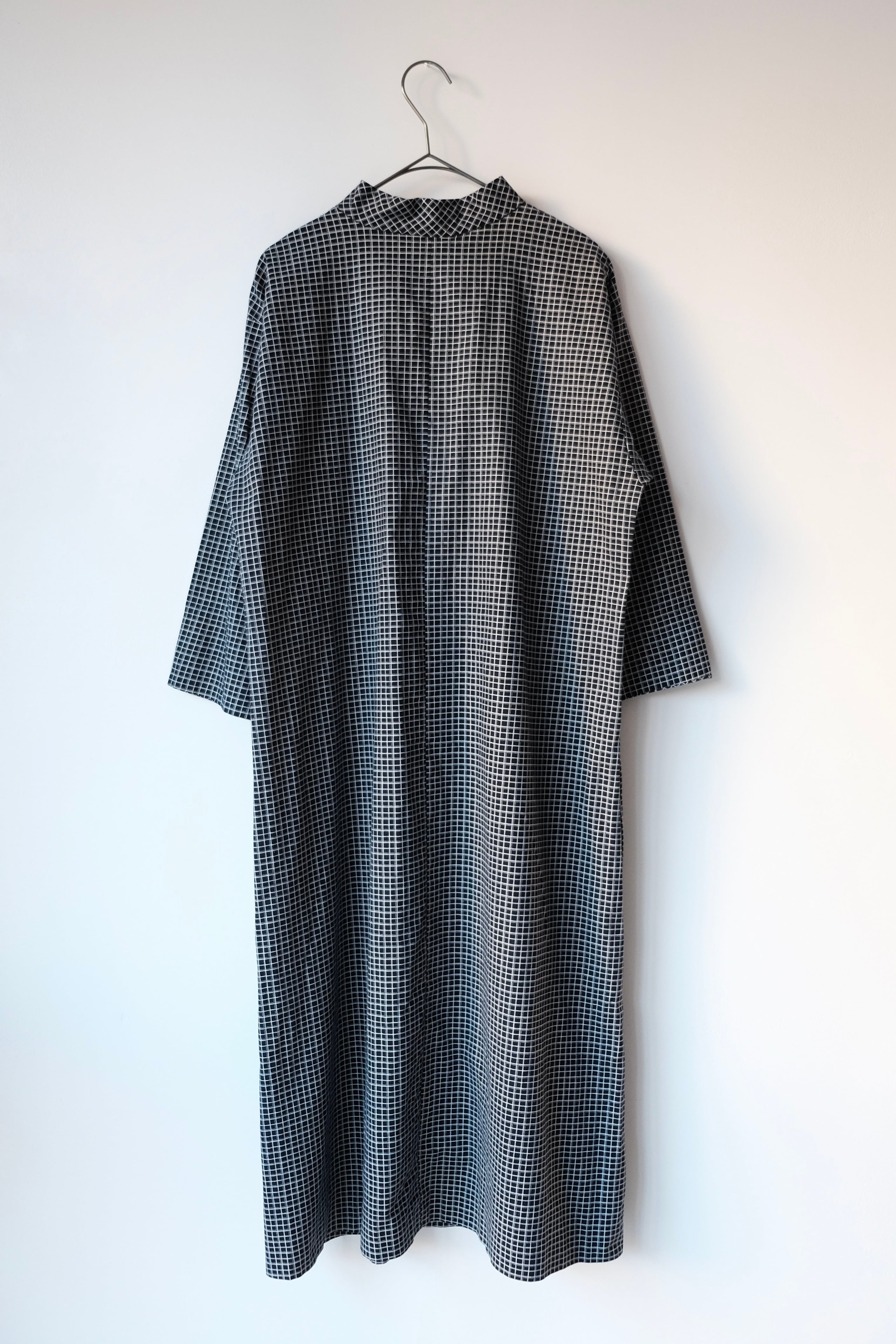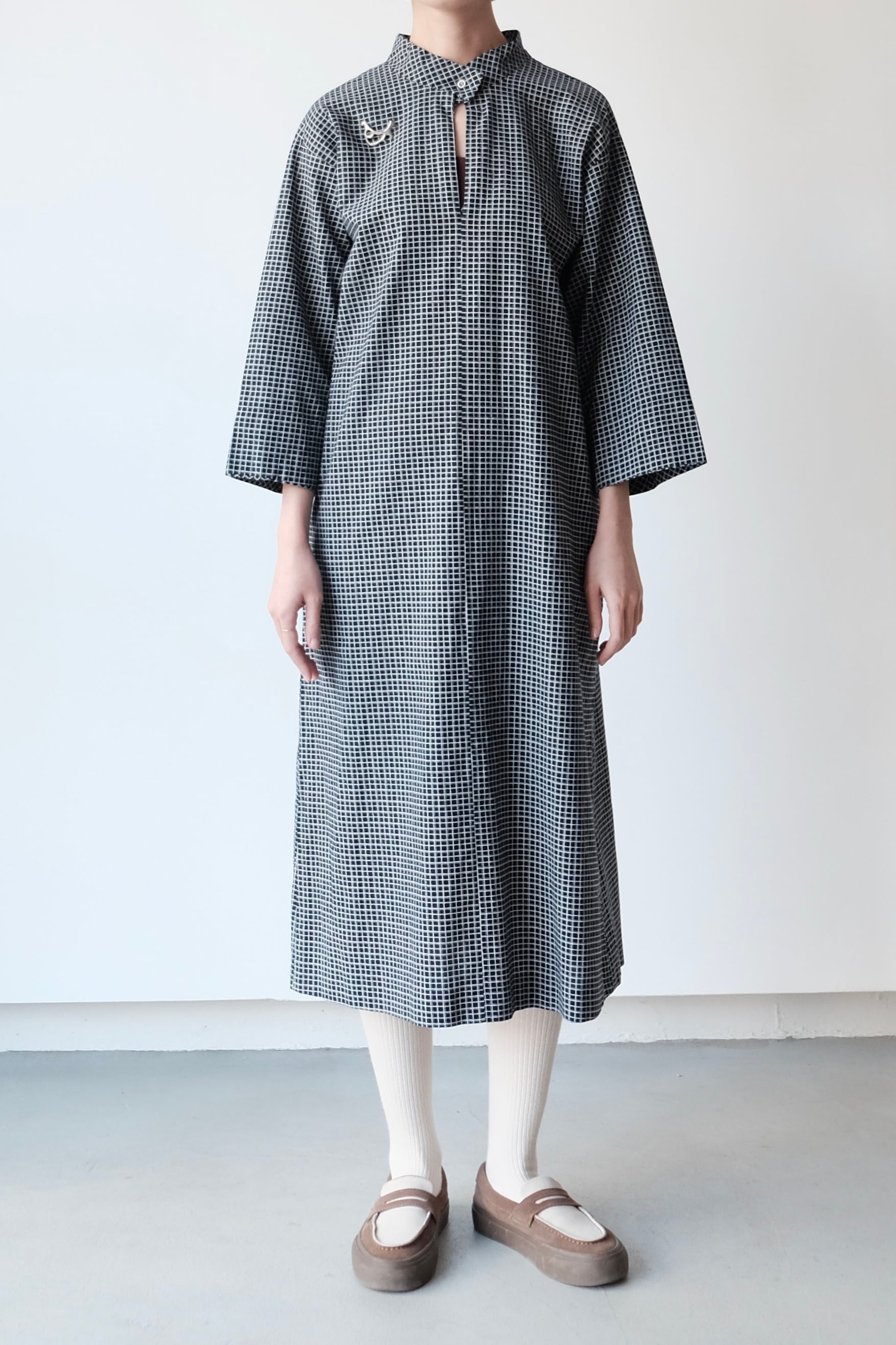 ブラックとホワイトの細かなグラフチェックがシックな印象のミディ丈ドレス。マス目一つひとつの中によく見ると逆L字形に「:」の模様が小さくプリントされた、ユニークで遊び心のあるテキスタイルが見どころの一着です。
