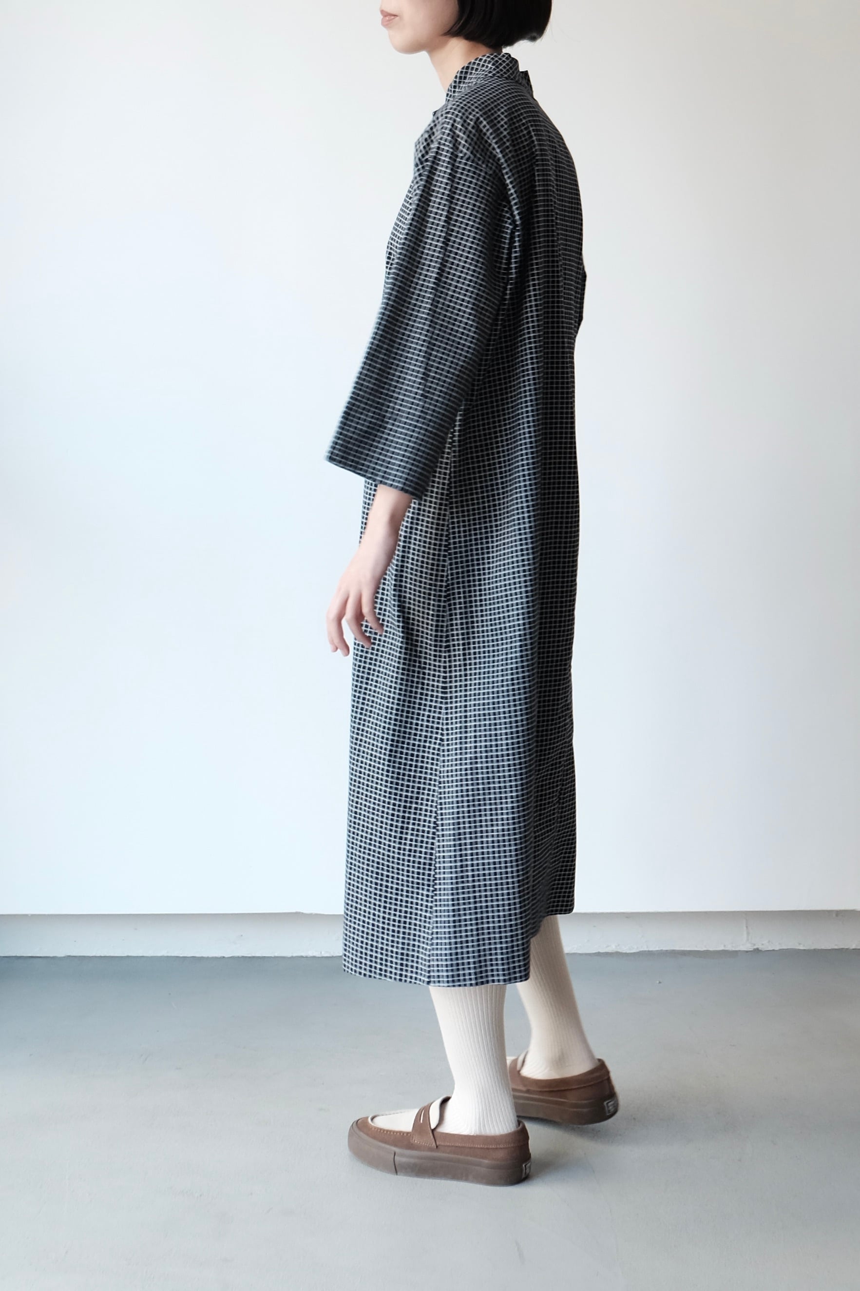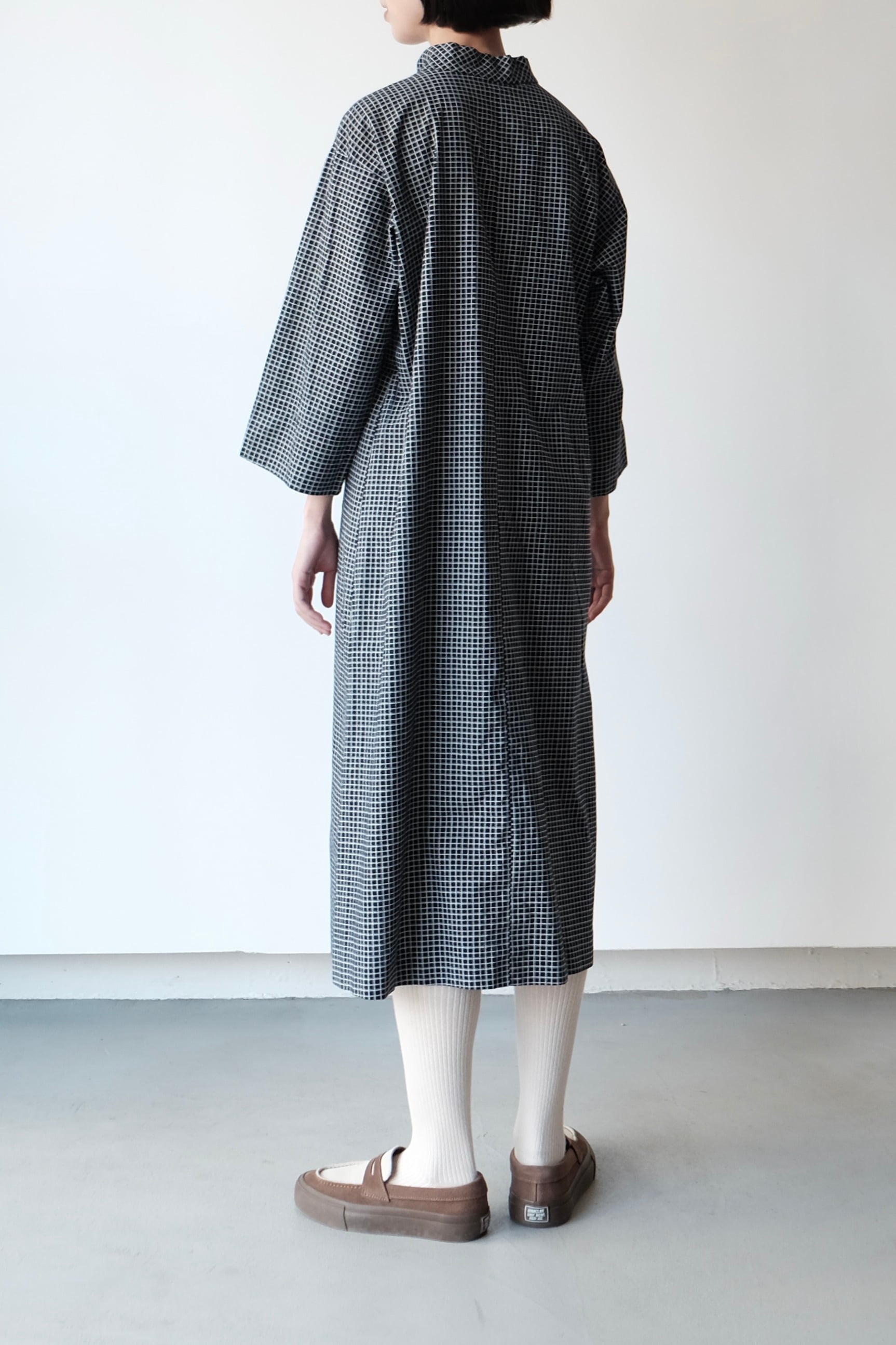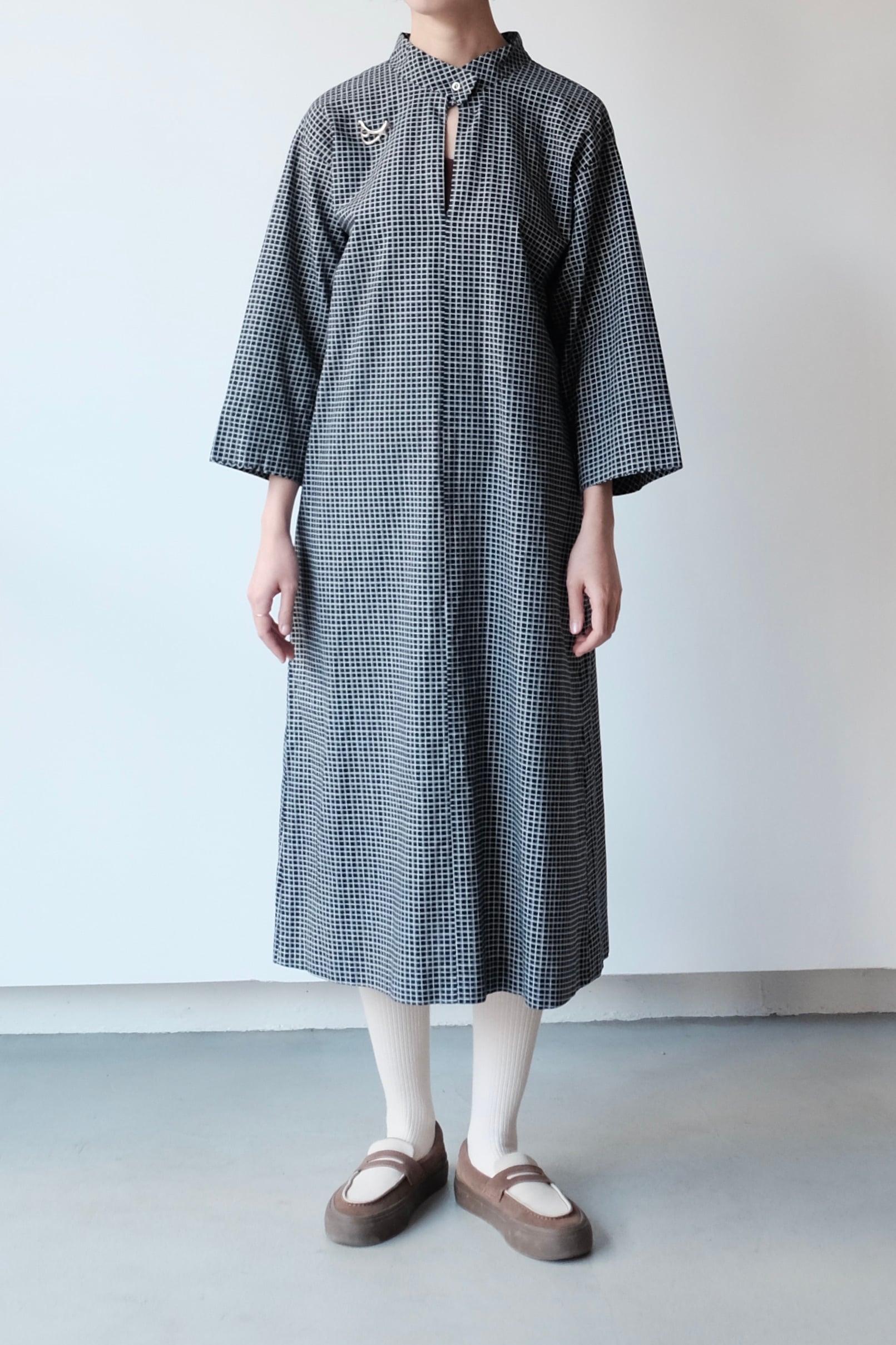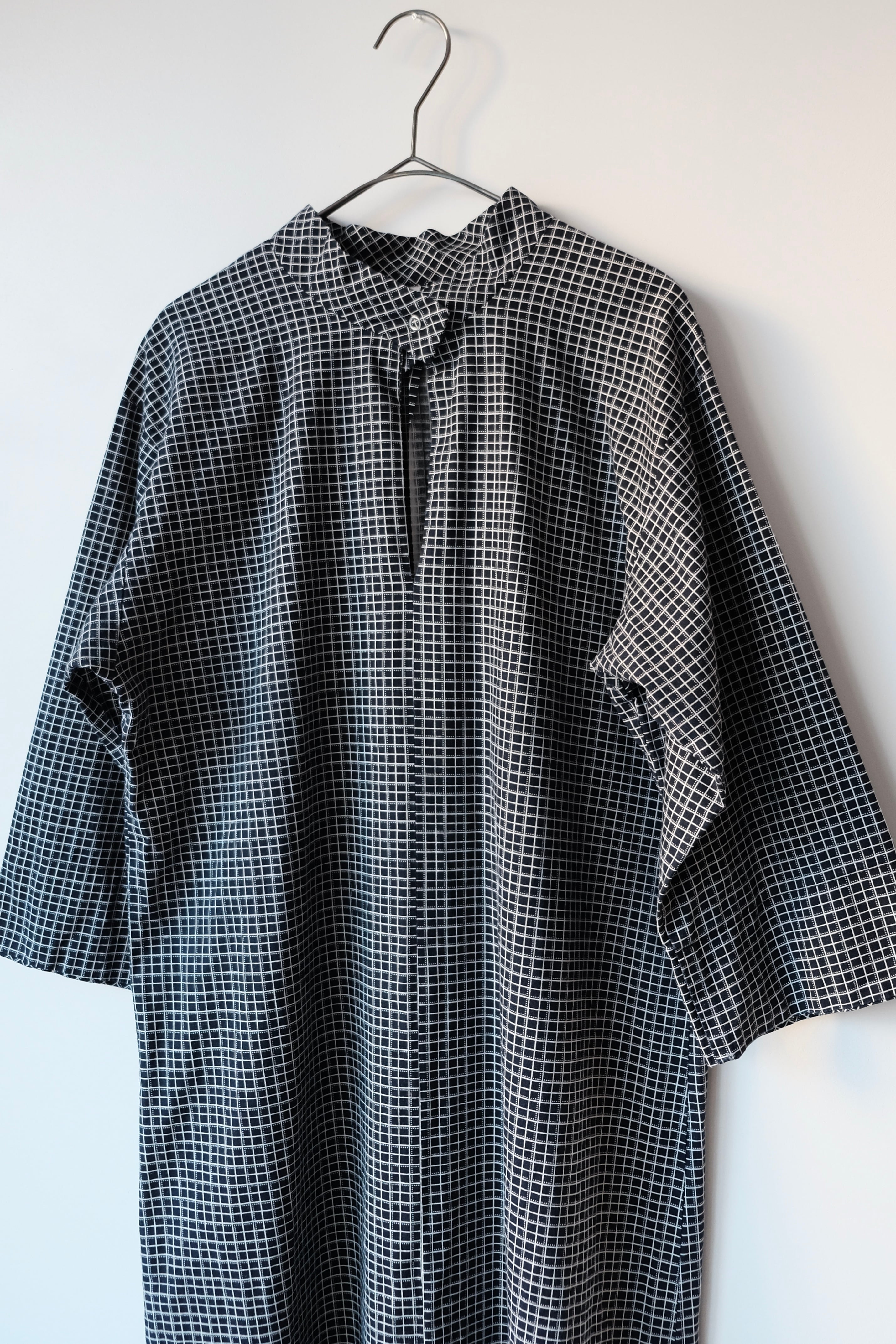 ブラックとホワイトの細かなグラフチェックがシックな印象のミディ丈ドレス。マス目一つひとつの中によく見ると逆L字形に「:」の模様が小さくプリントされた、ユニークで遊び心のあるテキスタイルが見どころの一着です。