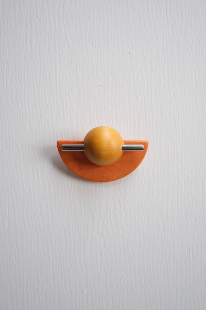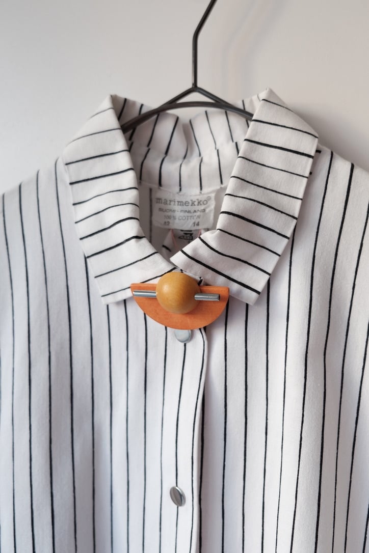 フィンランドの木工ブランド、Aarikka(アーリッカ)のブローチ。半円と球体、シャープなシルバーのバーが、日の入の風景を彷彿させるデザインです。