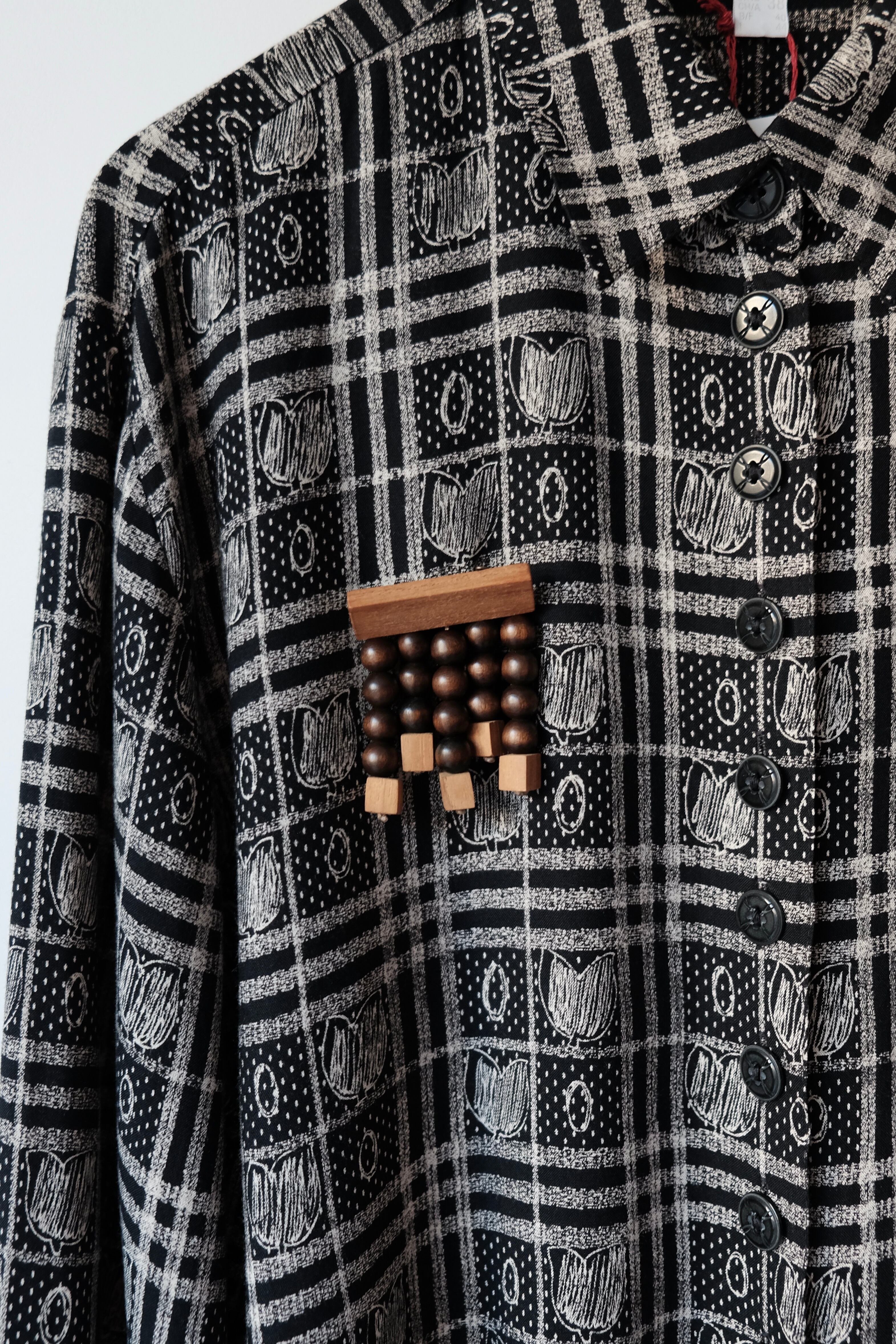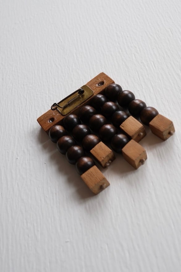 フィンランドの木工ブランド、Aarikka(アーリッカ)のブローチ。ダークブラウンのウッドビーズとスクエアパーツが揺れる、コーディネートに心地よいリズムを生み出します。