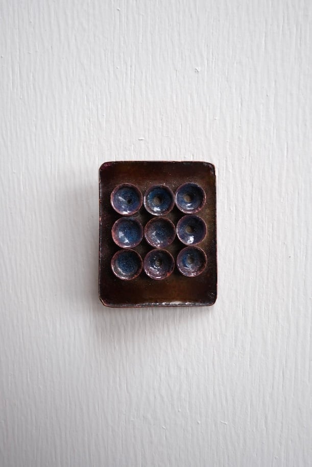 9つの円形のくぼみが並ぶ、ドットレリーフのスクエアタイルブローチ。ヴィンテージタイルのような風合いで陶磁器のようにも見えますが、おそらく金属製だと思われます。