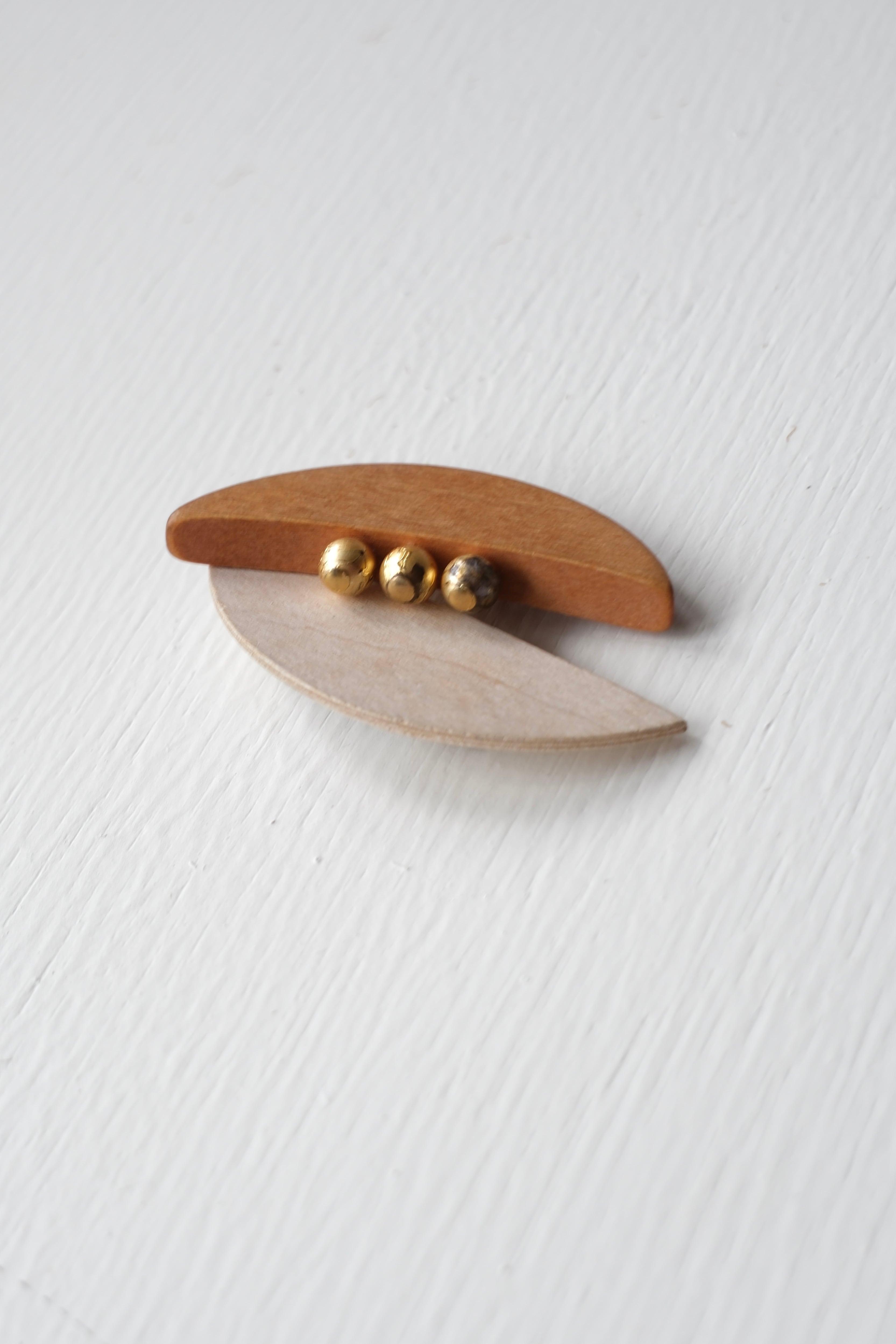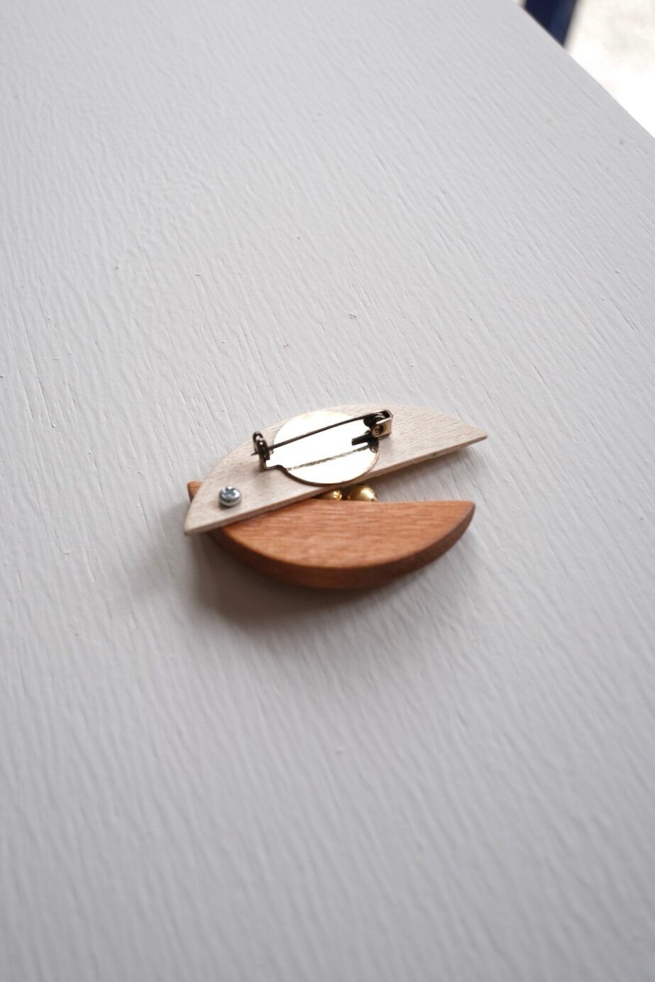 フィンランドの木工ブランド、Aarikka(アーリッカ)のブローチ。木材と金色のビーズを組み合わせで、素材合わせ、対比の妙を楽しむデザイン。月と惑星を思わせる小宇宙のようにも、見方によって花のようにも捉えられます。