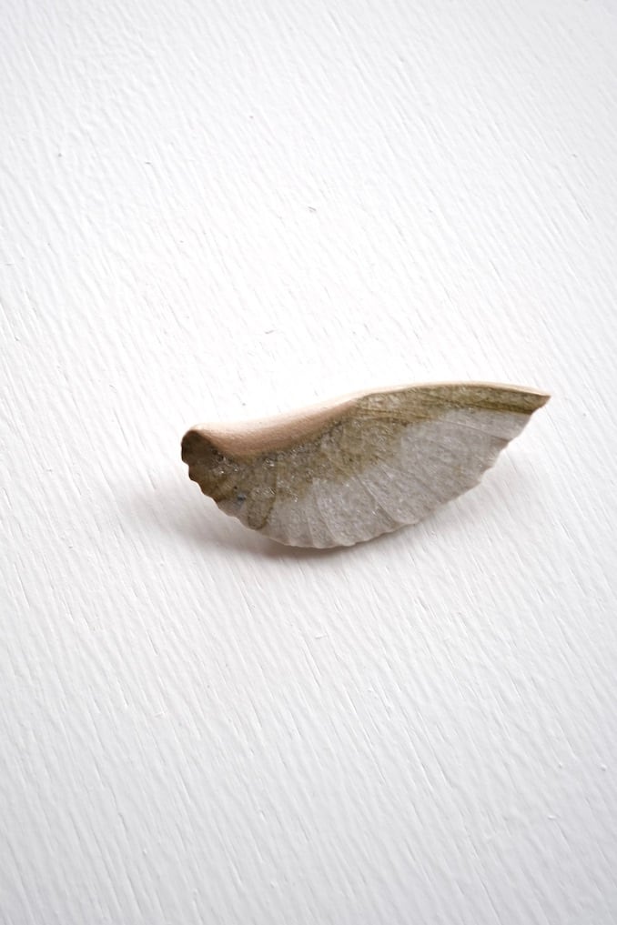 鳥の翼をモチーフにした陶磁器製のブローチ。こちらは裏に作り手のサインが入った、ハンドメイドのアイテムです。