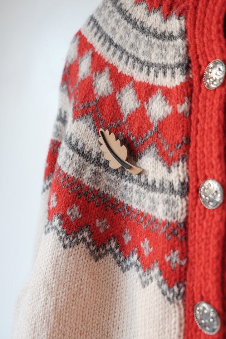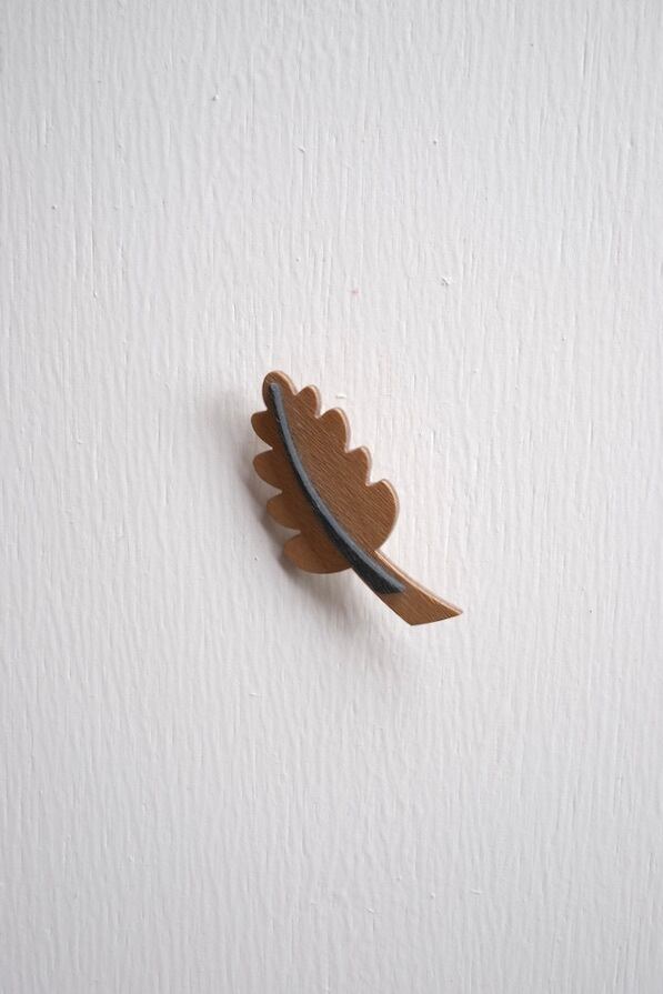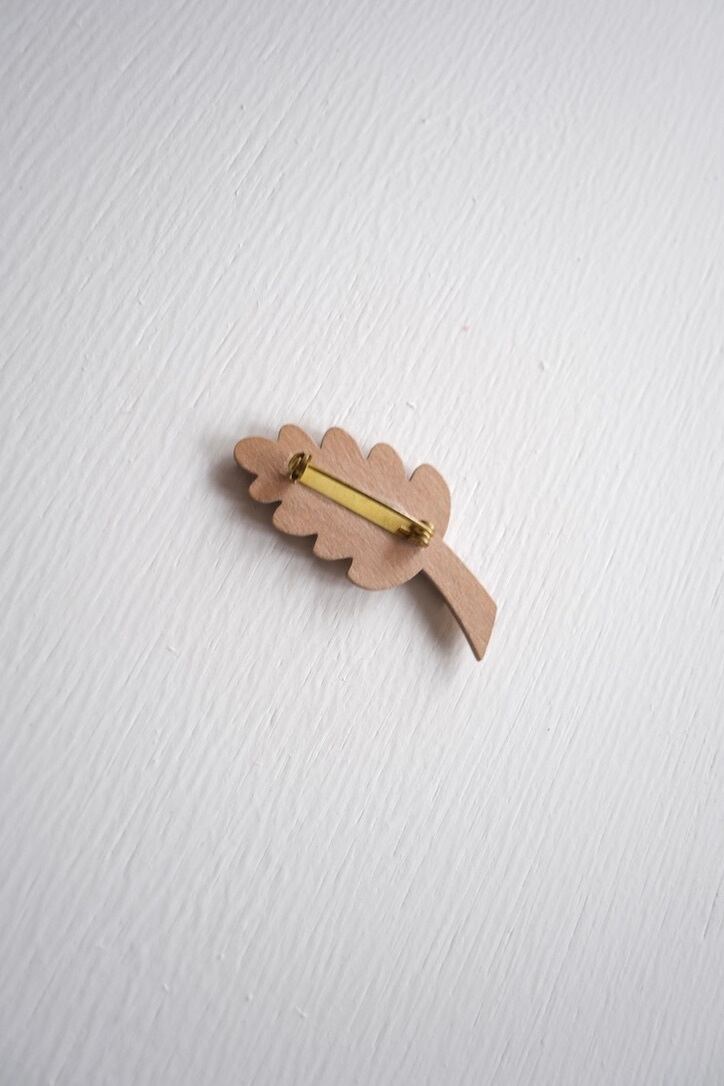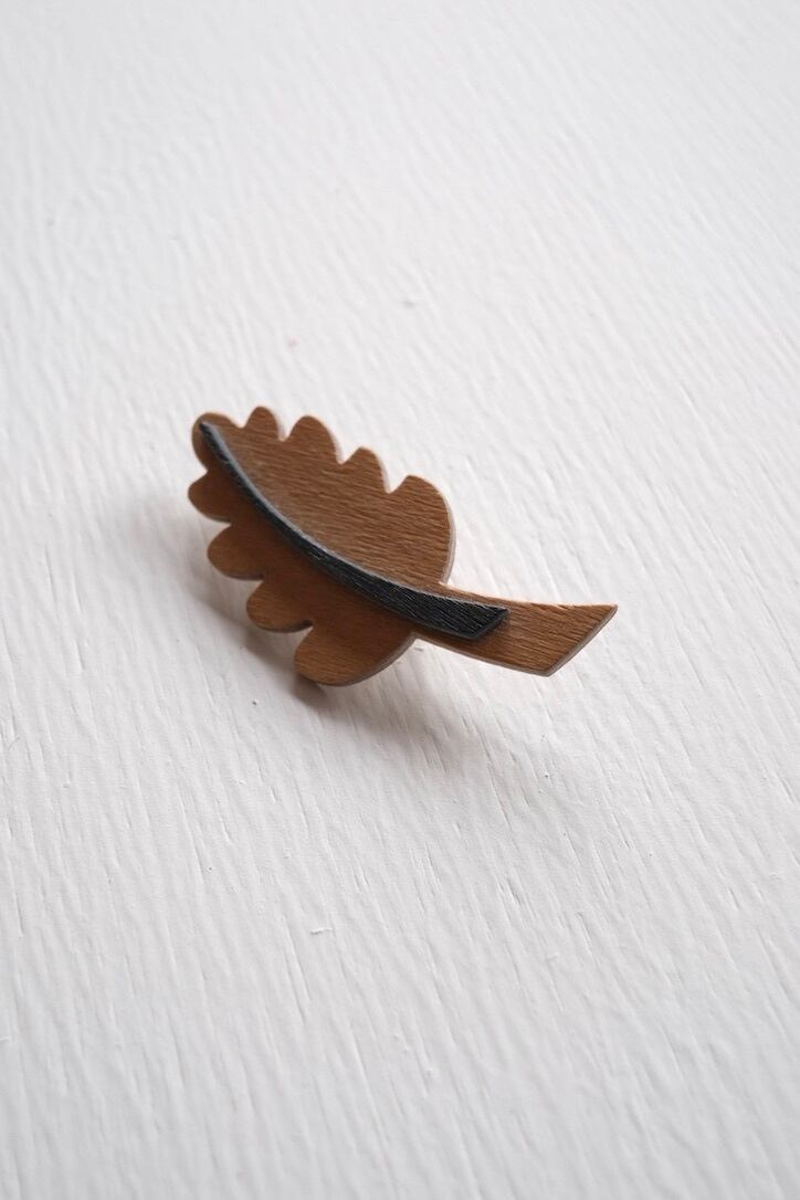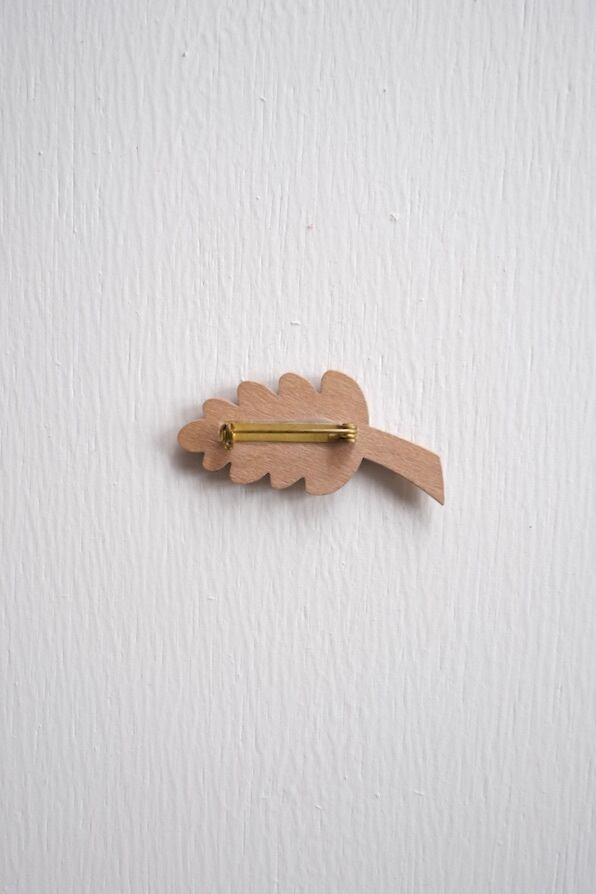 フィンランドの木工ブランド、Aarikka(アーリッカ)のブローチ。丸みのあるカッティングが愛らしい、オークの葉の形をしています。