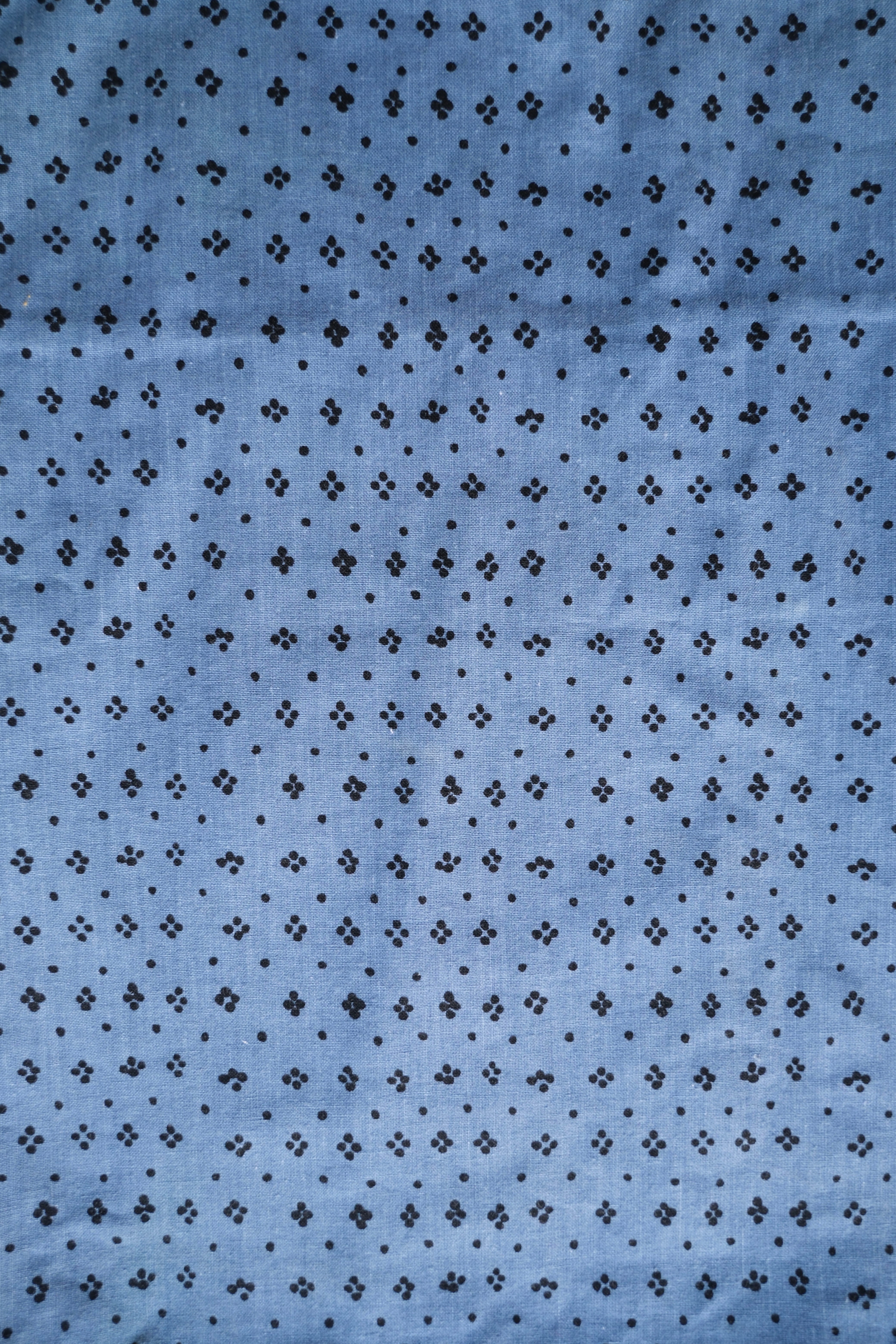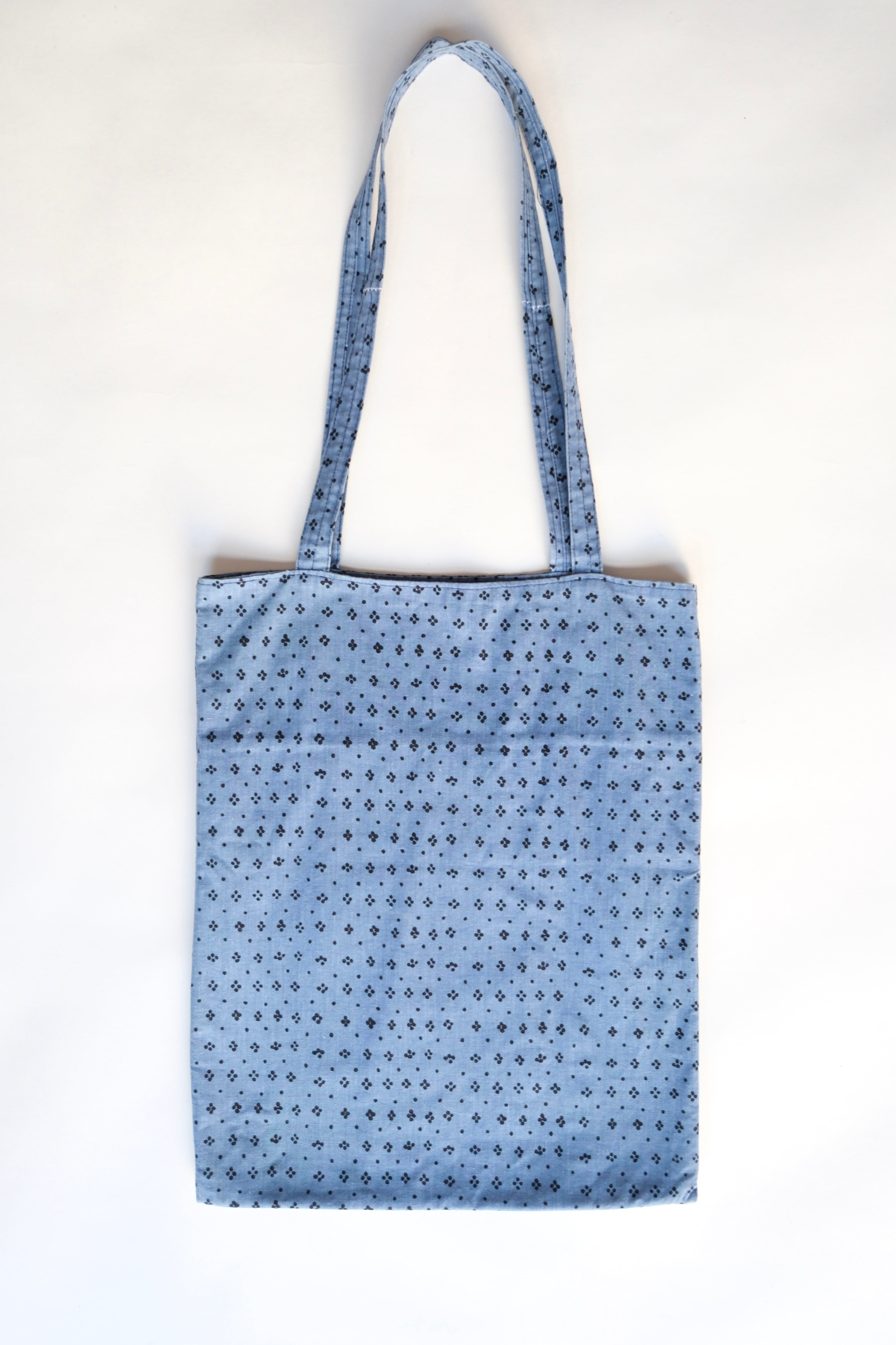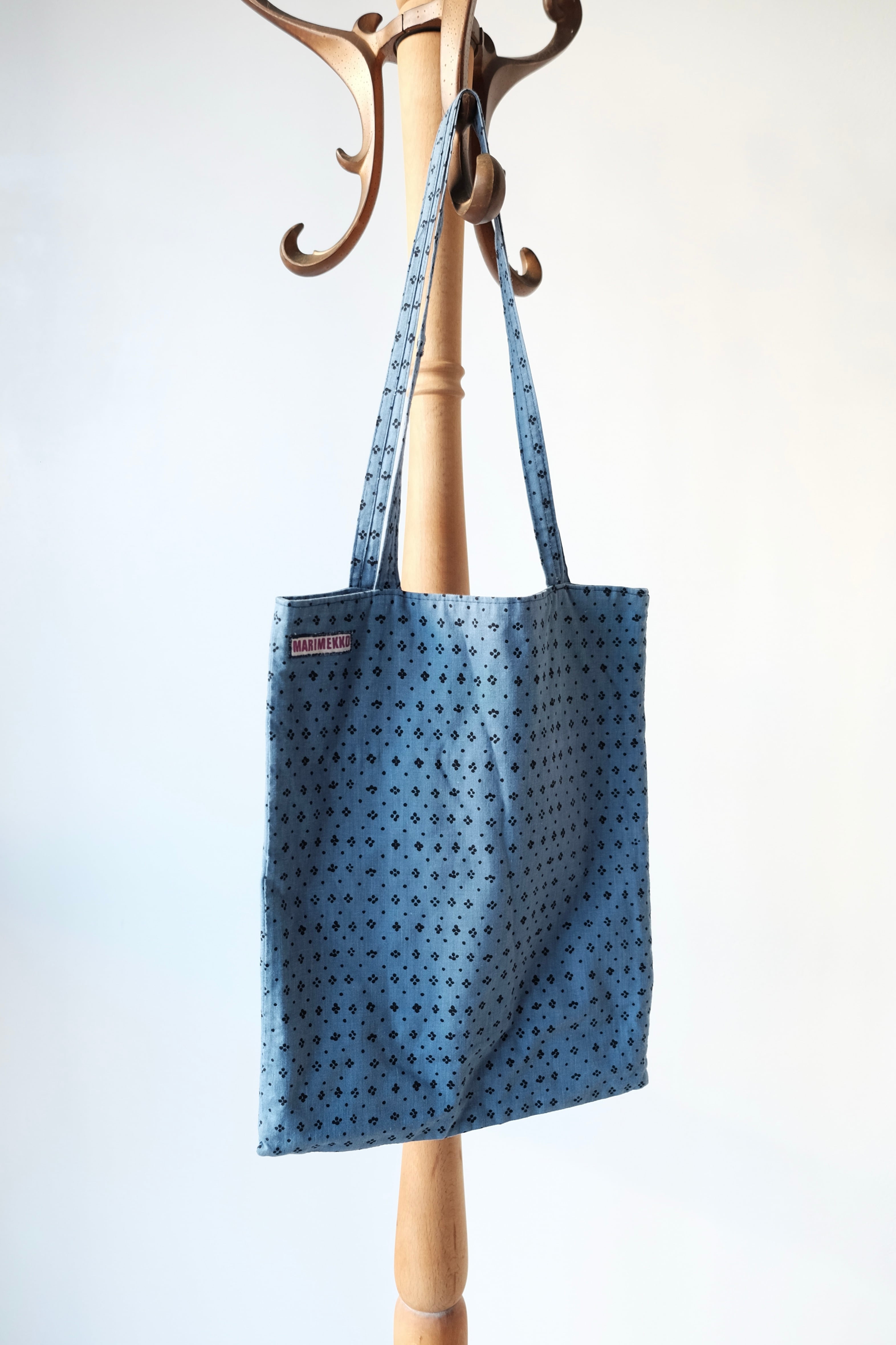 くすみのあるコバルトブルーに、小さなドットがプリントされたコットン素材のトートバッグ。フィンランドで買付けしたもので、マリメッコの「Muija(フィンランド語で女性の意味)」柄の生地で作られたハンドメイドのお品です。