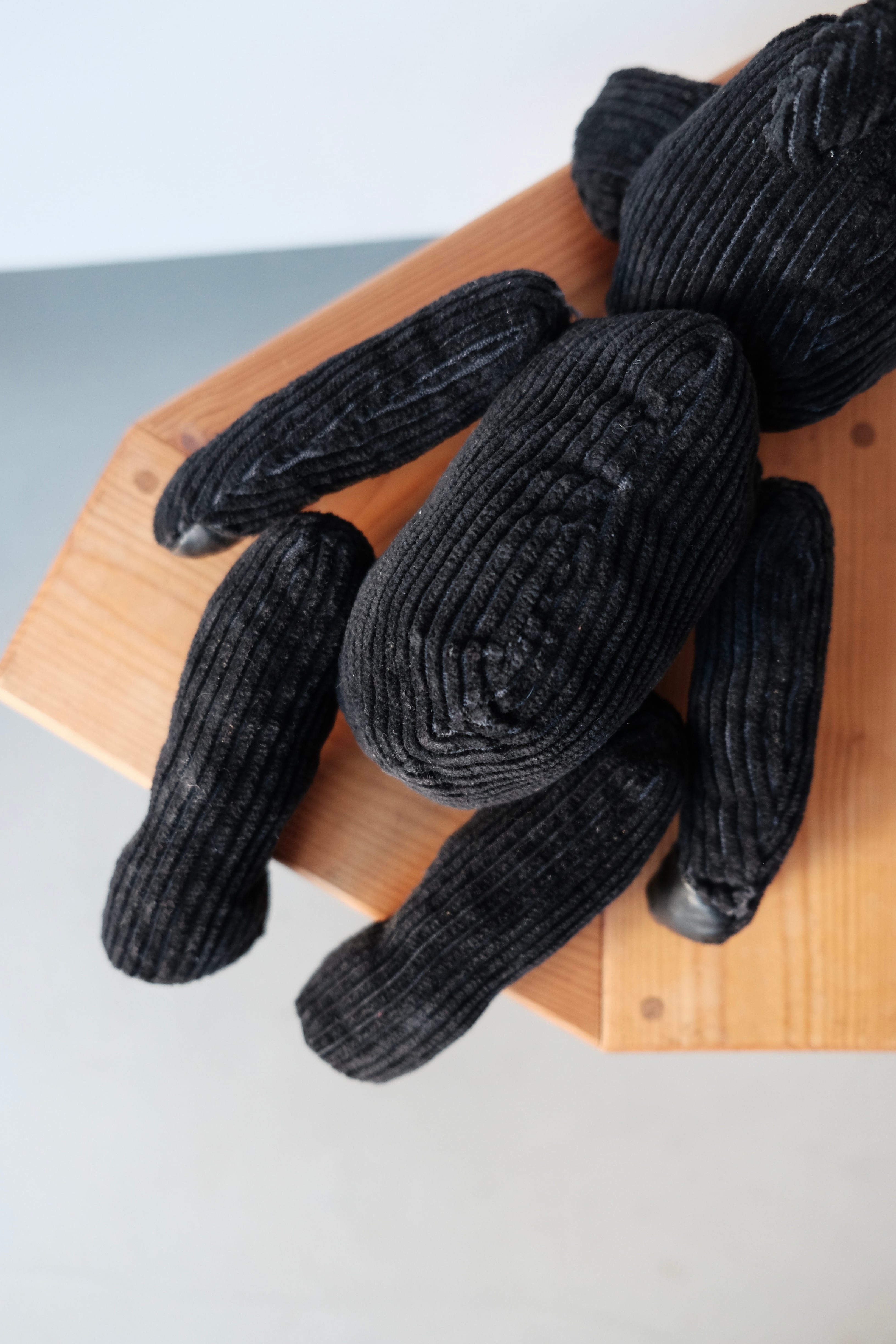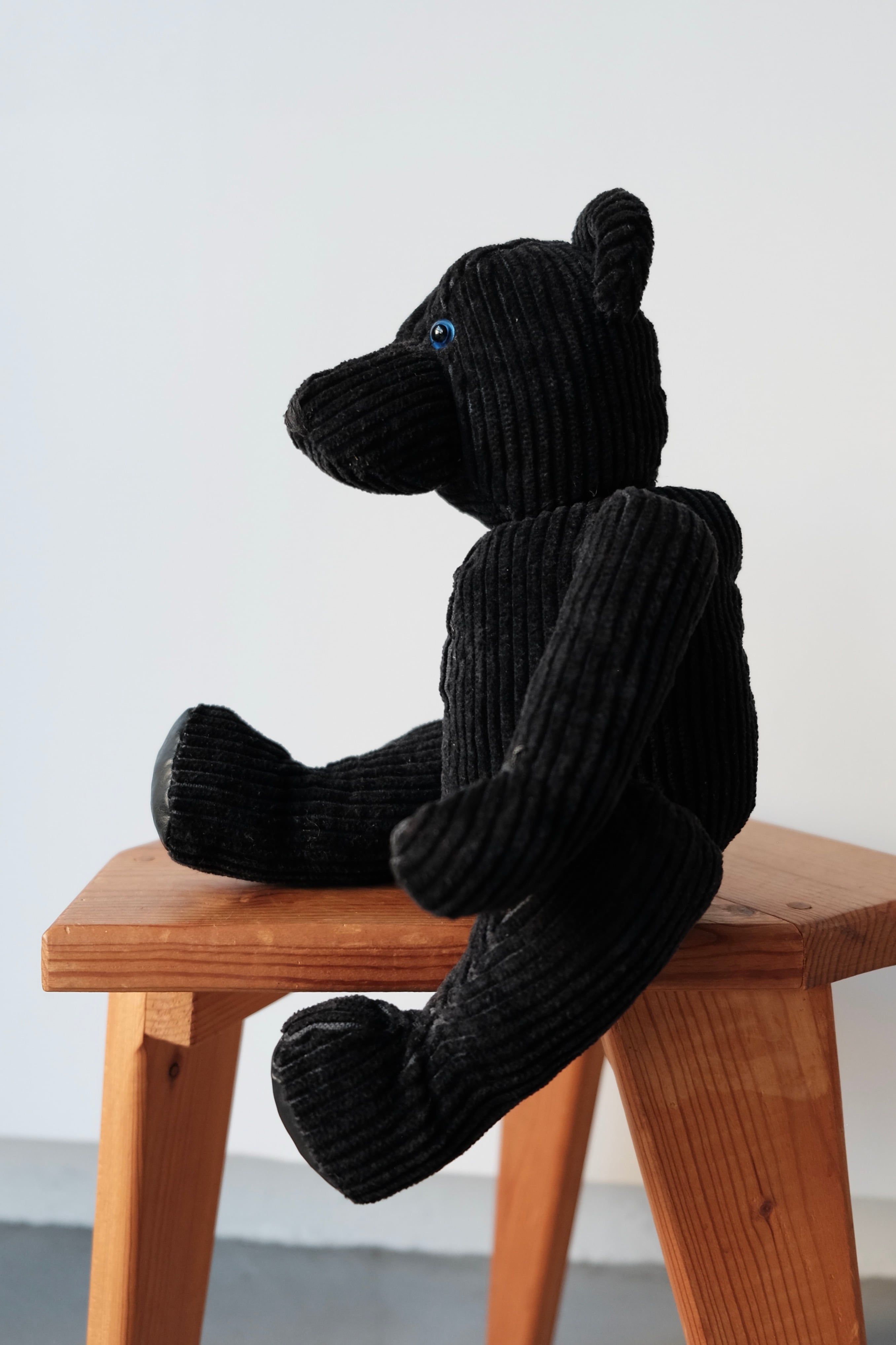 フィンランド現地で譲っていただいた際に聞いた話では、こちらは現地の人形作家によるものだそう。深く艶やかなコーデュロイの畝(うね)が作る美しい陰影が、ベアのフォルムに独特の立体感とモダンな雰囲気を与えています。