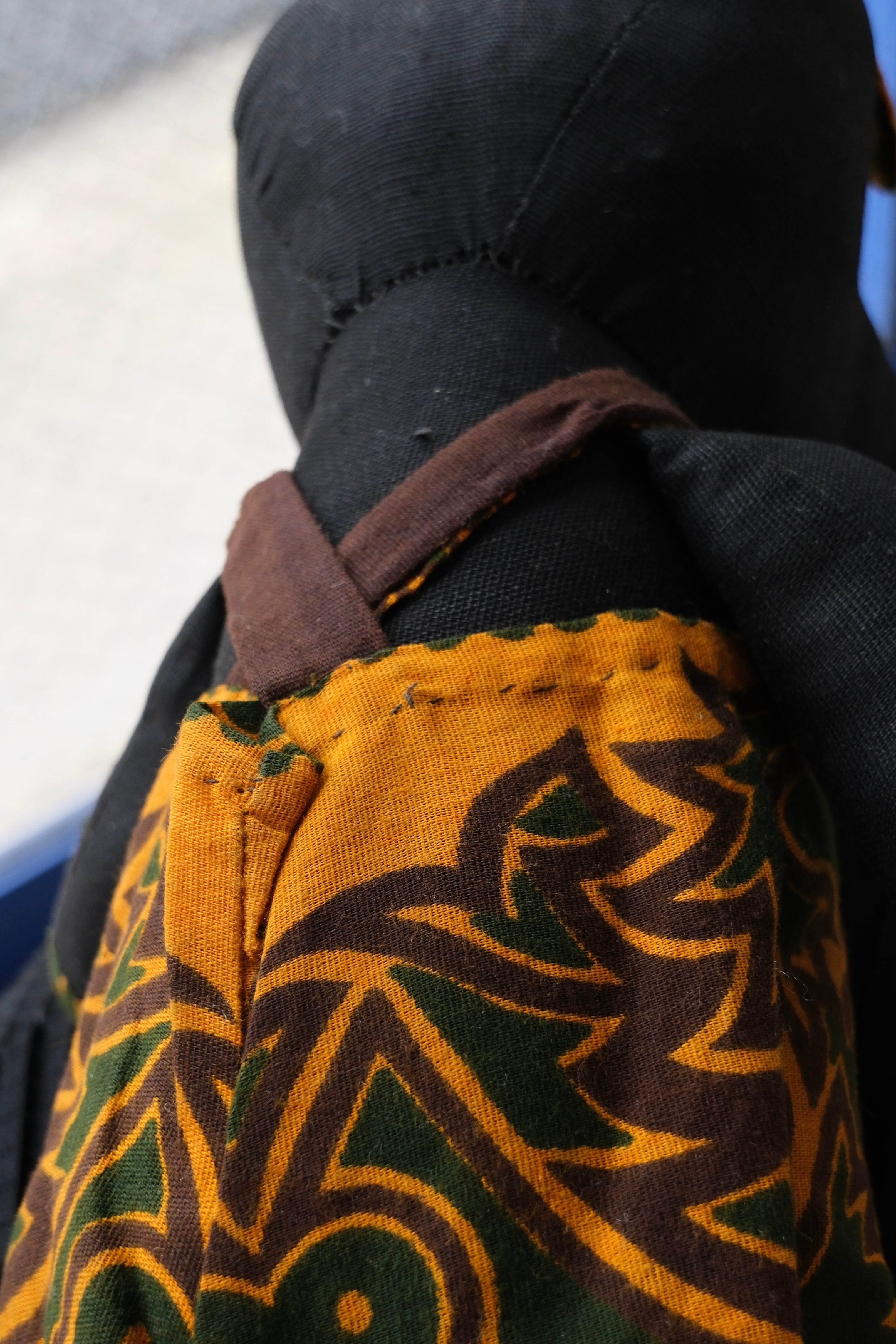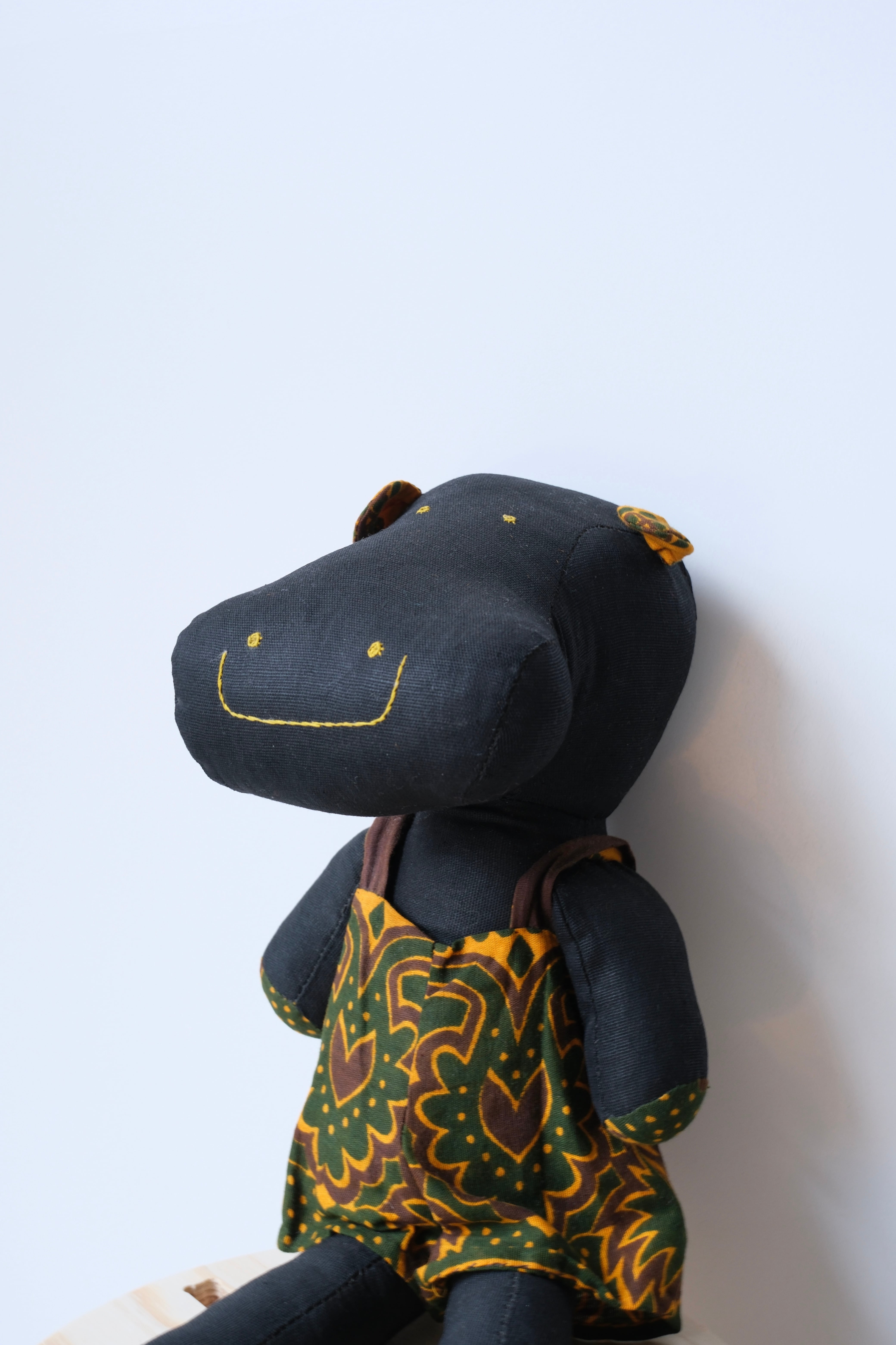 ブラックのボディに、アフリカンプリントをサロペット、耳、手、足裏にポイントで配したデザイン。イエローの糸で一針ずつ手刺繍された愛らしすぎる顔と表情に、たまらない魅力と親しみやすさを感じます。