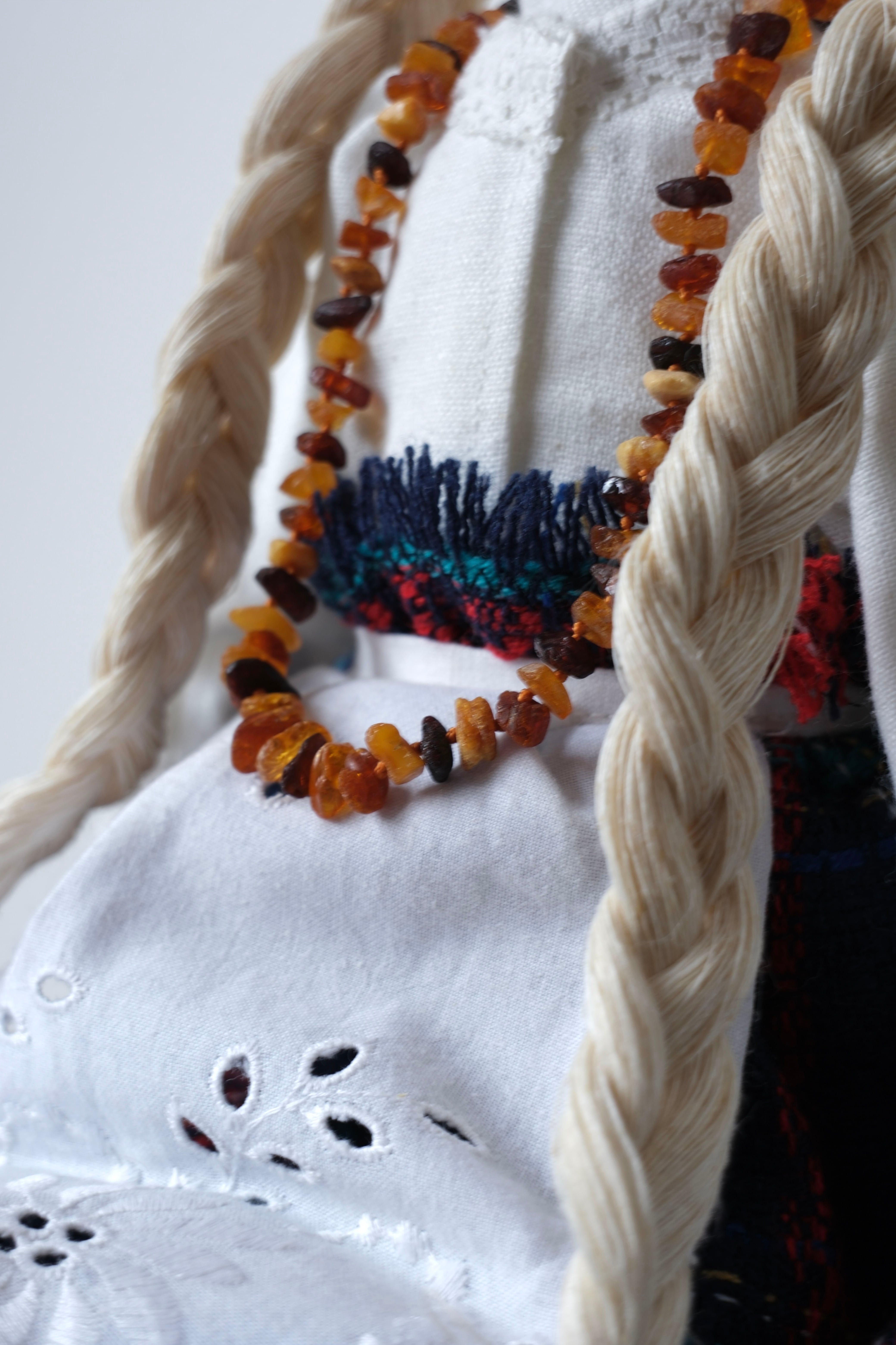 首元を飾るのはアンバーで繋いだネックレス。長いブロンドの三つ編み、ボディと衣装にはそれぞれリトアニア特産の上質なリネンが使われています。アンダーウェアなど見えないところまでていねいに作り込まれていて、作り手の愛が伝わるようです。