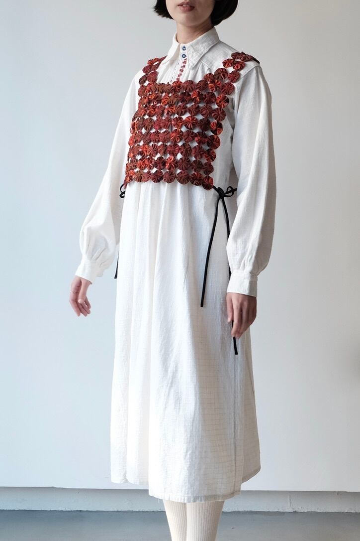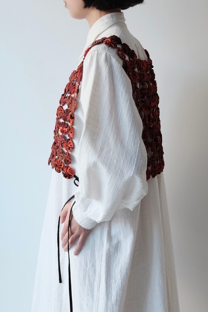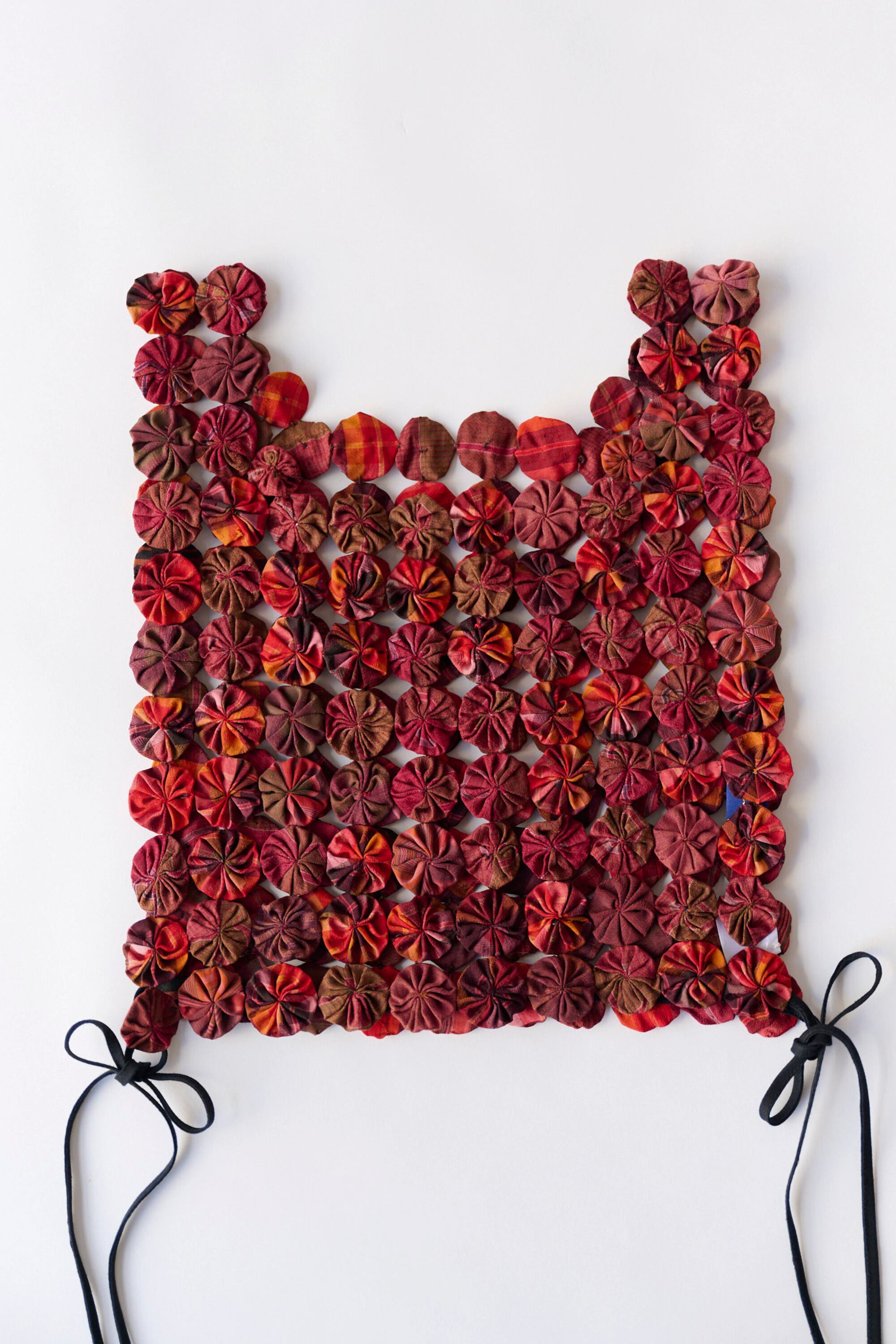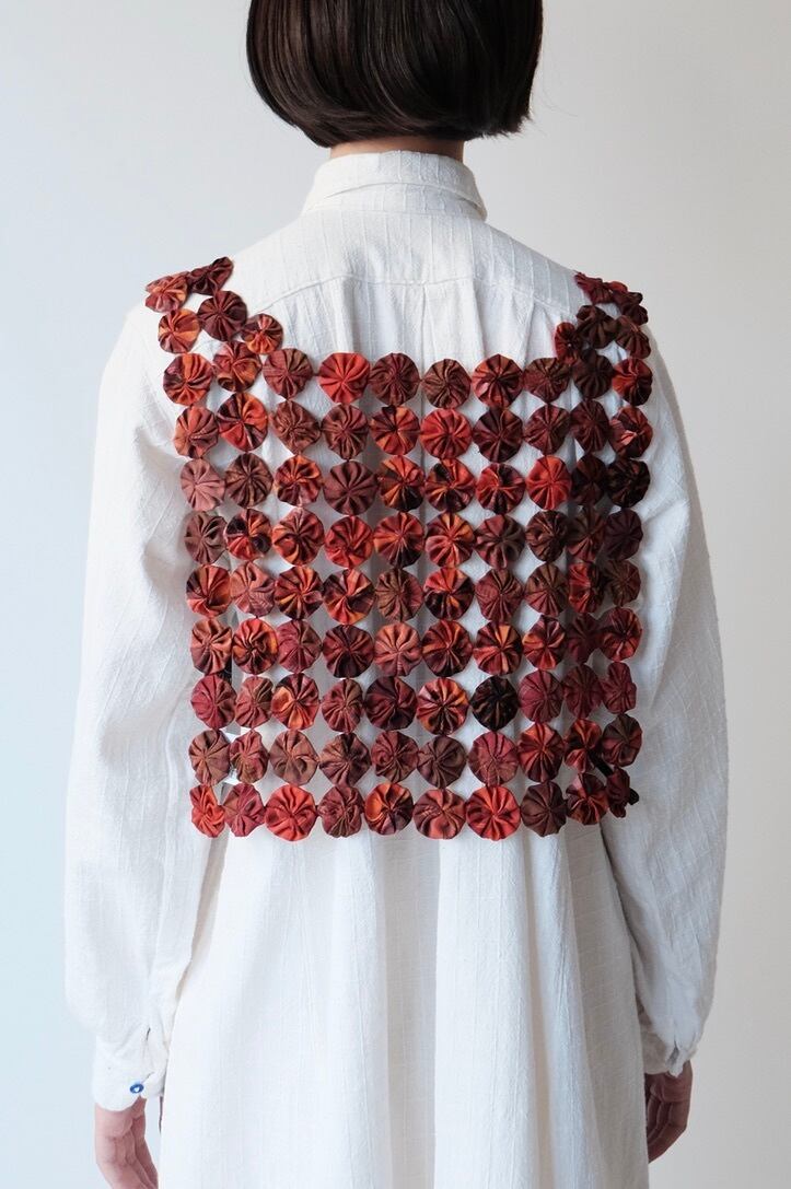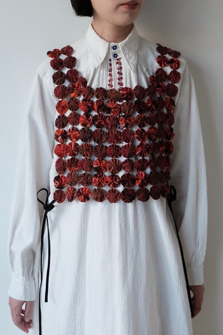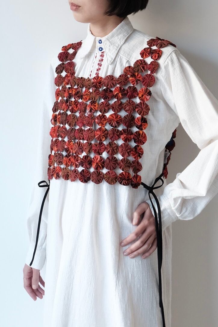 円形に小さくカットした生地を縫い縮め、それをつなぎ合わせて一枚のキルトを形作るYo-yoのスタイル。主にアメリカで盛んなyo-yoの技法ですが、以前の北欧買い付けで珍しく出会うことができたヨーヨーキルトを、こちらのベストの素材として使用しました。