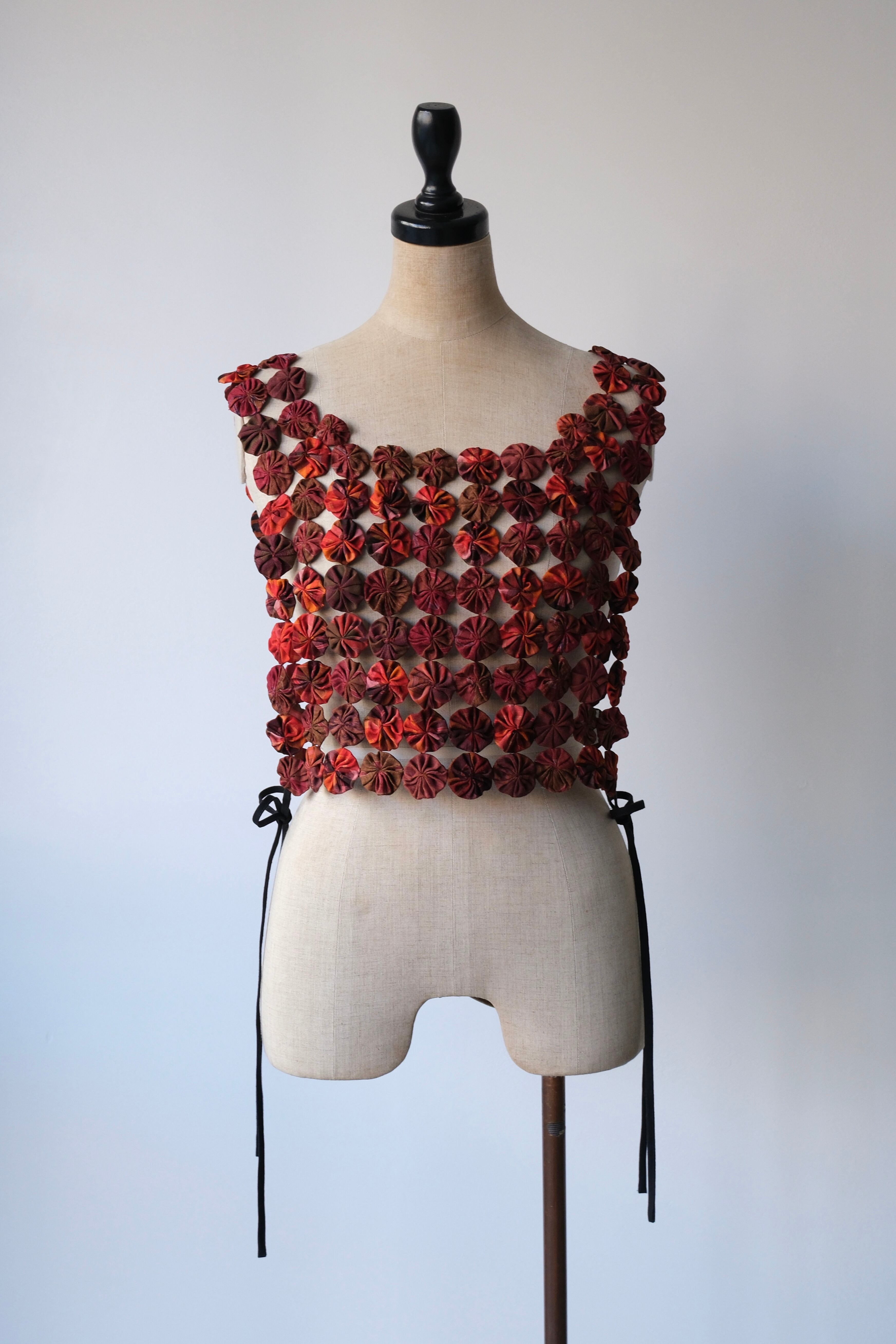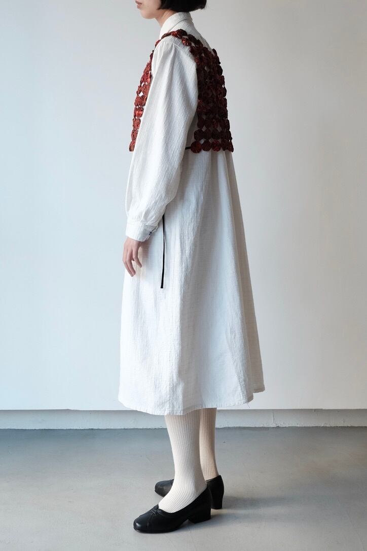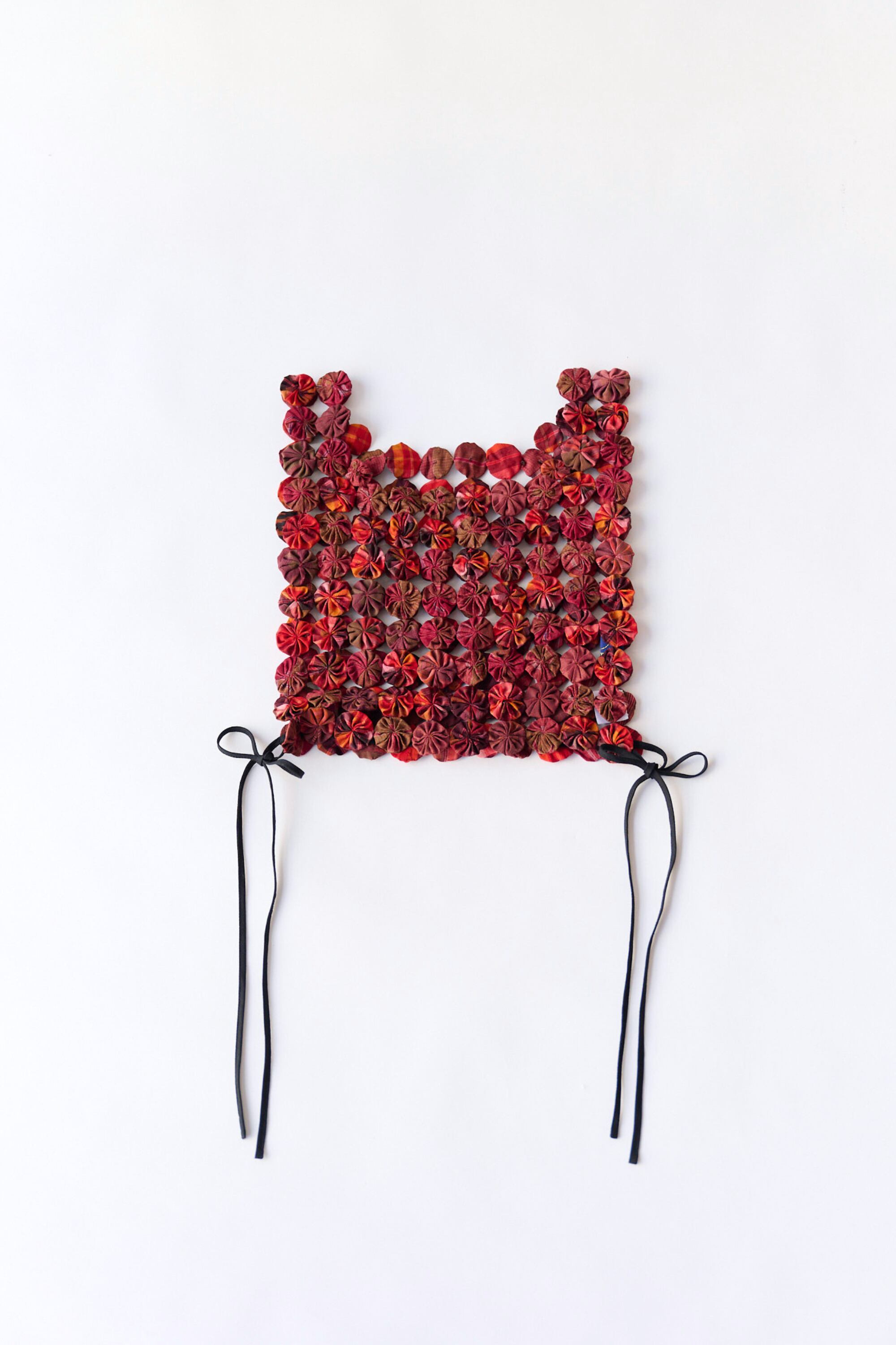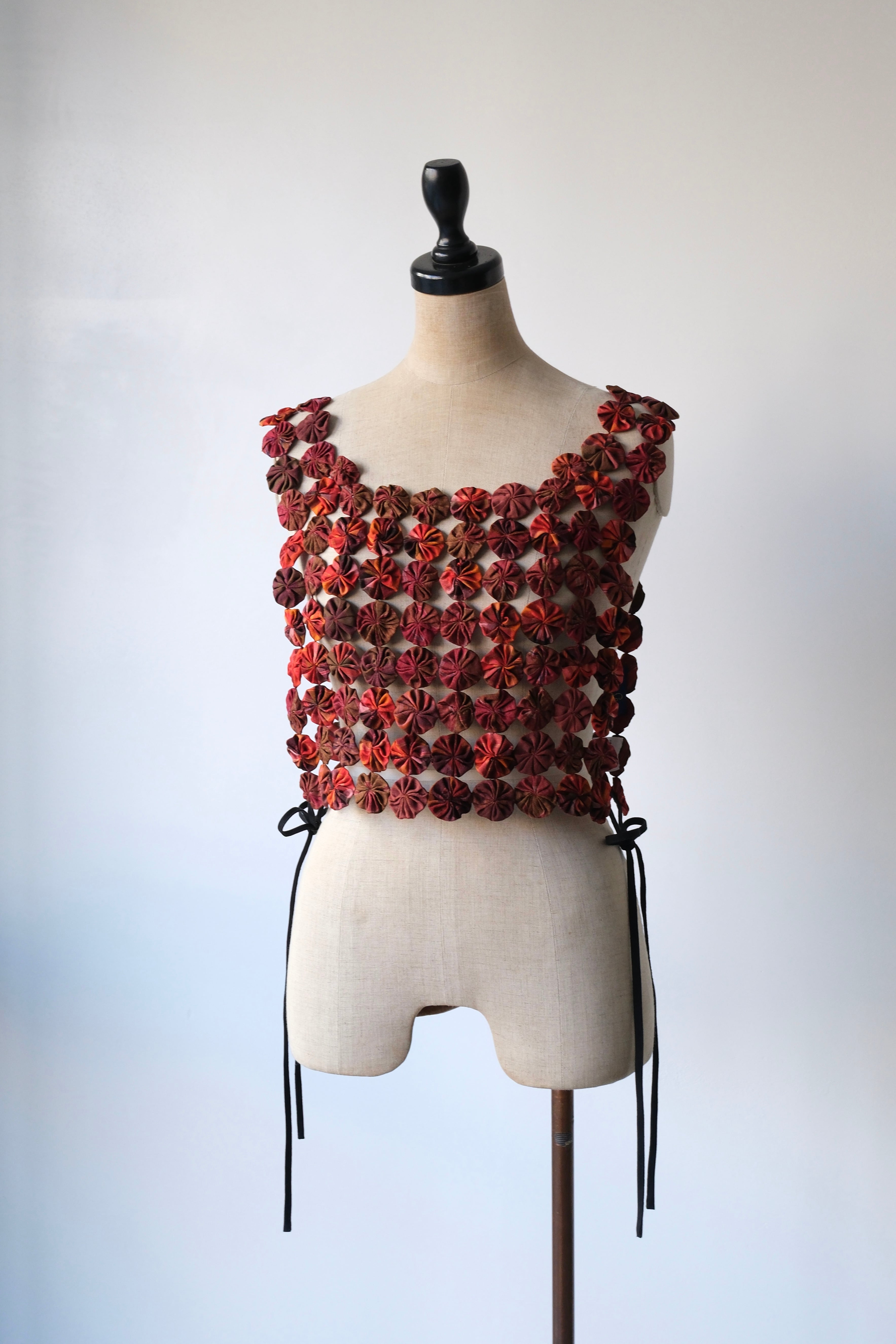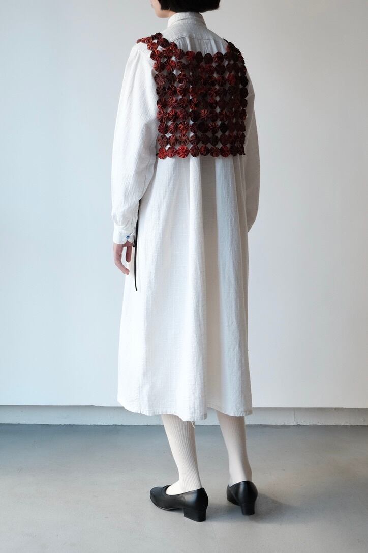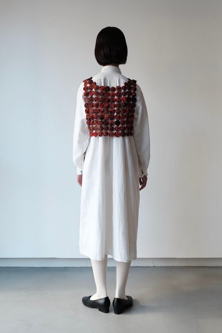円形に小さくカットした生地を縫い縮め、それをつなぎ合わせて一枚のキルトを形作るYo-yoのスタイル。主にアメリカで盛んなyo-yoの技法ですが、以前の北欧買い付けで珍しく出会うことができたヨーヨーキルトを、こちらのベストの素材として使用しました。