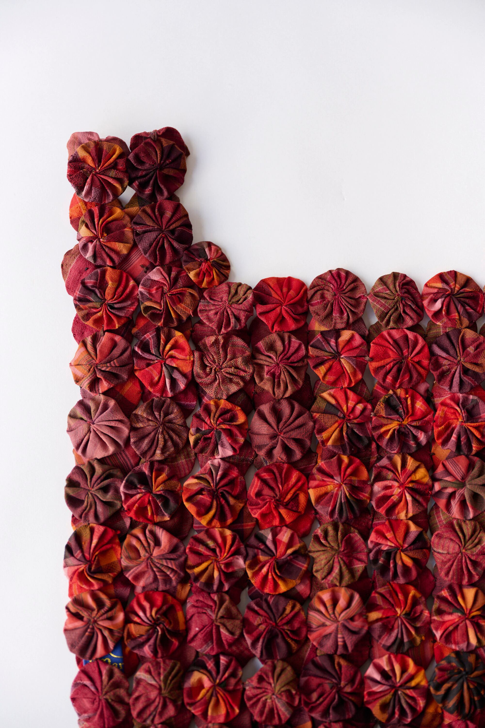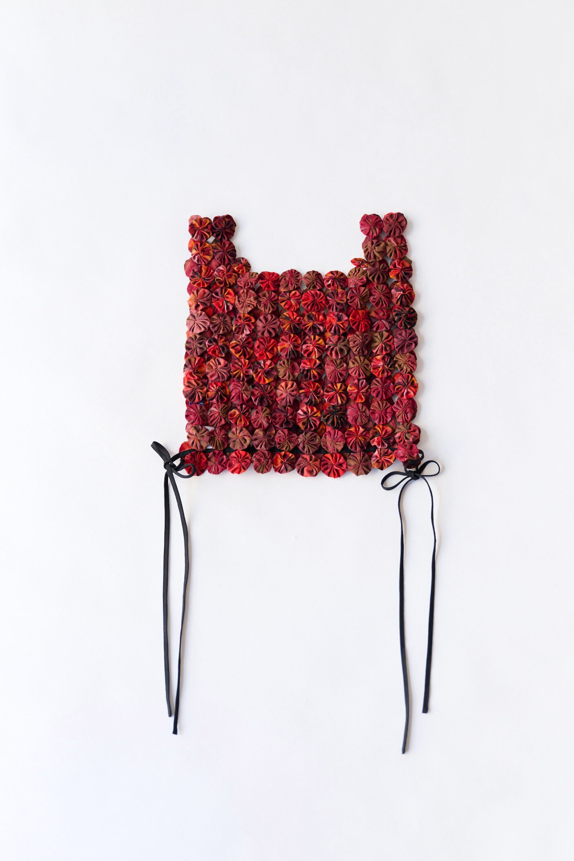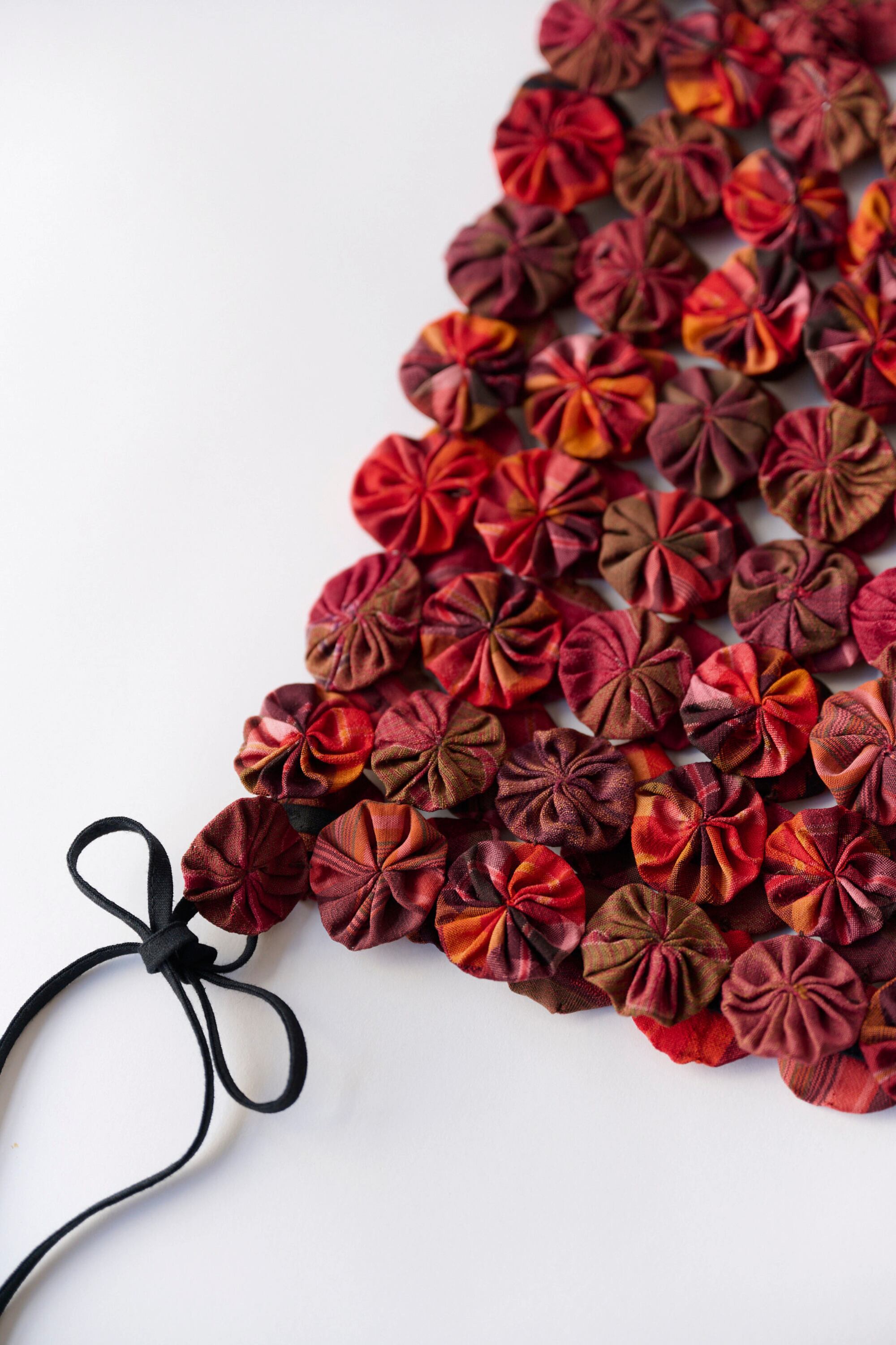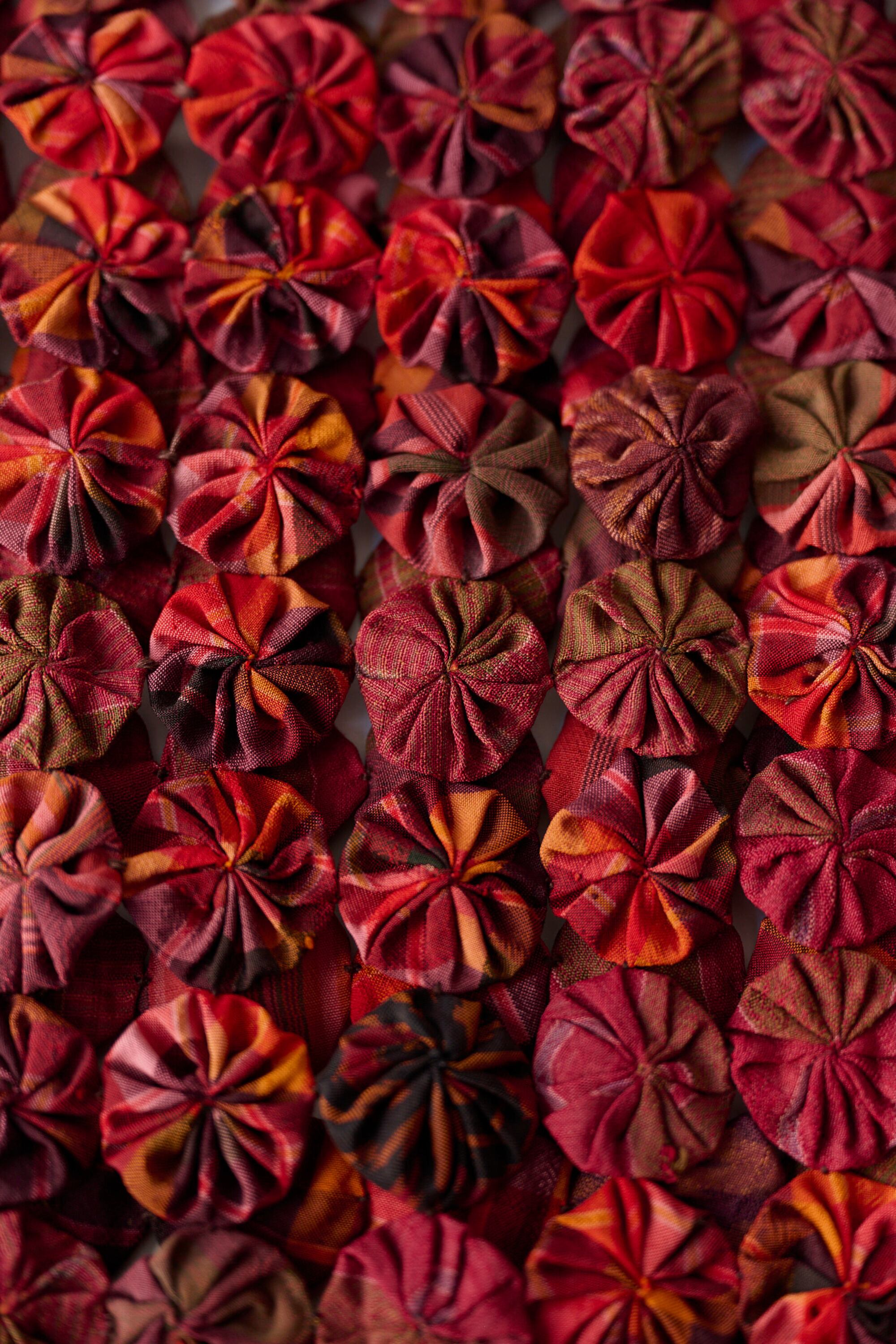 円形に小さくカットした生地を縫い縮め、それをつなぎ合わせて一枚のキルトを形作るYo-yoのスタイル。主にアメリカで盛んなyo-yoの技法ですが、以前の北欧買い付けで珍しく出会うことができたヨーヨーキルトを、こちらのベストの素材として使用しました。