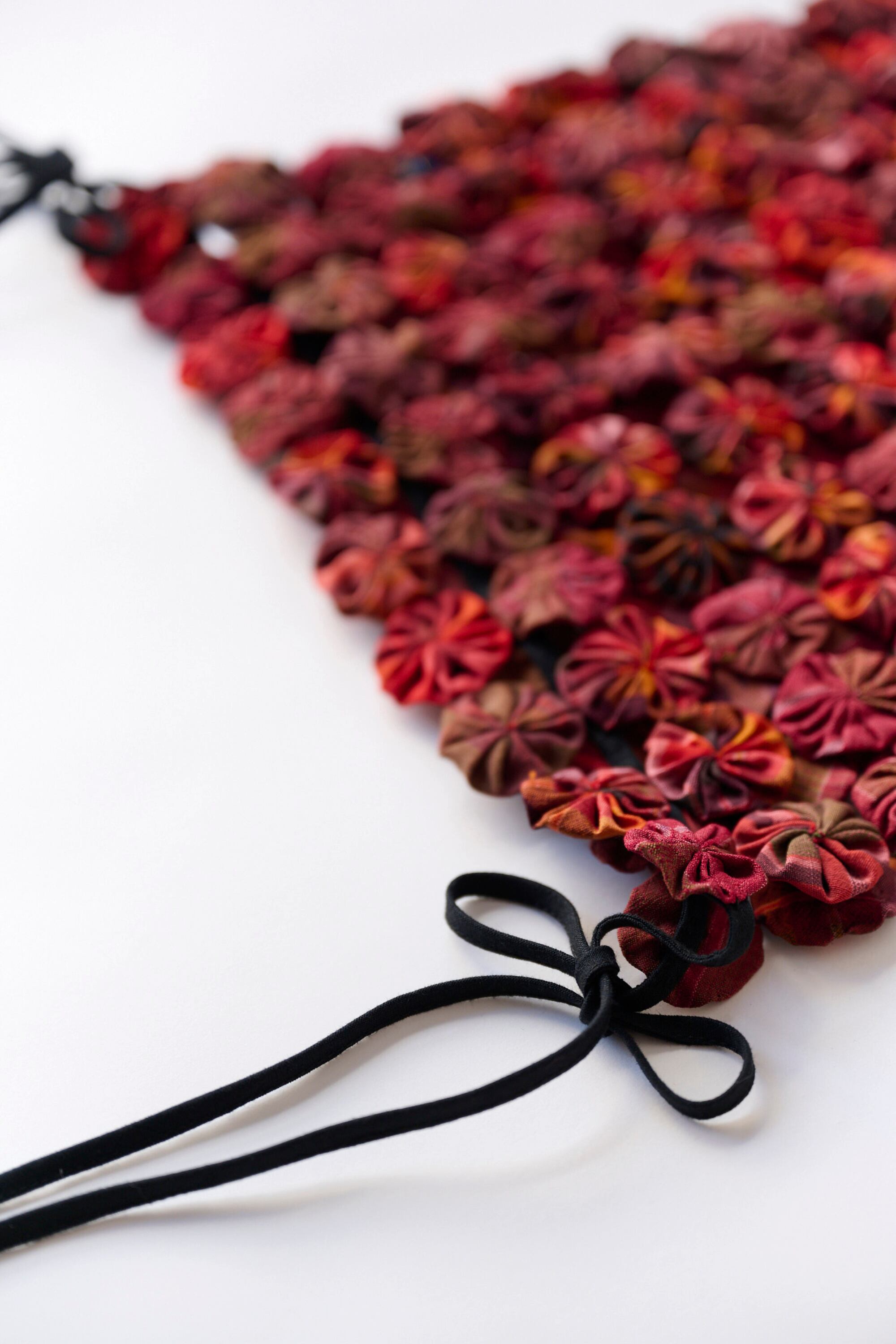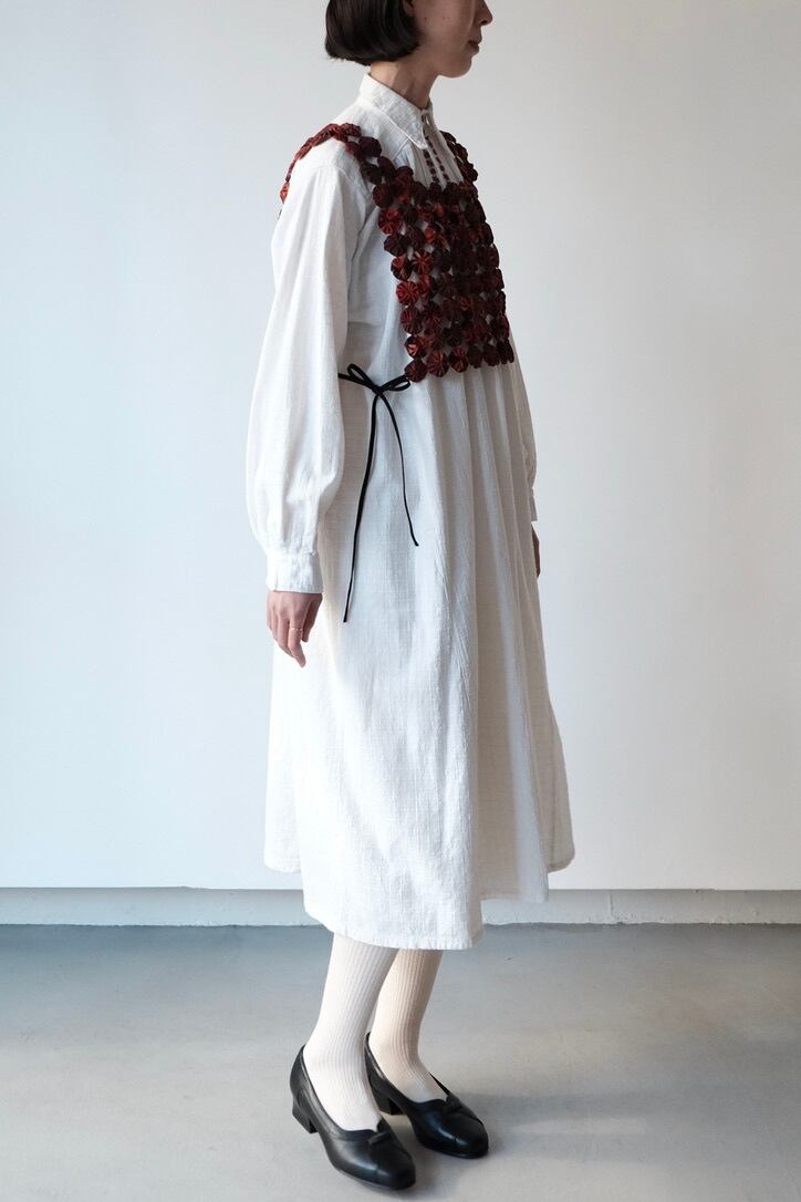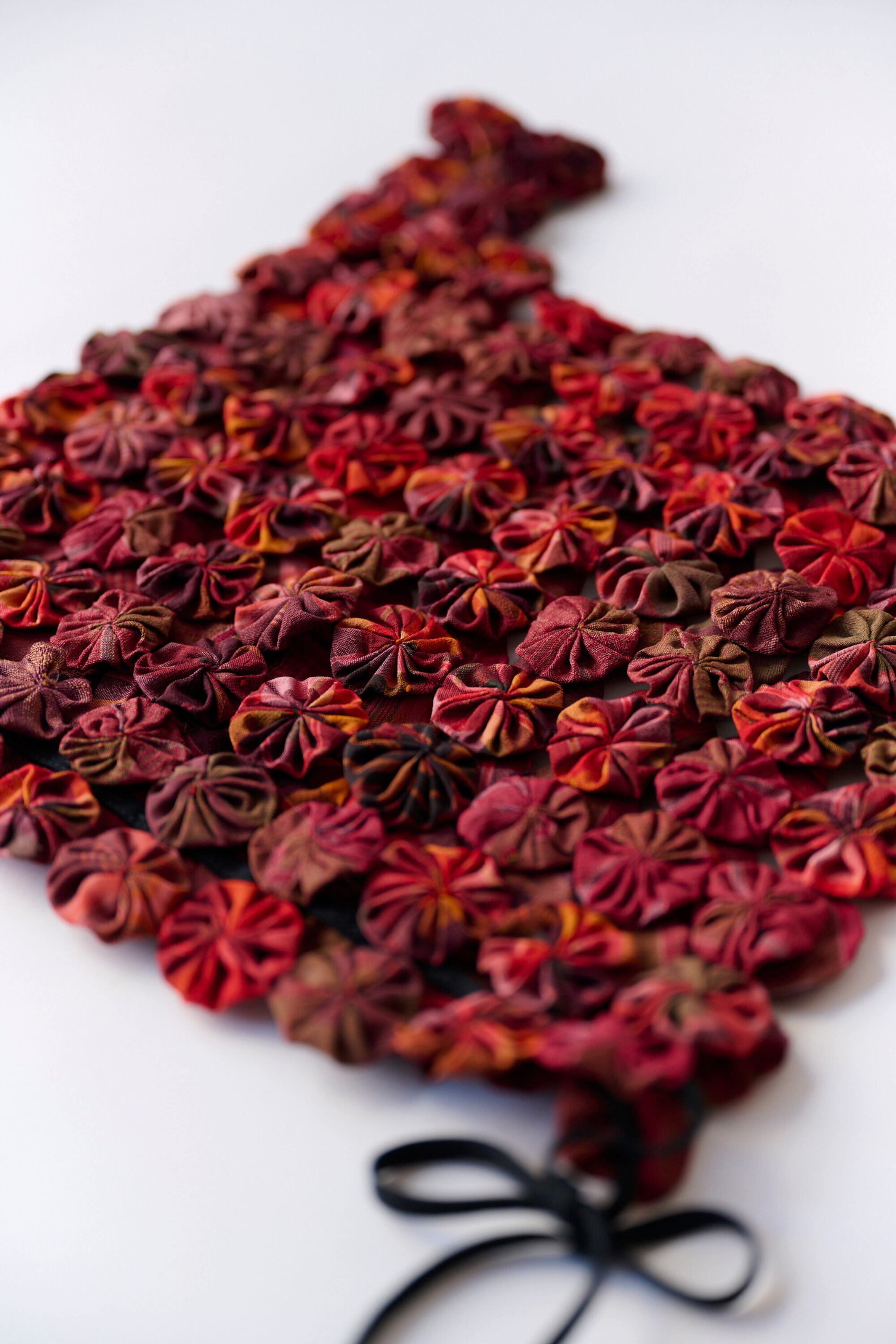 サイドをリボンで結ぶ仕様になっており、タイトなトップスをはじめ肉厚のセーター、ドレスやコート上にも合わせられるフリーサイズのアイテム。えんじをベースにした濃淡のあるカラーグラデーションが、コーディネートに華を添えるデザインです。