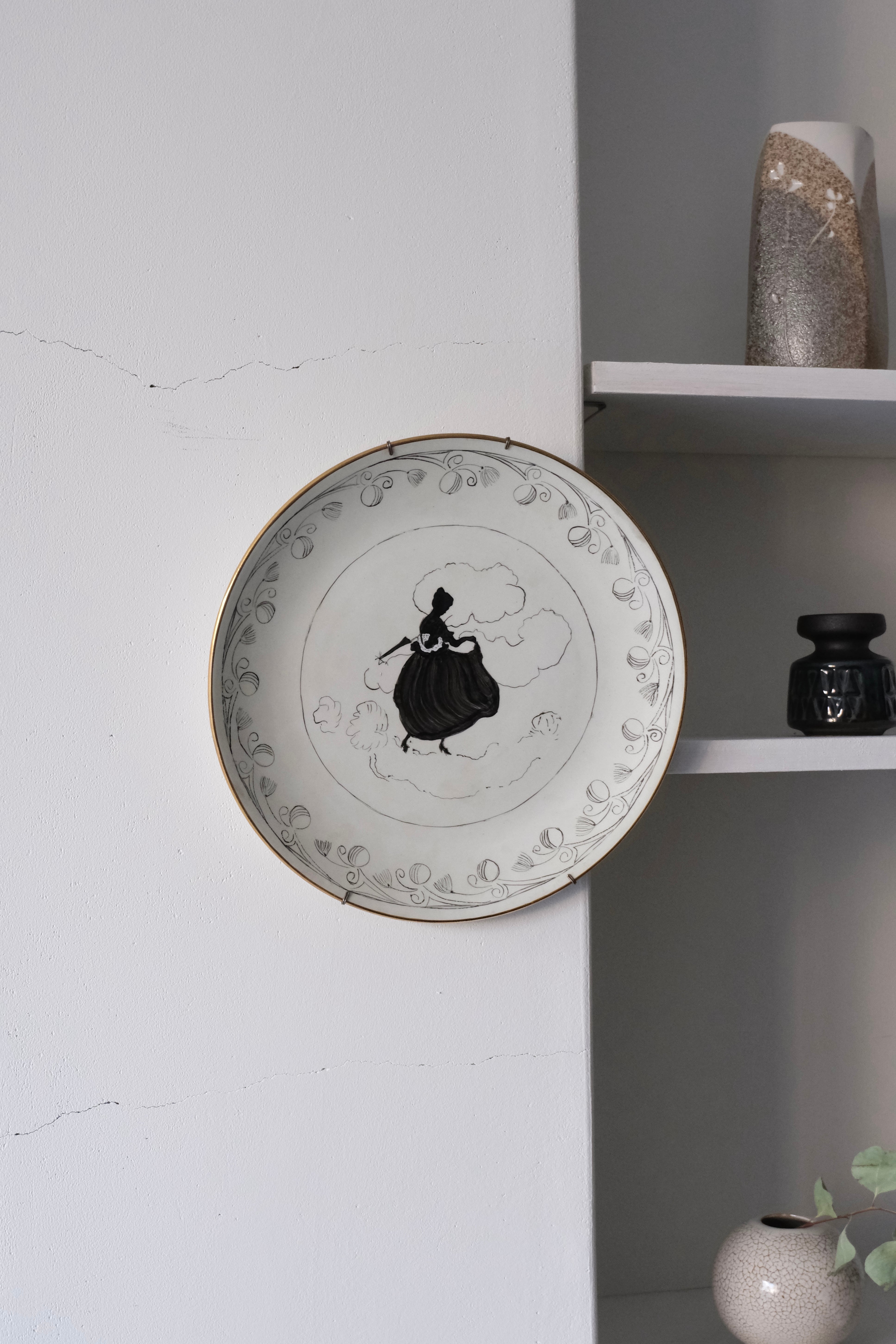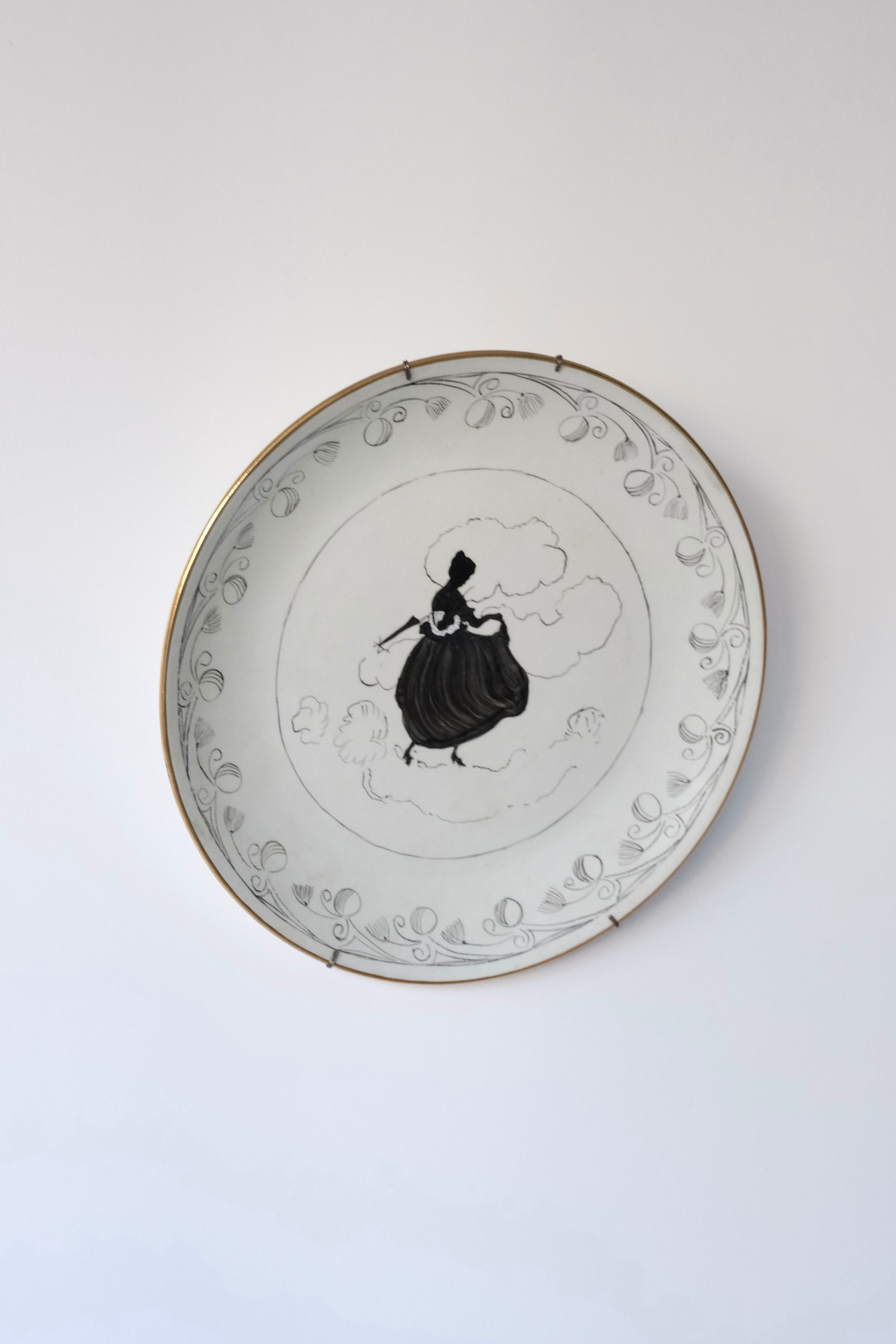 中央に配された、傘を差した貴婦人のシルエット。雲のようなやわらかな曲線とリムを縁取る繊細なガーランド模様が、モノトーンの中に気品ある奥行きを生んでいます。