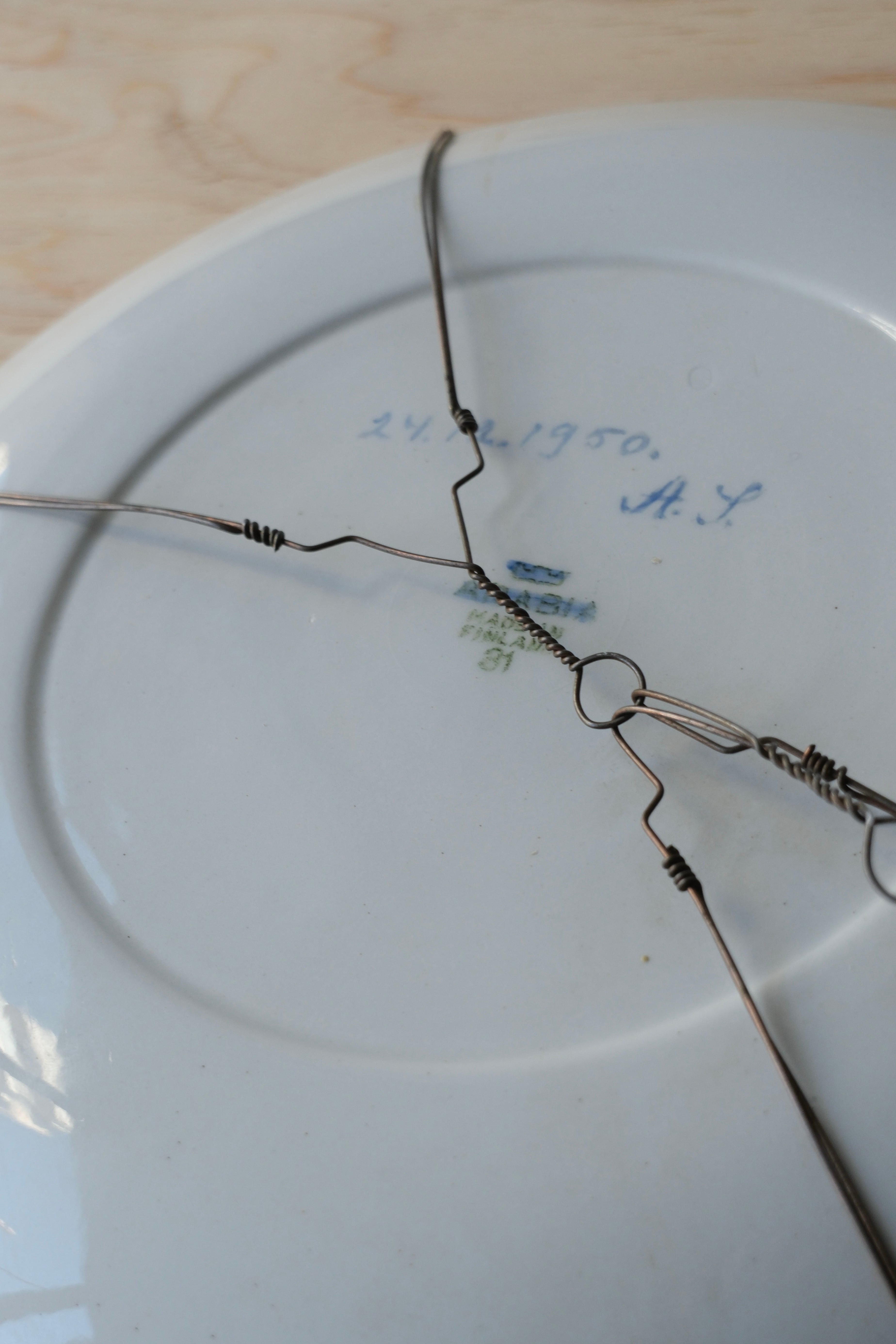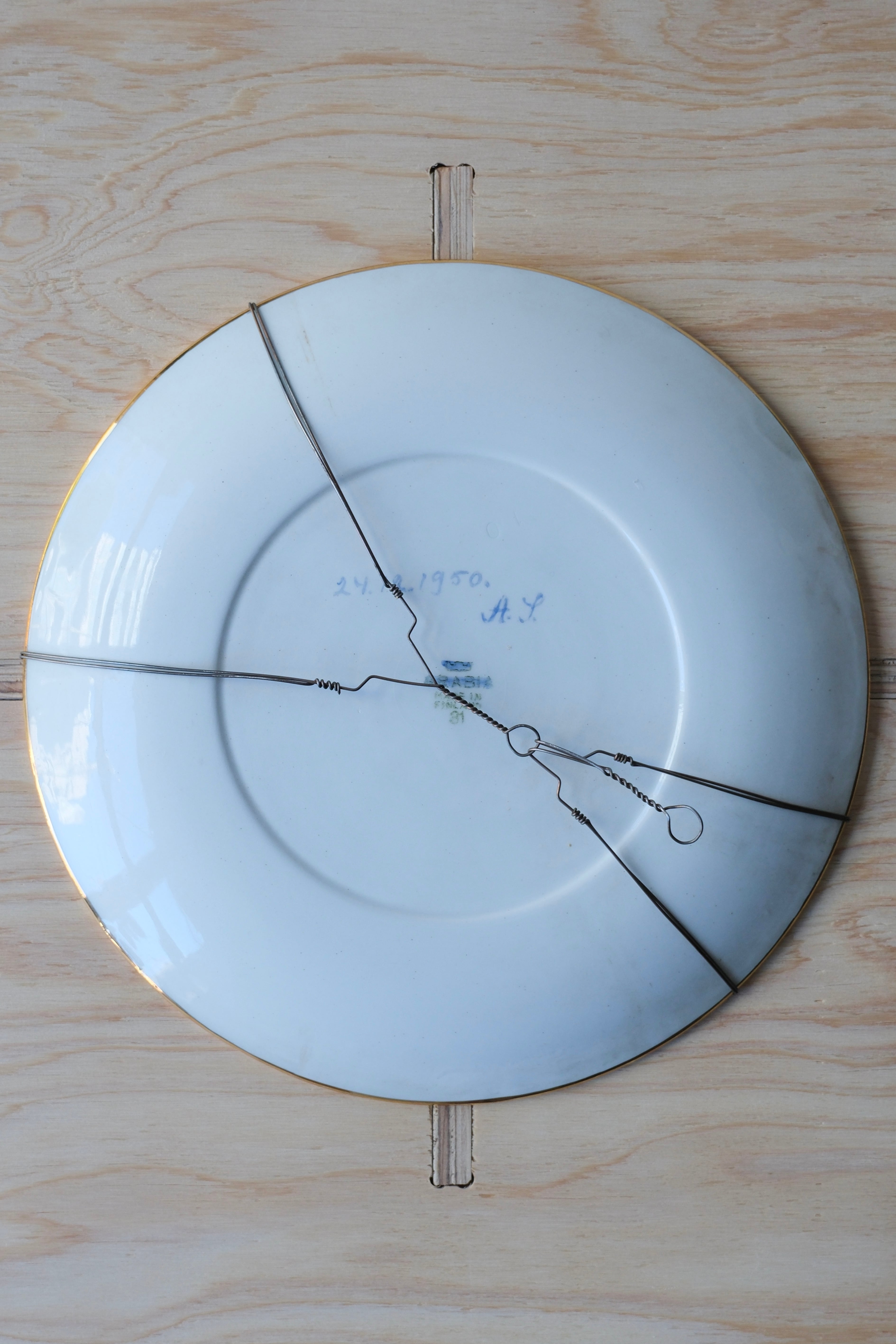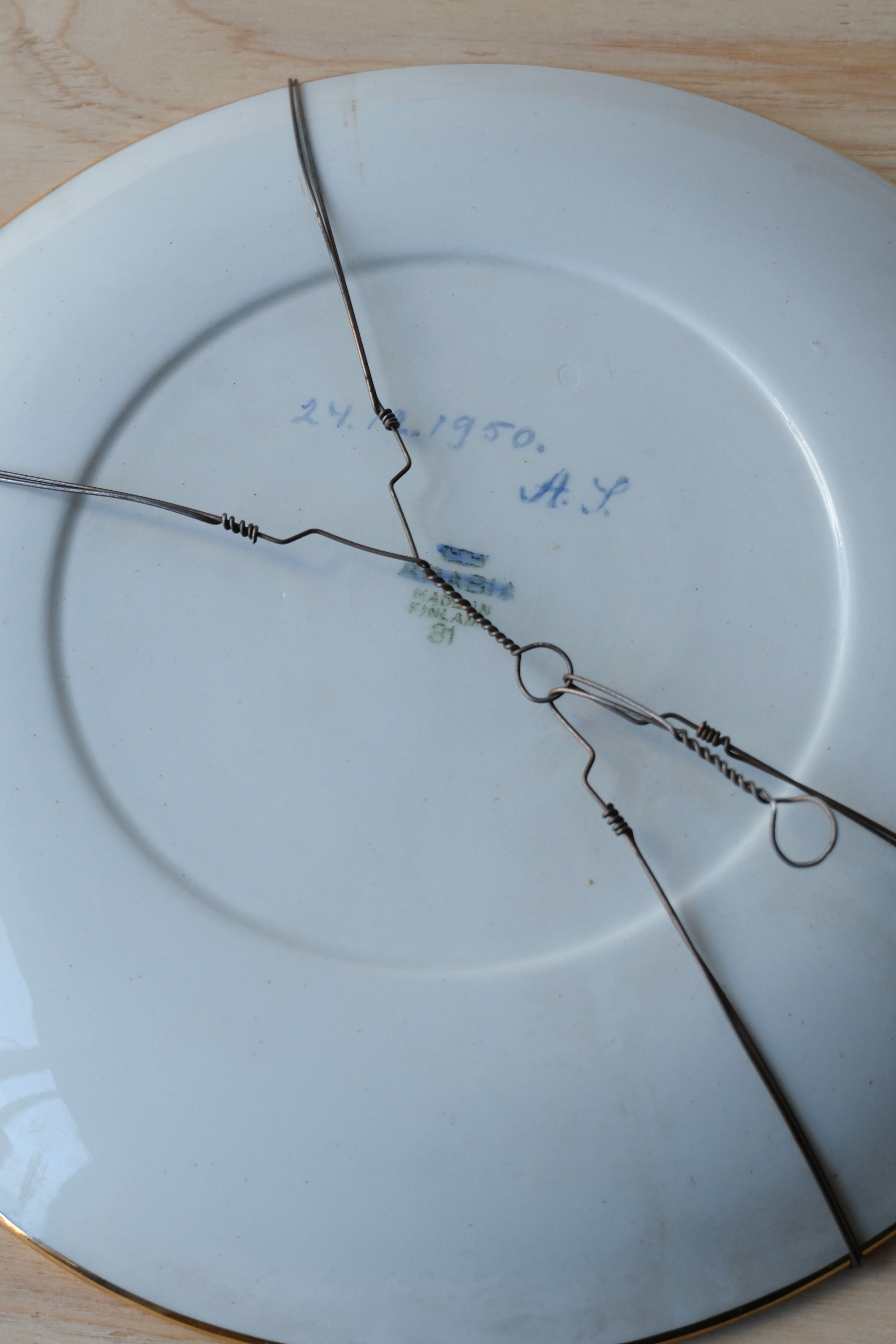 フィンランドで立ち寄ったチャリティーショップで、目を奪われた美しいプレート。裏を返すと、そこにはARABIAのスタンプがありますが、それを上から筆で塗り潰し、“1950.12.24” とイニシャルのサインを入れた跡があります。