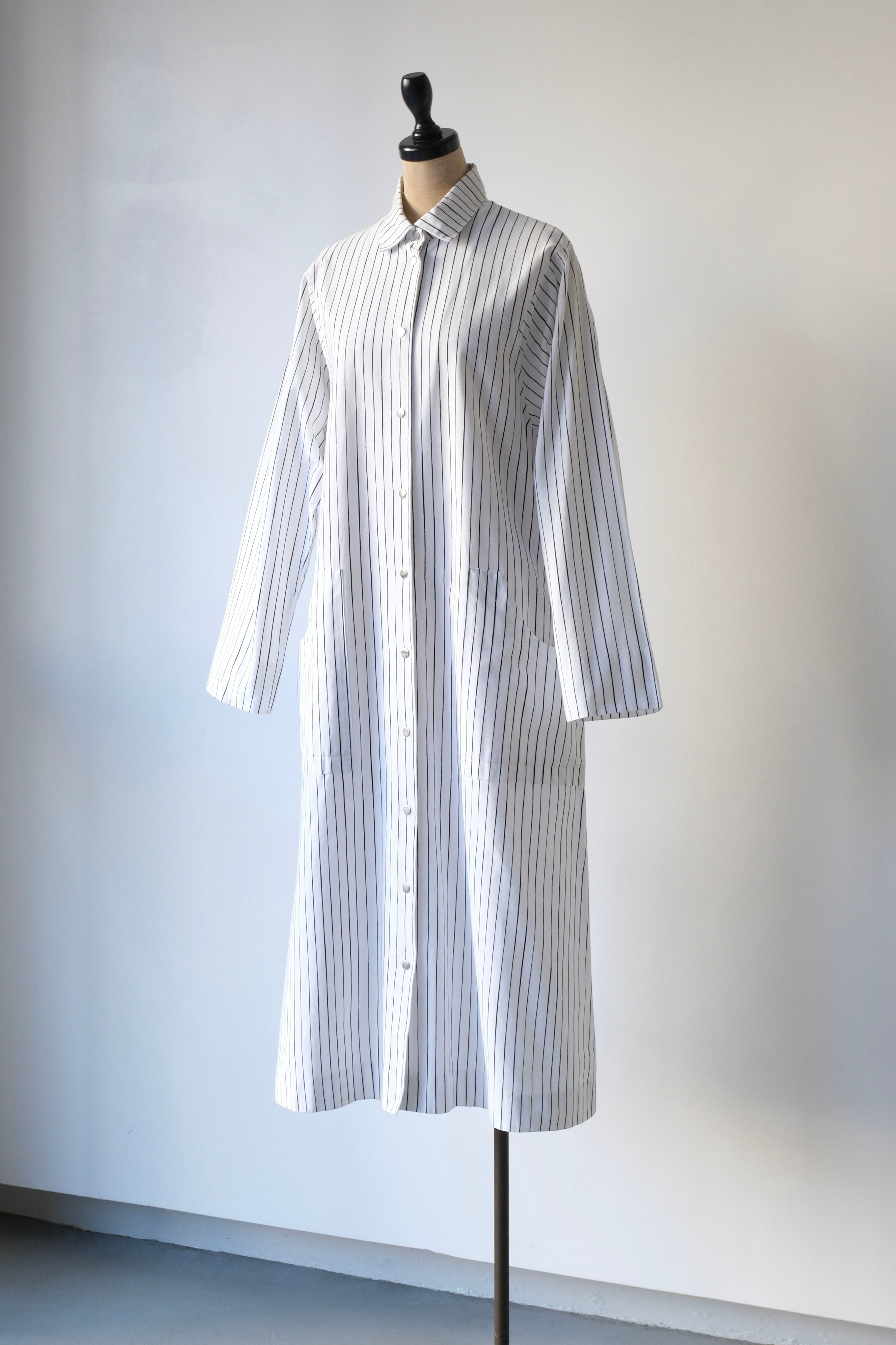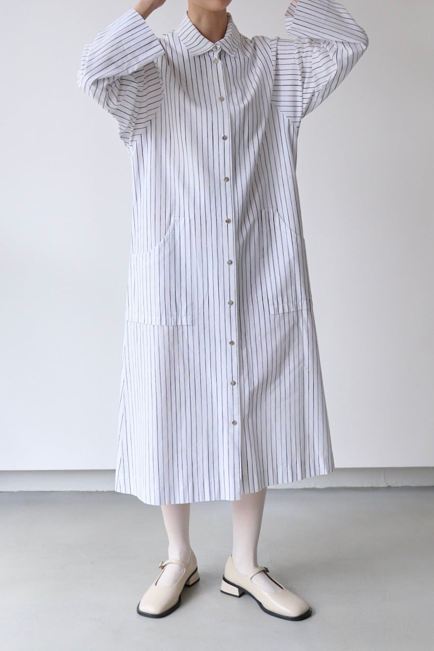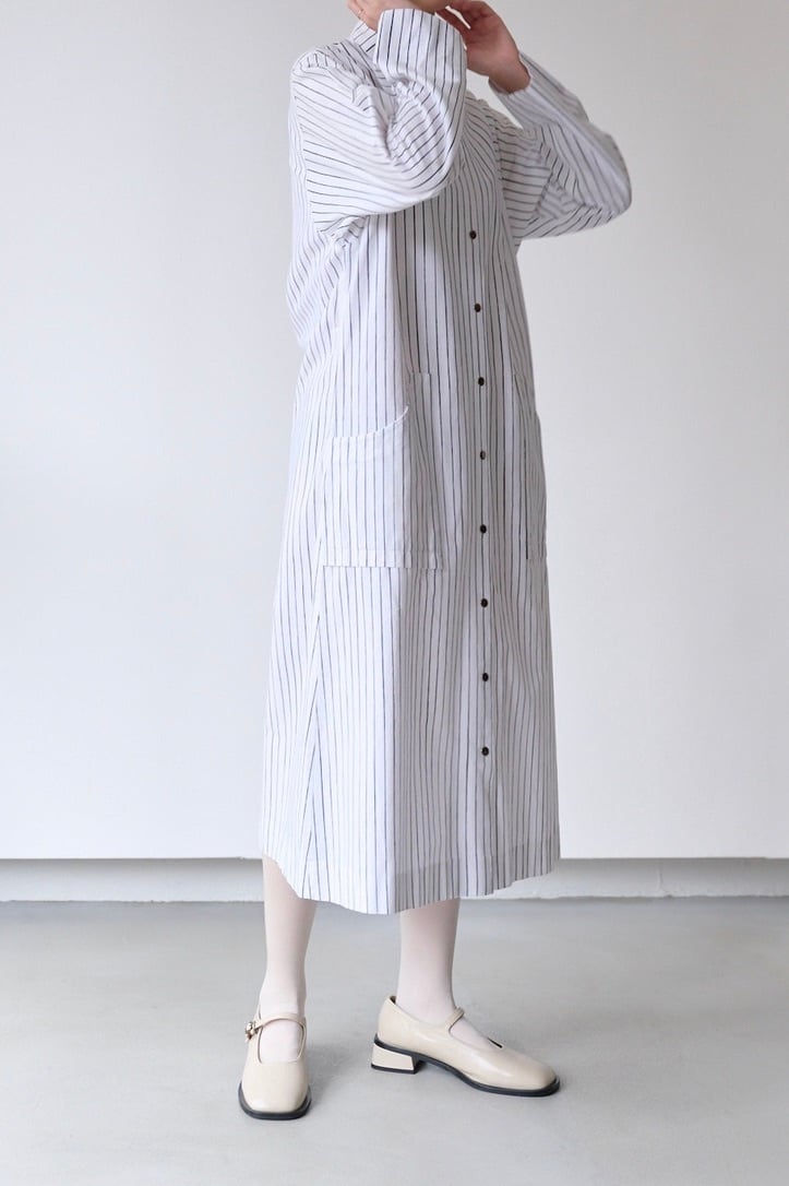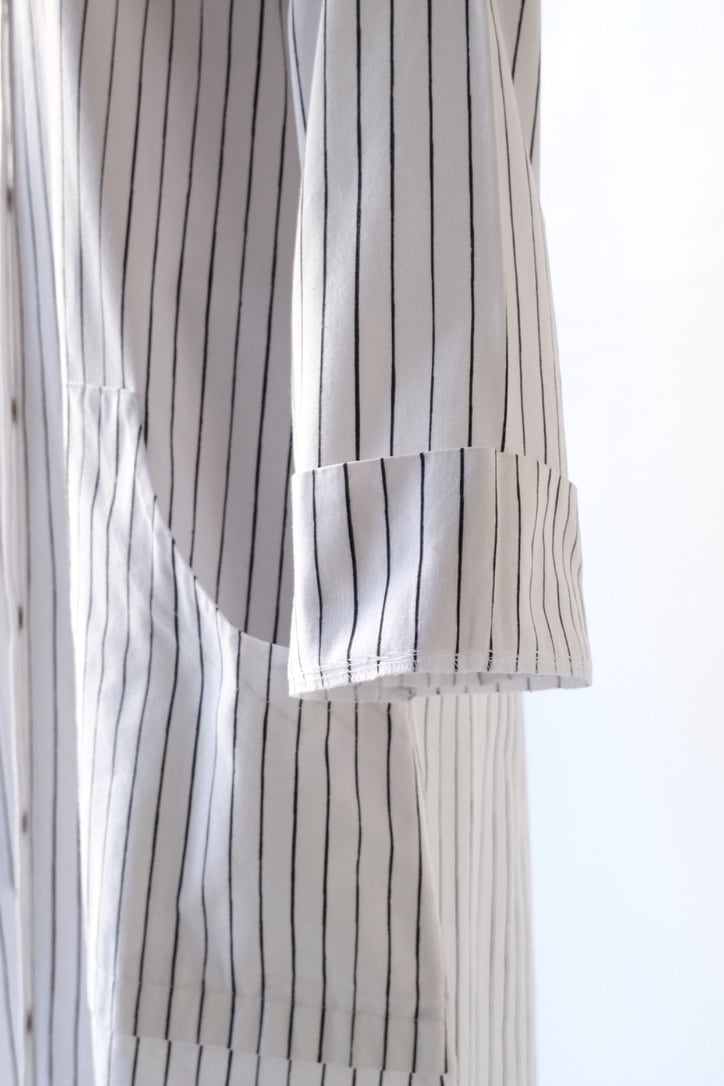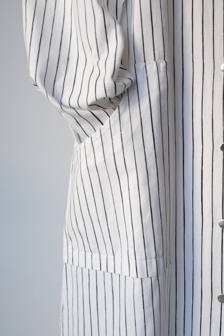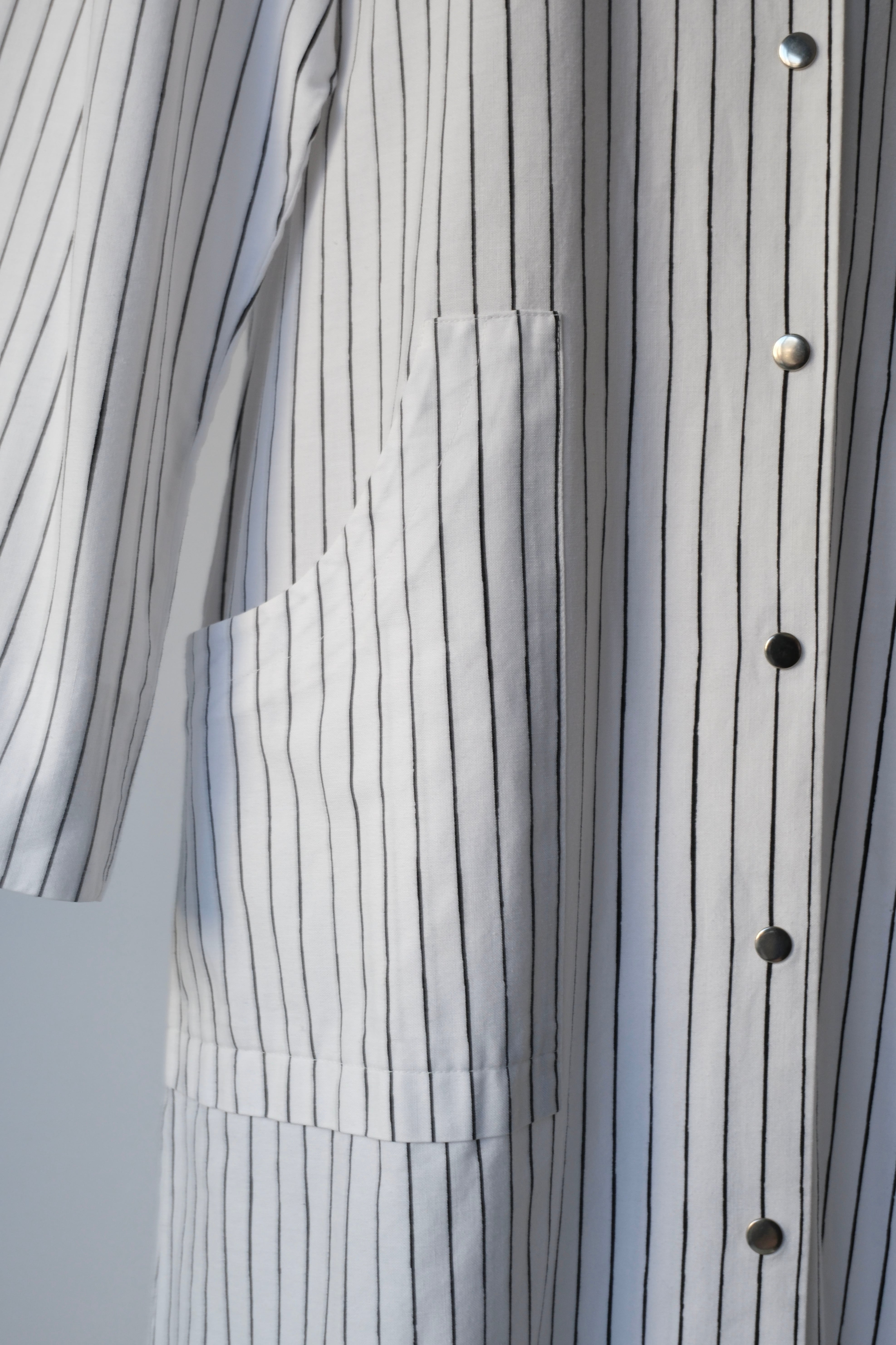 フロントと袖口にあしらわれたシルバーのスナップボタンは、プラスチックにはない適度な重みとマットなツヤがあり、クリーンなストライプ地に無機質なアクセントを加えています。腰位置に配された大きなポケットも目を引くポイント。