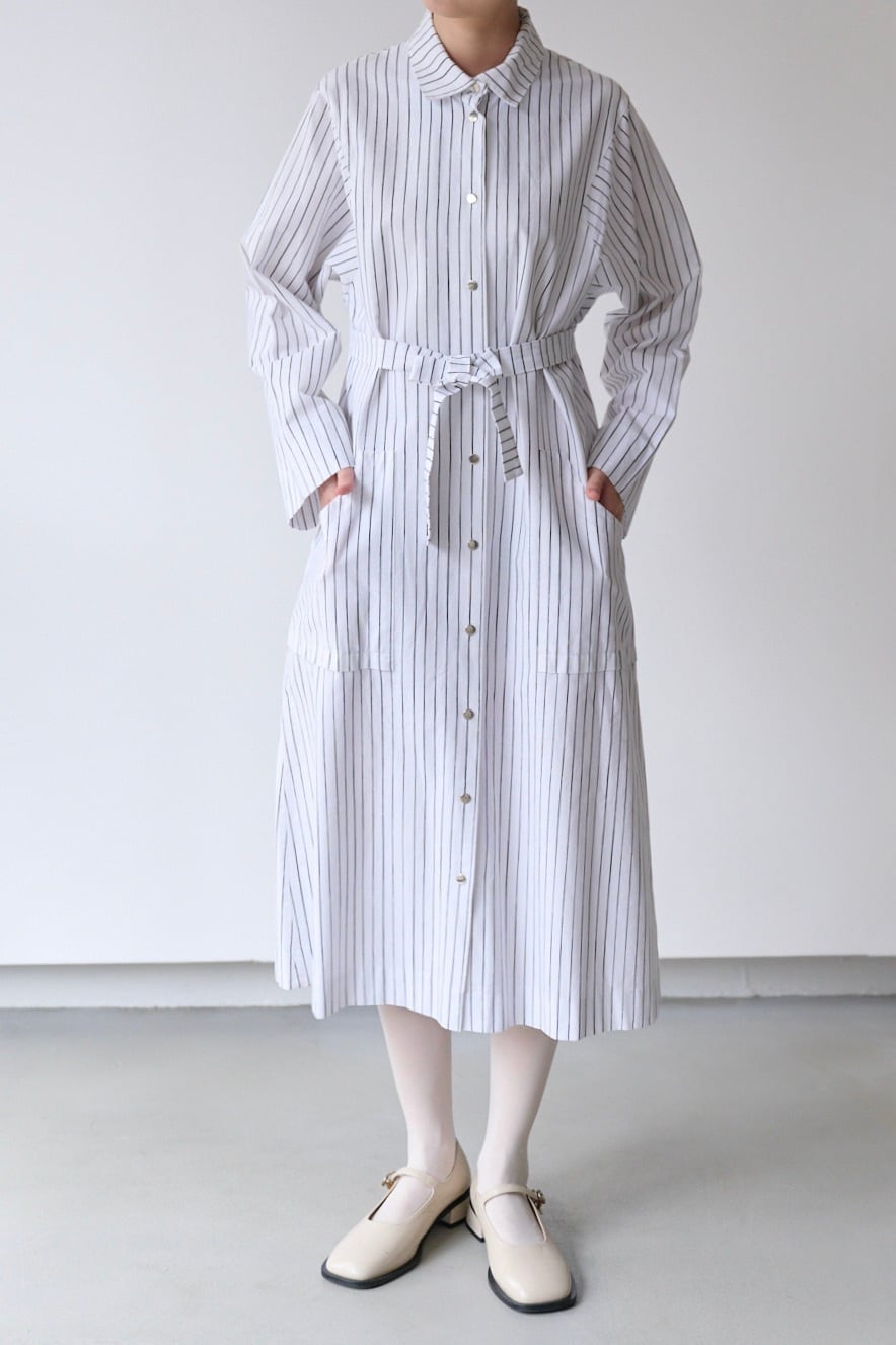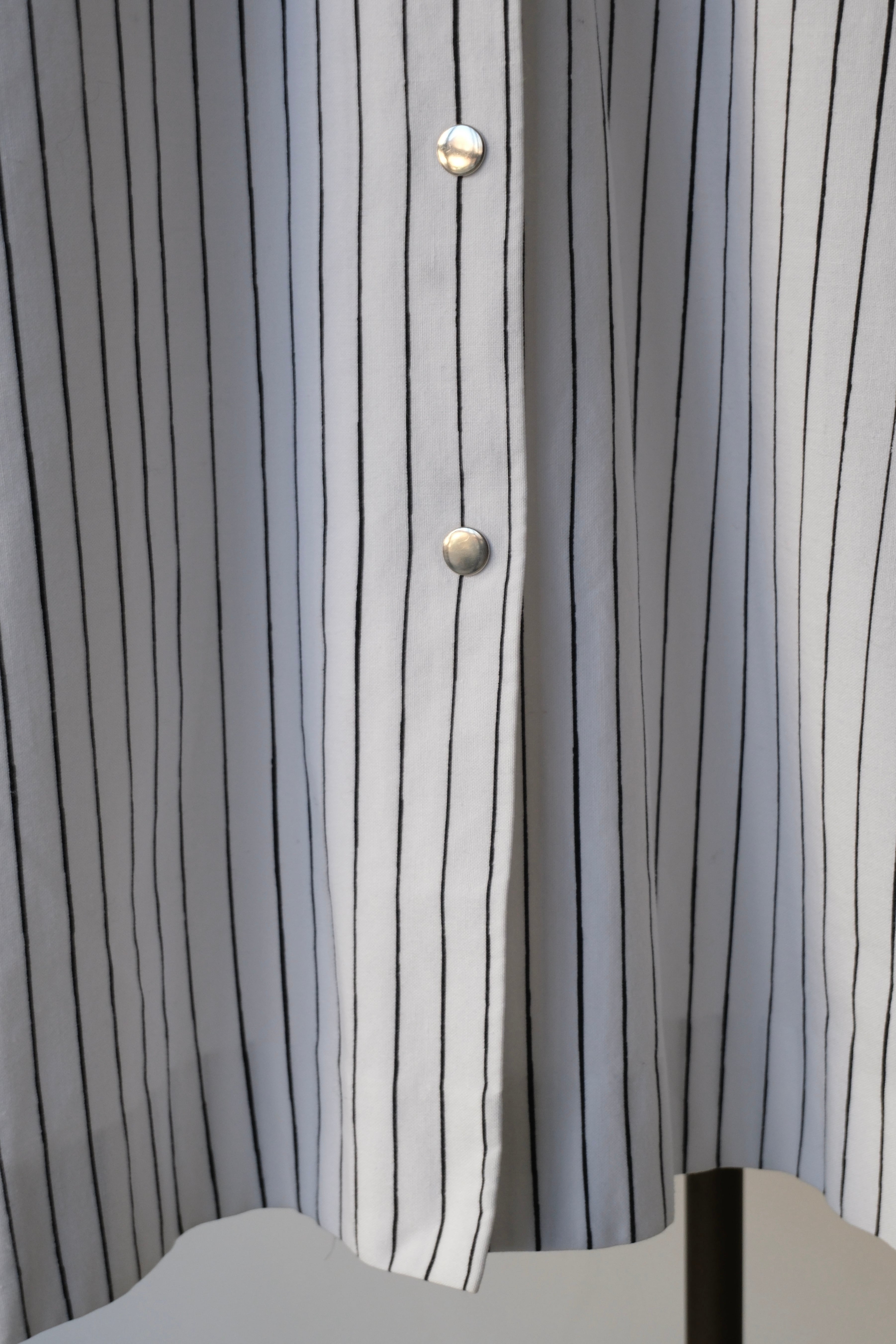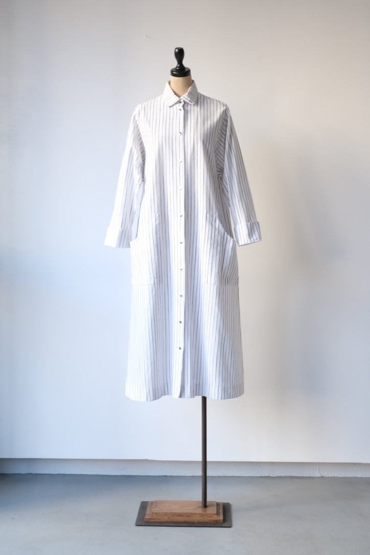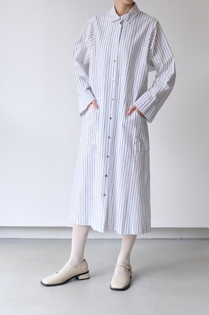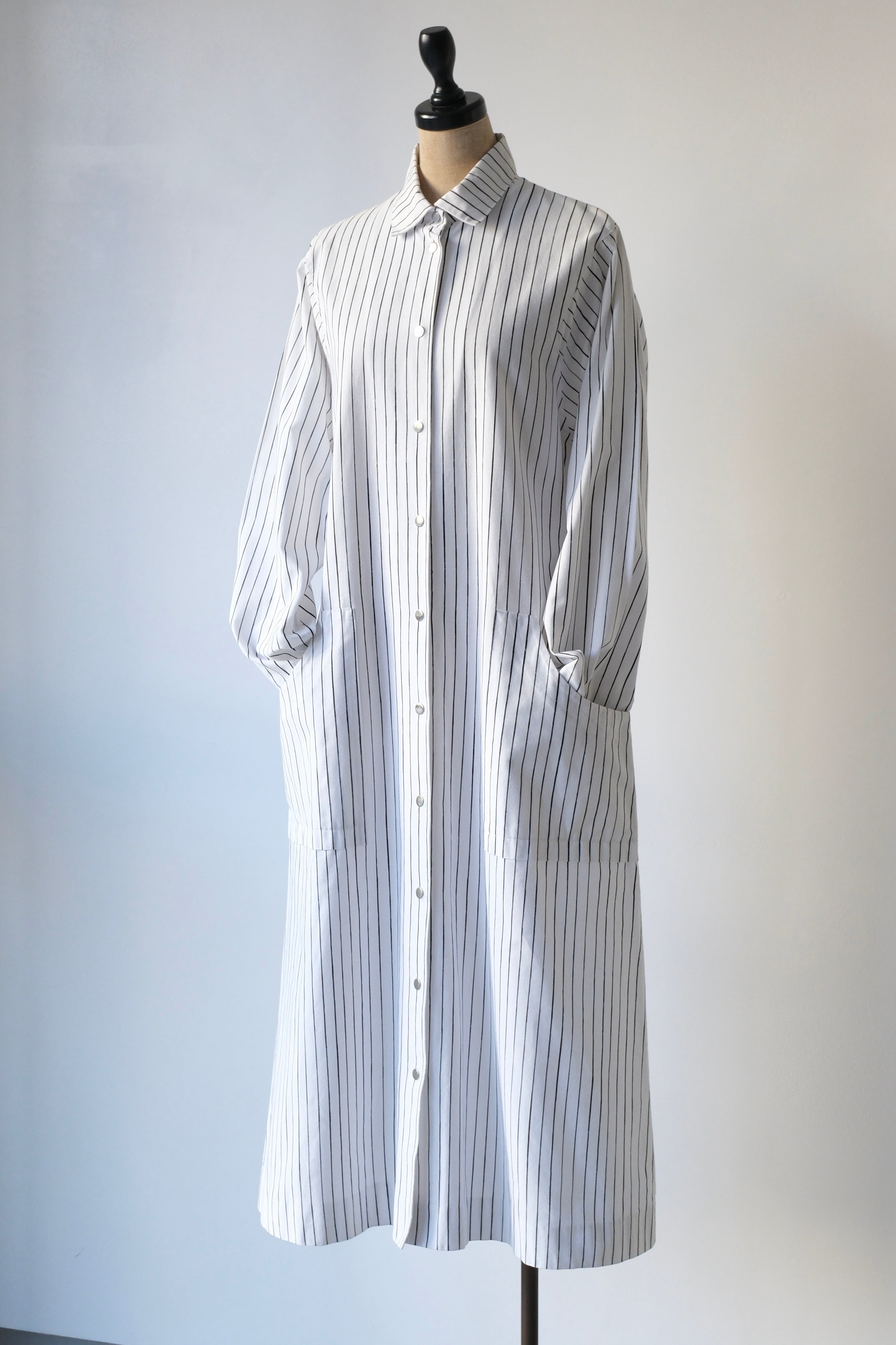 フロントと袖口にあしらわれたシルバーのスナップボタンは、プラスチックにはない適度な重みとマットなツヤがあり、クリーンなストライプ地に無機質なアクセントを加えています。腰位置に配された大きなポケットも目を引くポイント。