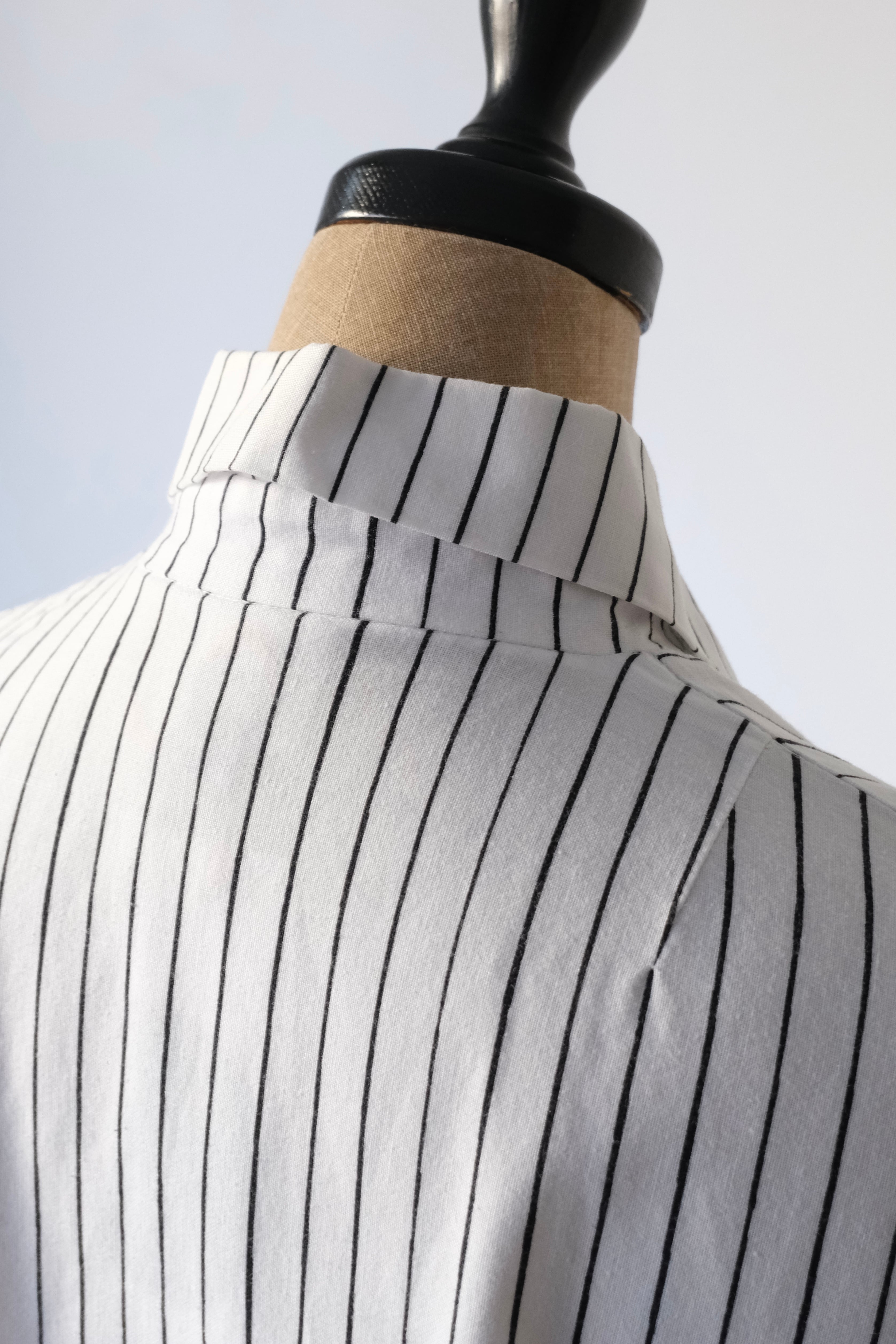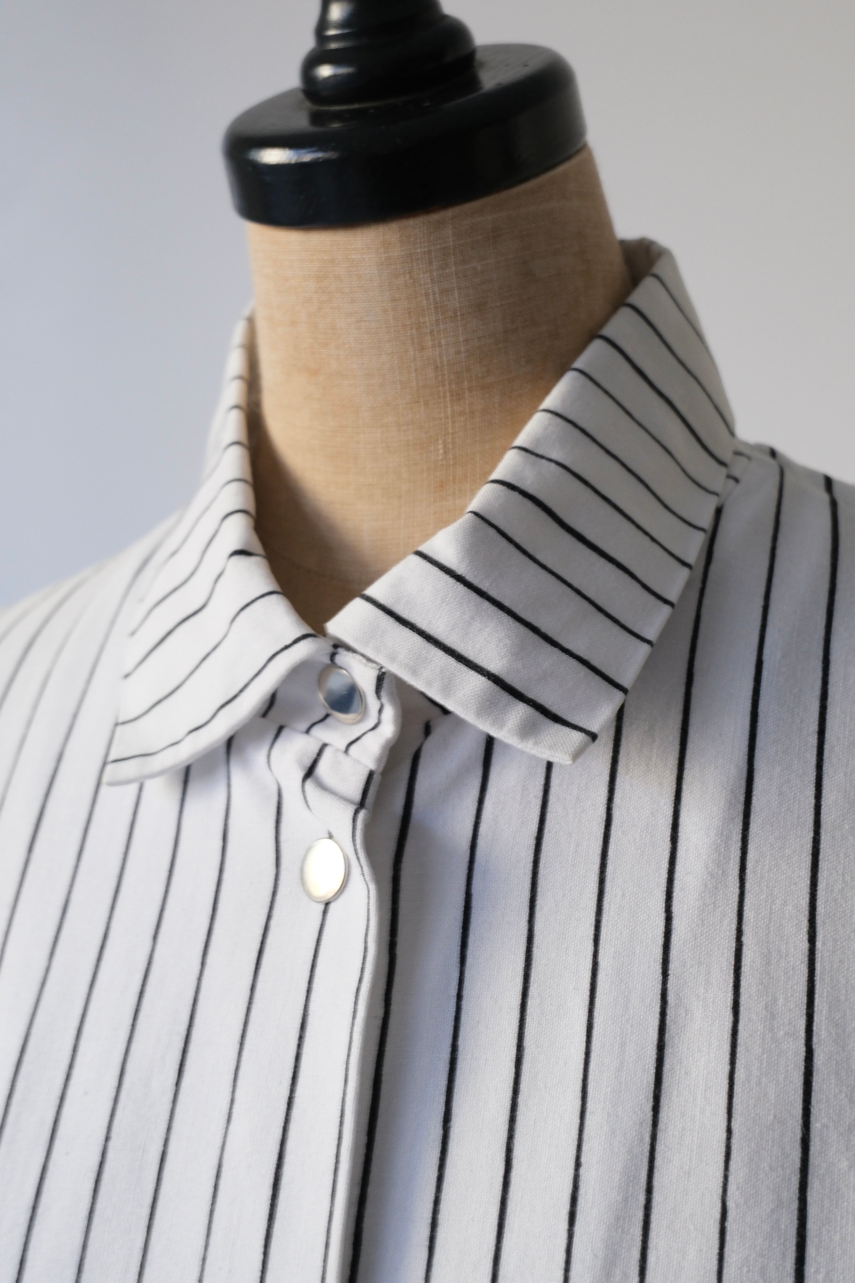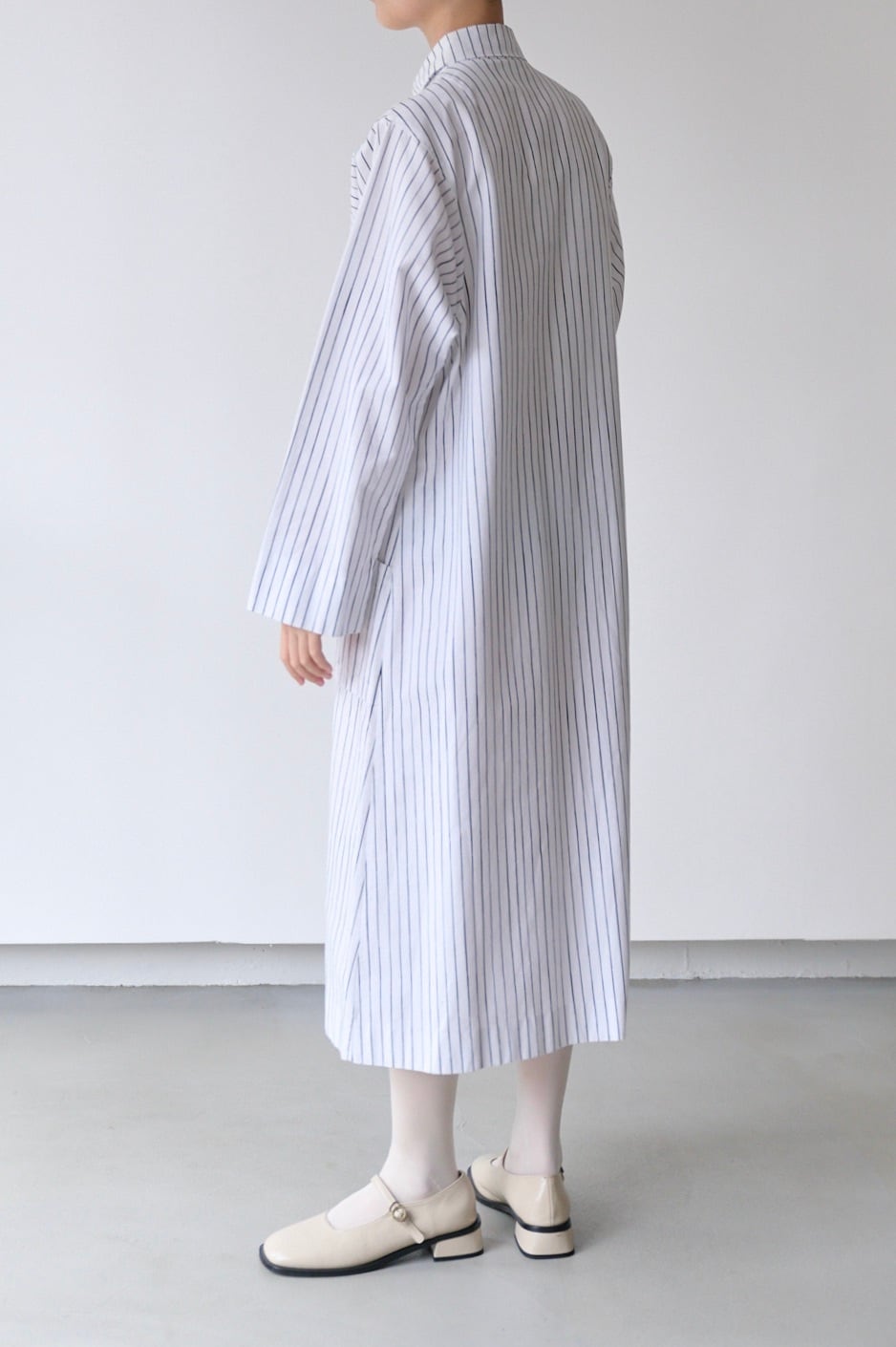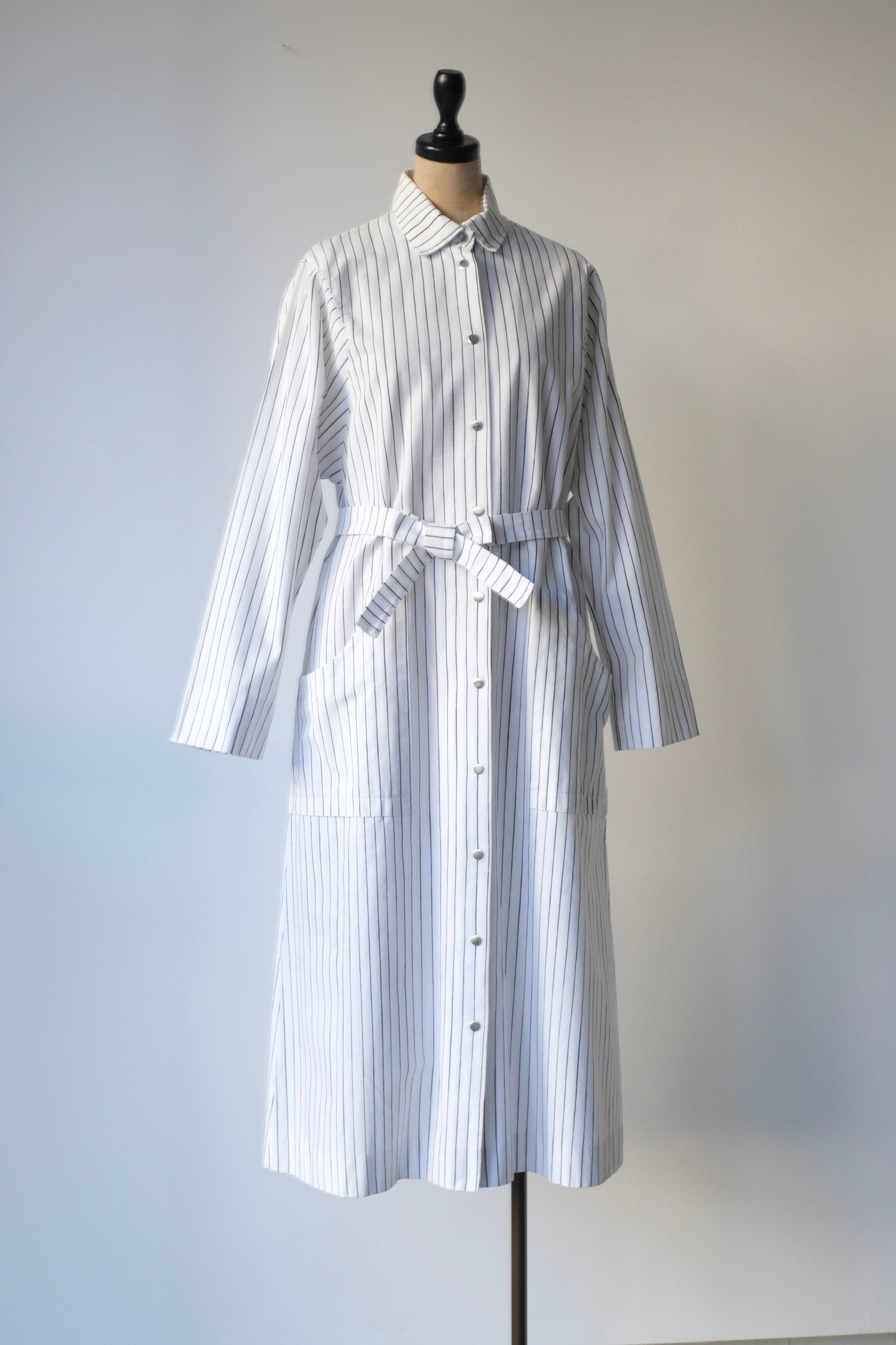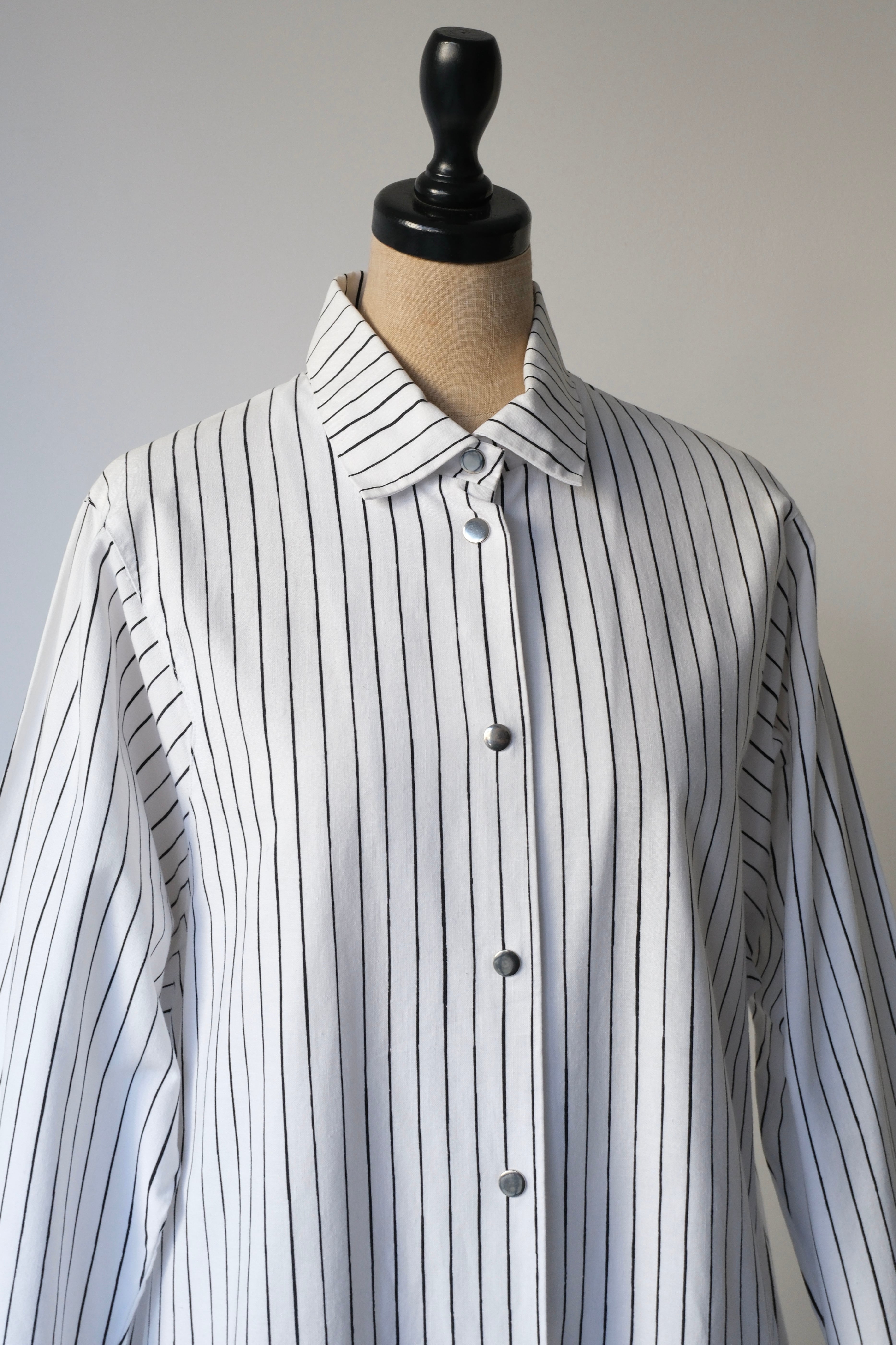 フロントと袖口にあしらわれたシルバーのスナップボタンは、プラスチックにはない適度な重みとマットなツヤがあり、クリーンなストライプ地に無機質なアクセントを加えています。腰位置に配された大きなポケットも目を引くポイント。