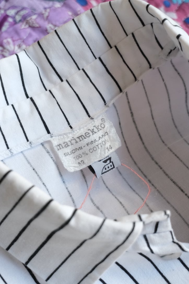 白地に黒のピンストライプが凛々しいマリメッコのワークシャツドレス。こちらは1970年代頃に作られたヴィンテージアイテムです。