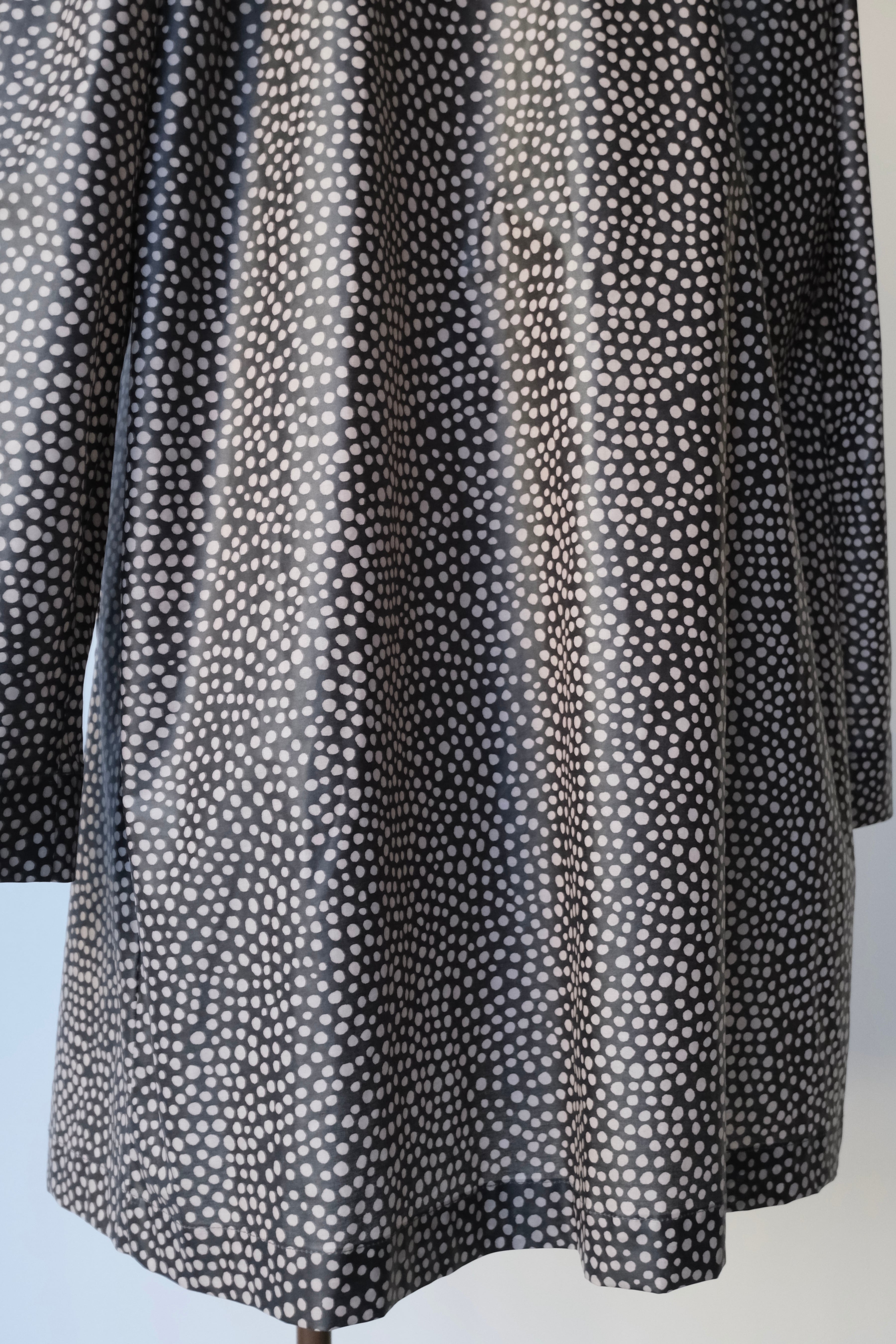 黒地にグレージュの不揃いなドットが広がるテキスタイルのデザインは、雨粒が窓を叩く様子を表現したかのよう。憂鬱になりがちな雨の日に、気持ちを上げてくれそうです。