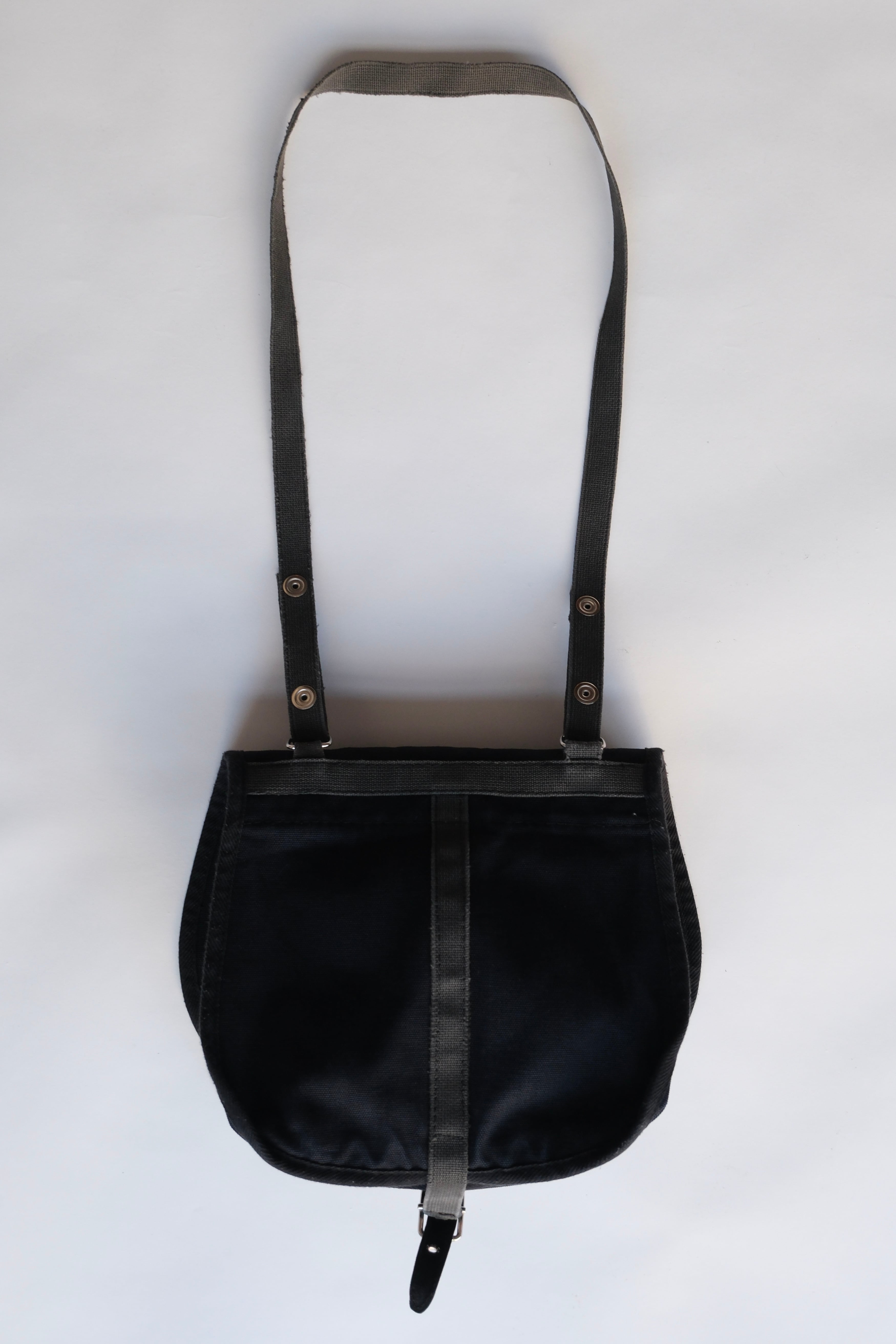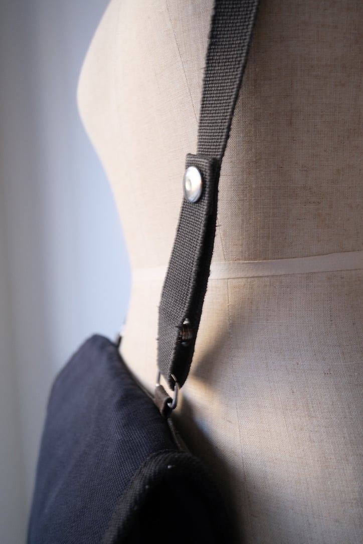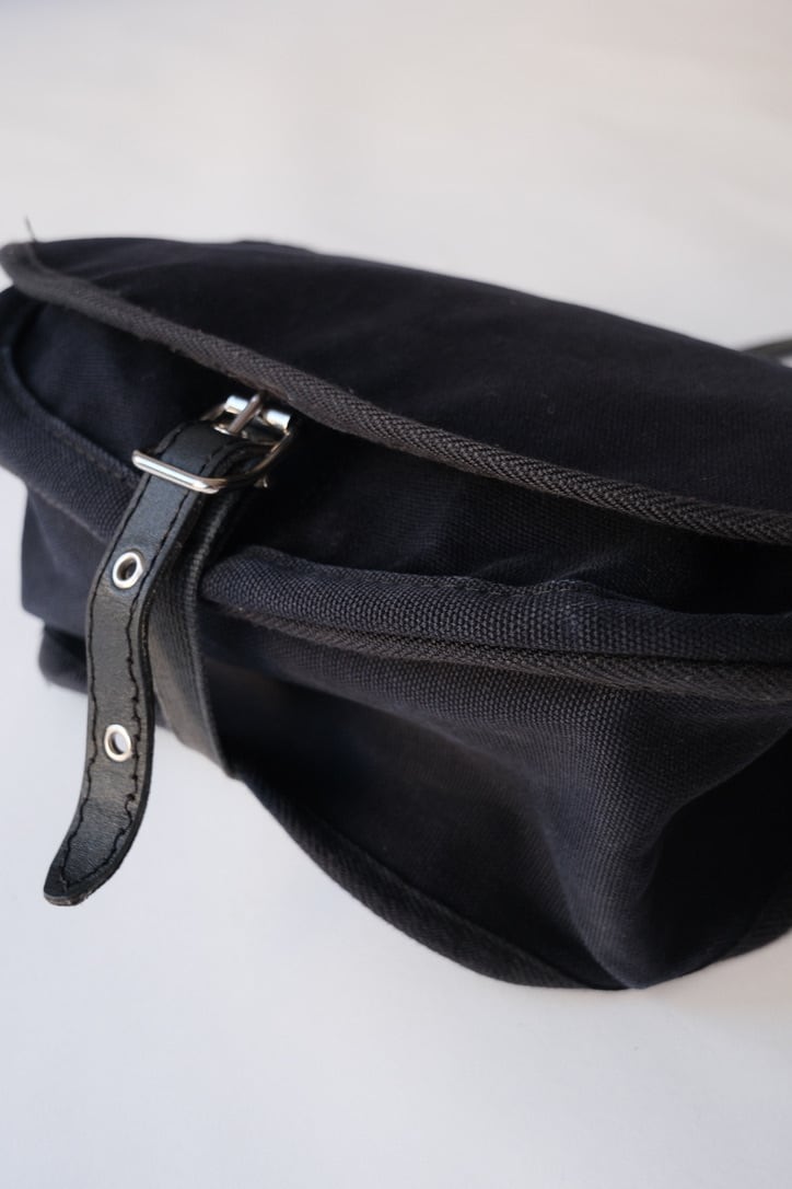 ヴィンテージ特有の厚みがあるブラックキャンバス生地は、程よく使い込まれたやわらかな風合いが感じられます。レザーのベルトや金属パーツ、内側に配されたブランドロゴの織りネーム、ポケットなど、細部までとてもよく作り込まれている印象。