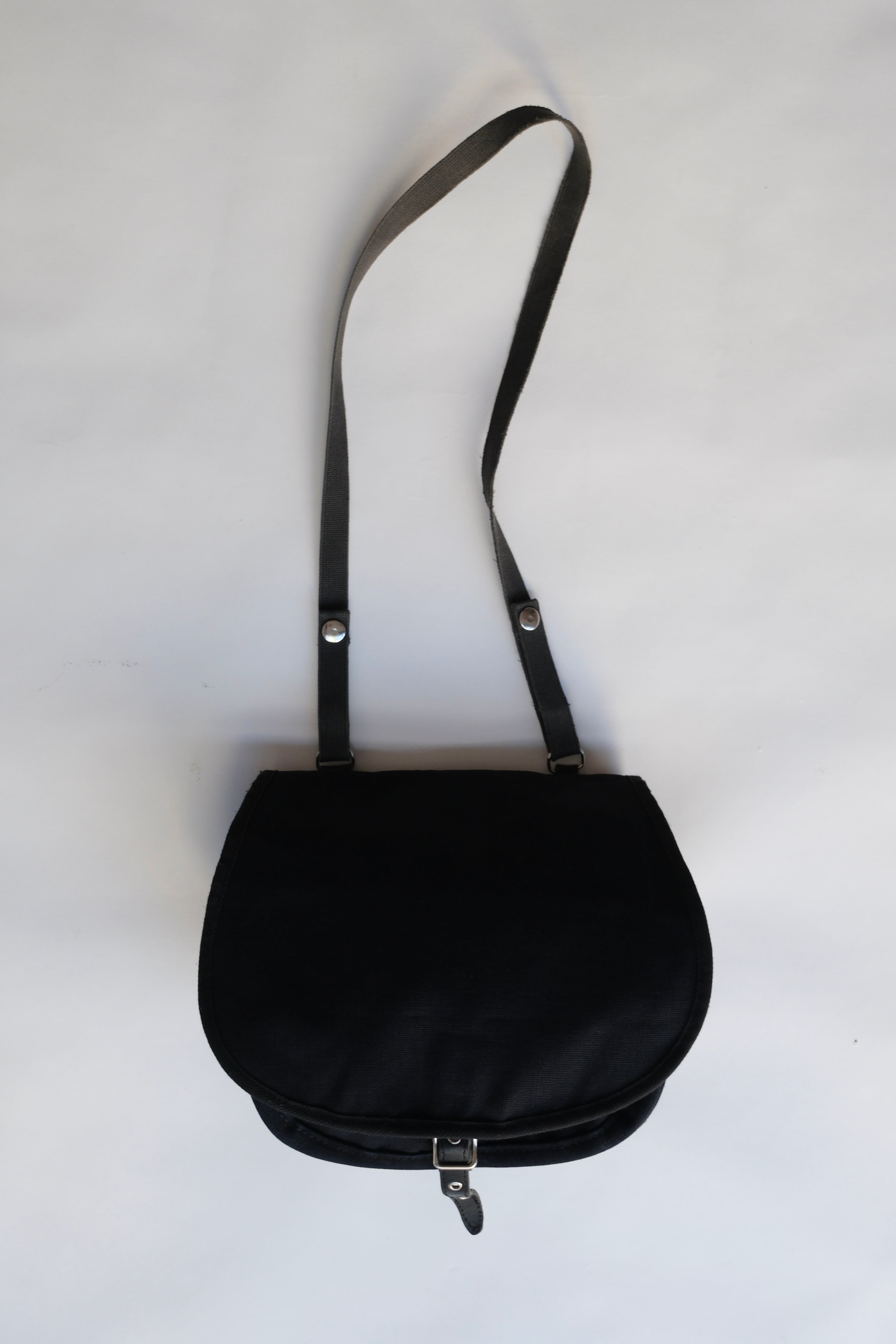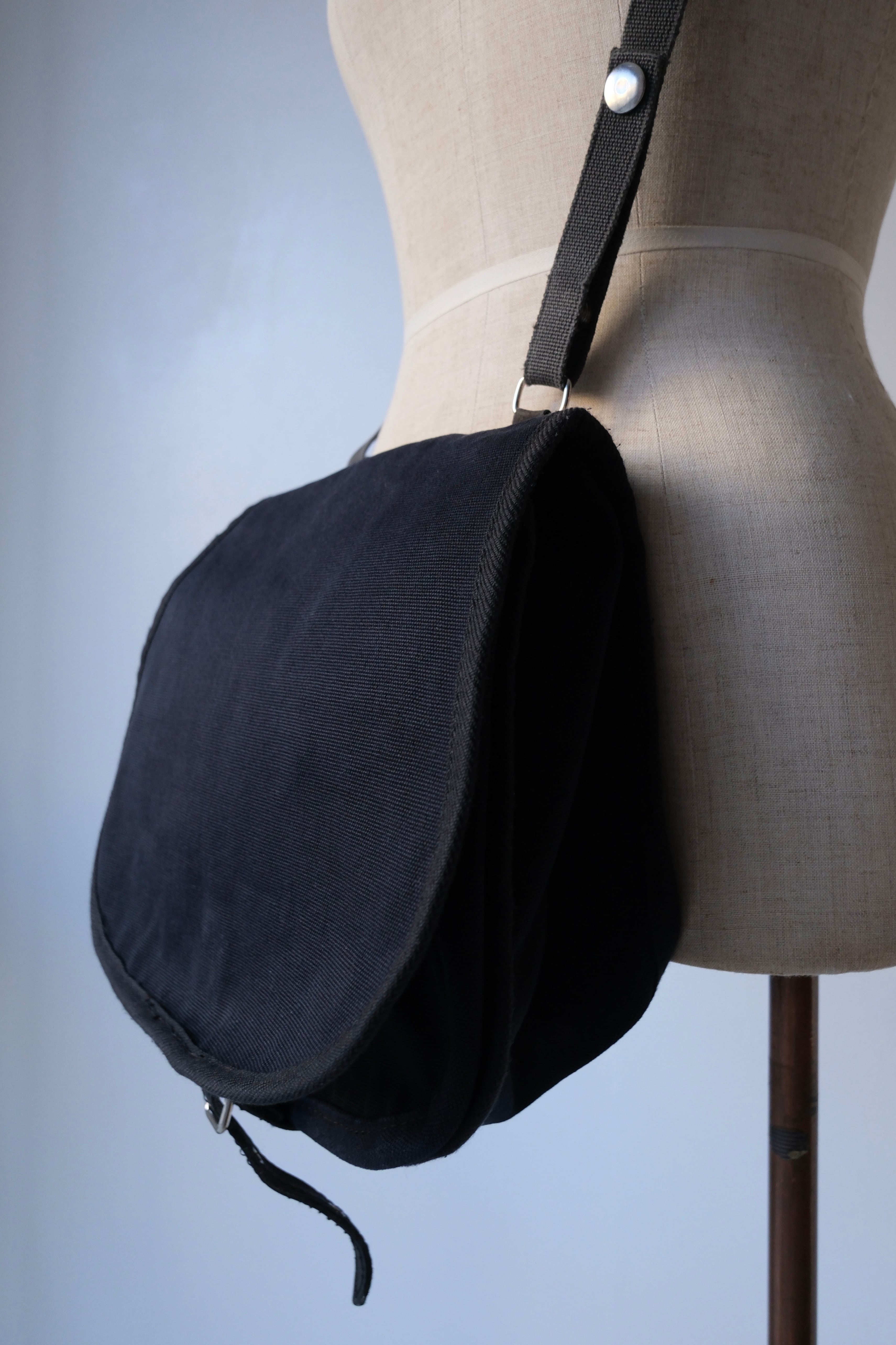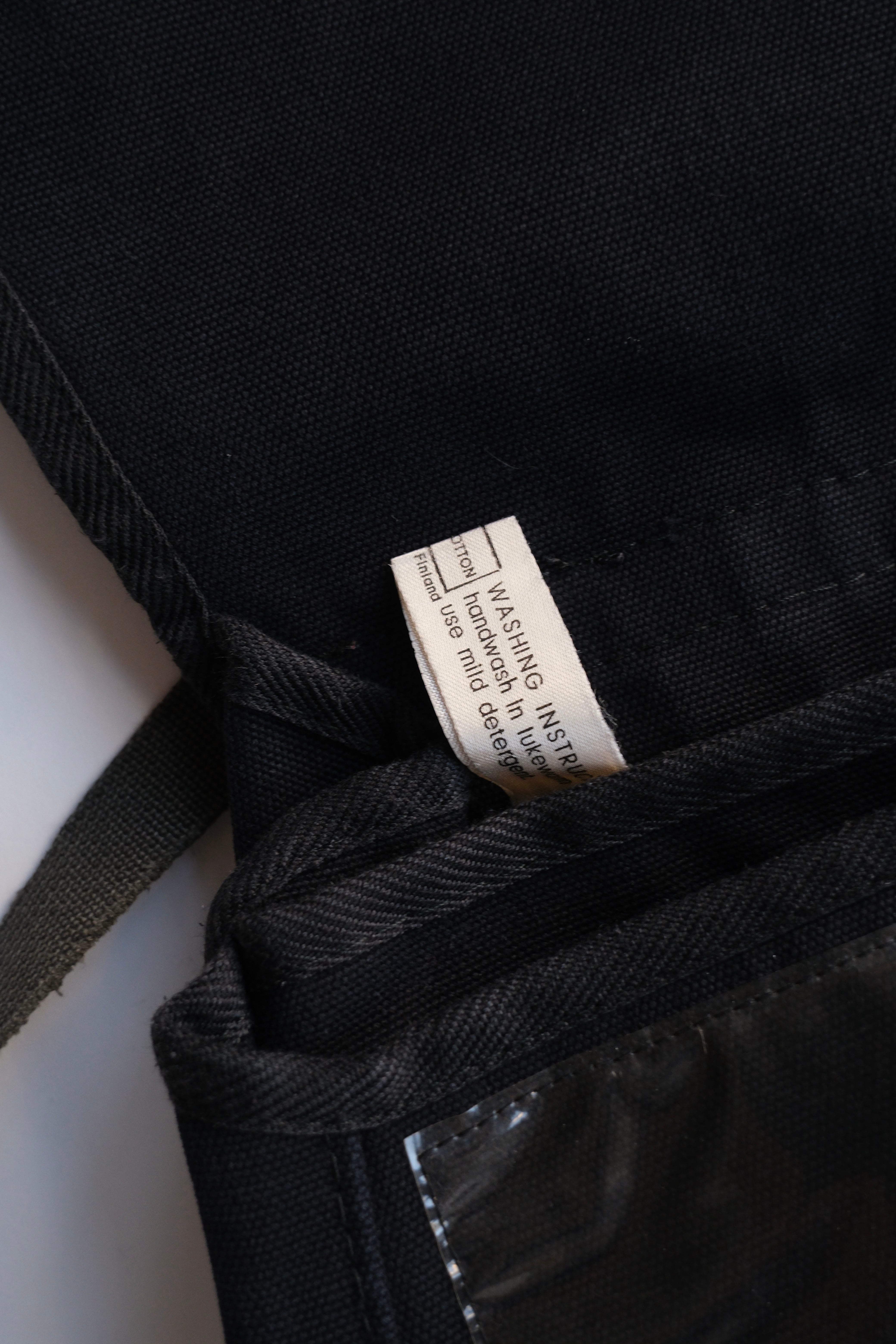 ヴィンテージ特有の厚みがあるブラックキャンバス生地は、程よく使い込まれたやわらかな風合いが感じられます。レザーのベルトや金属パーツ、内側に配されたブランドロゴの織りネーム、ポケットなど、細部までとてもよく作り込まれている印象。