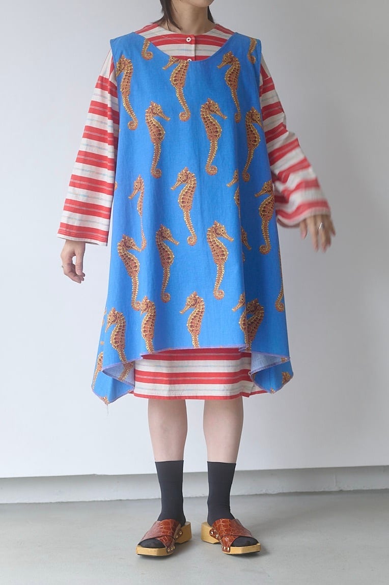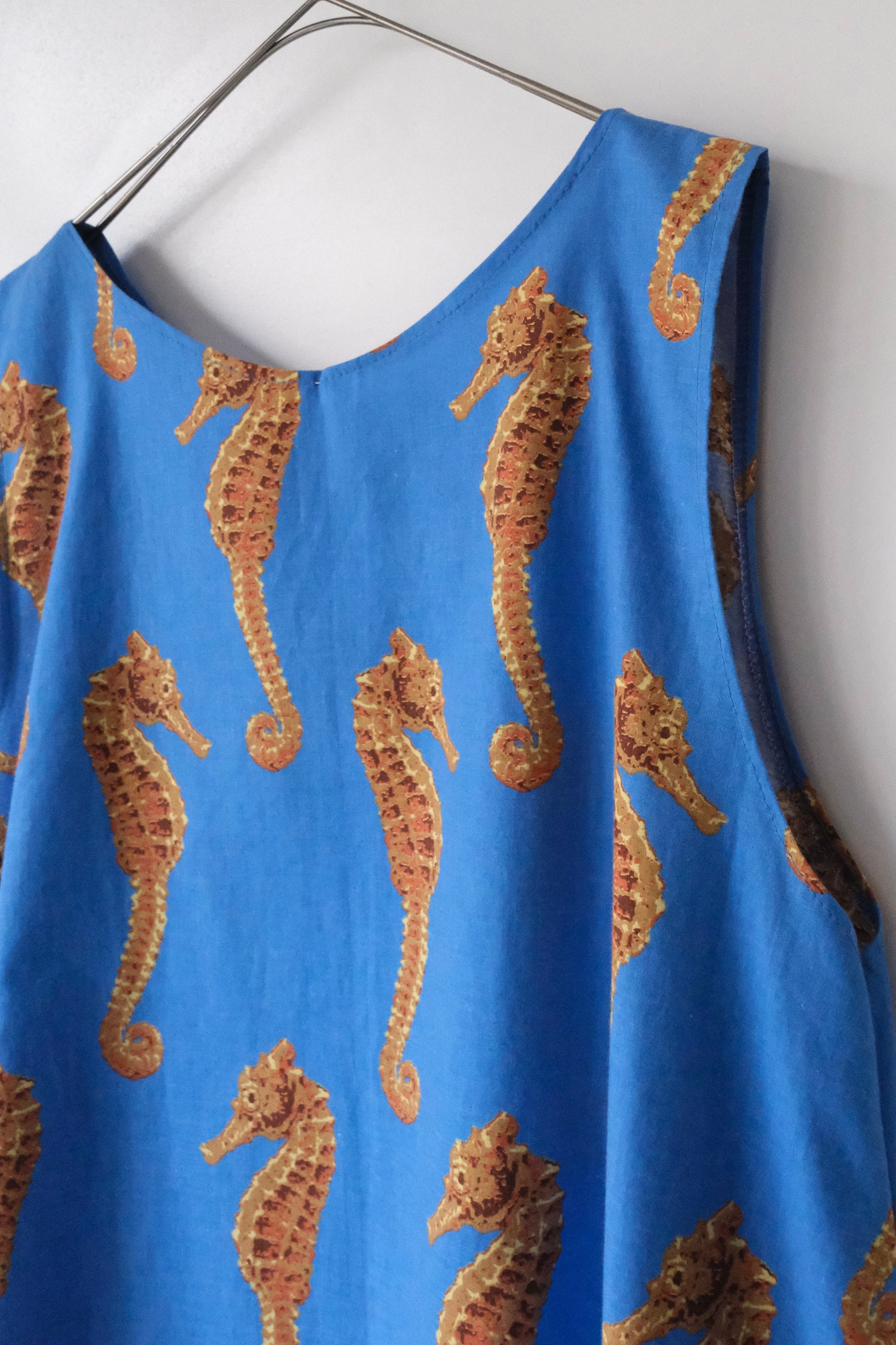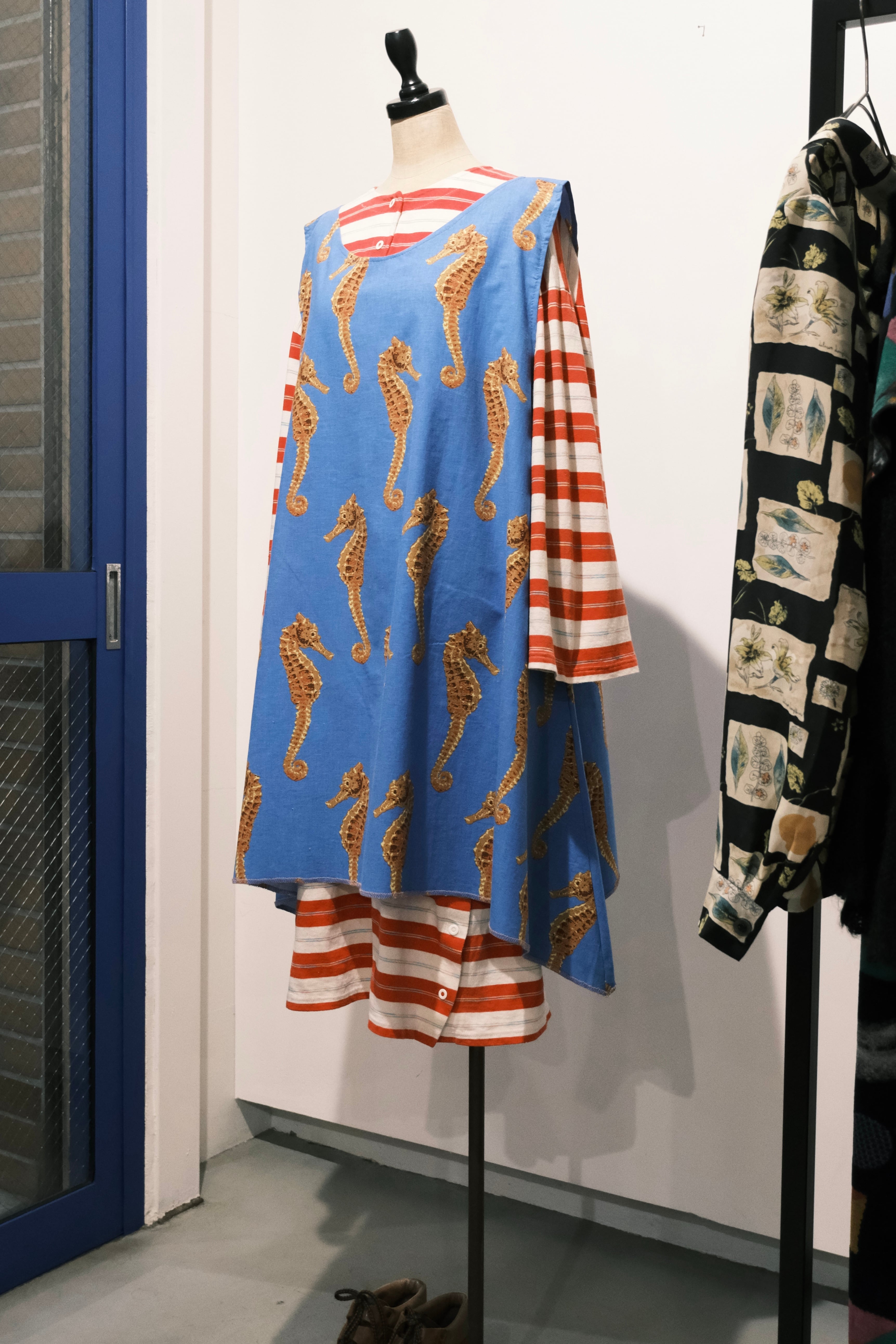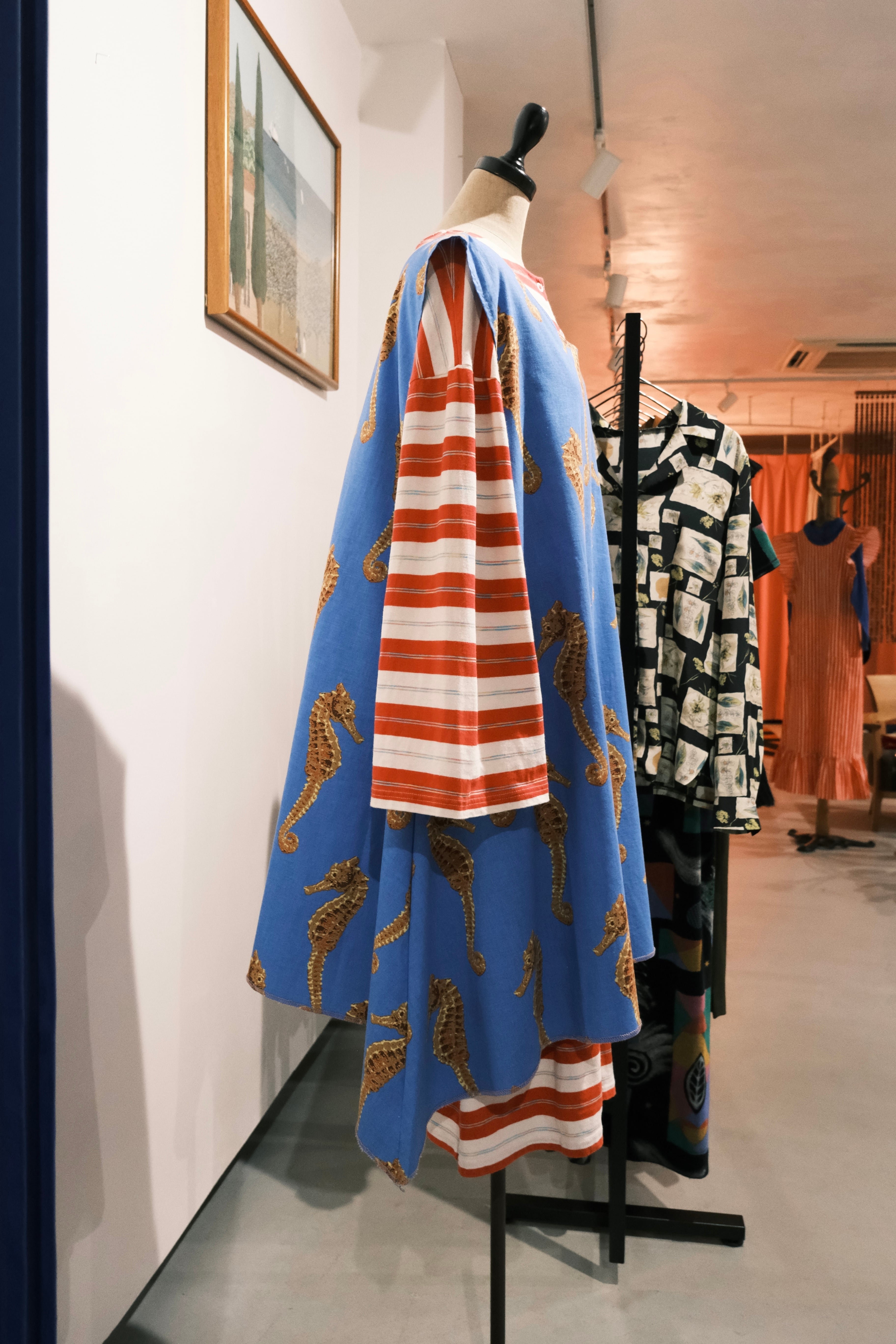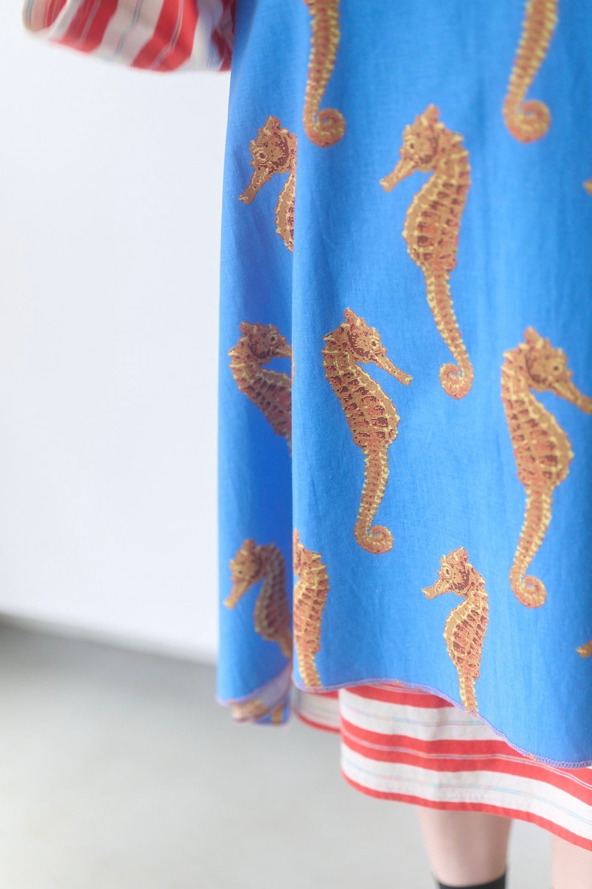 鮮やかなブルーにタツノオトシゴのパターンが映えるドレス。フィンランドで買い付けた、おそらくハンドメイドと思われる一着です。