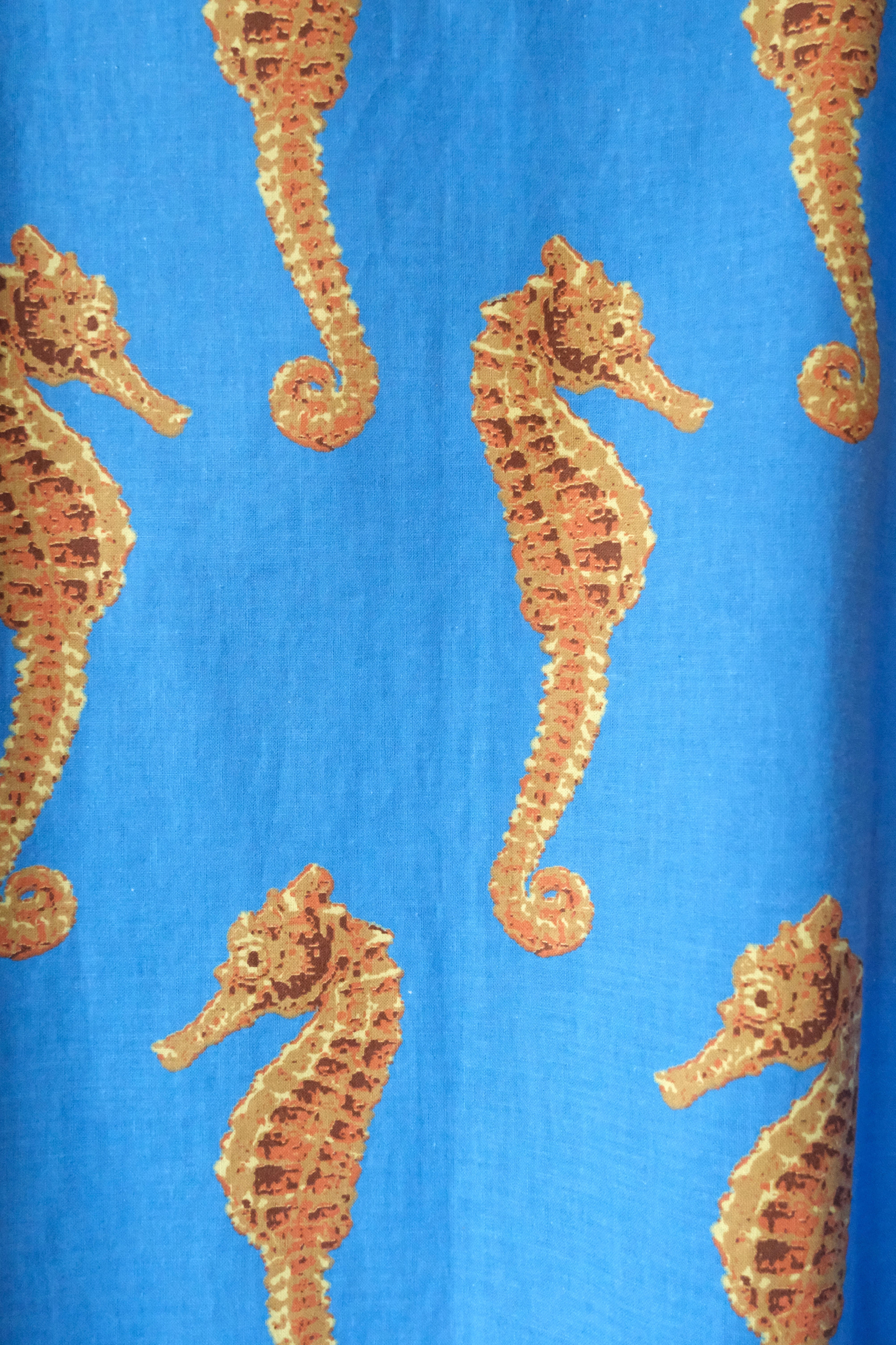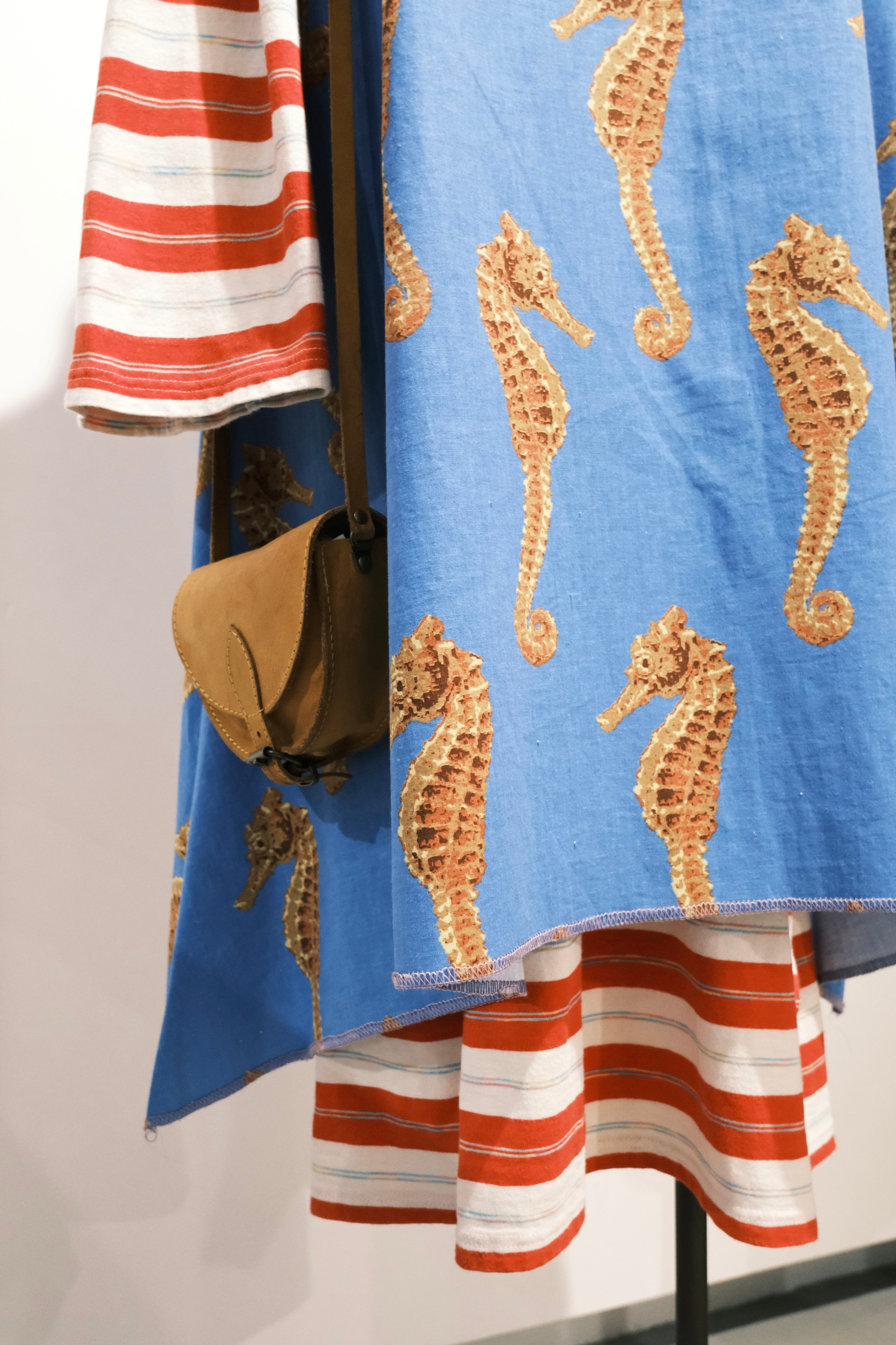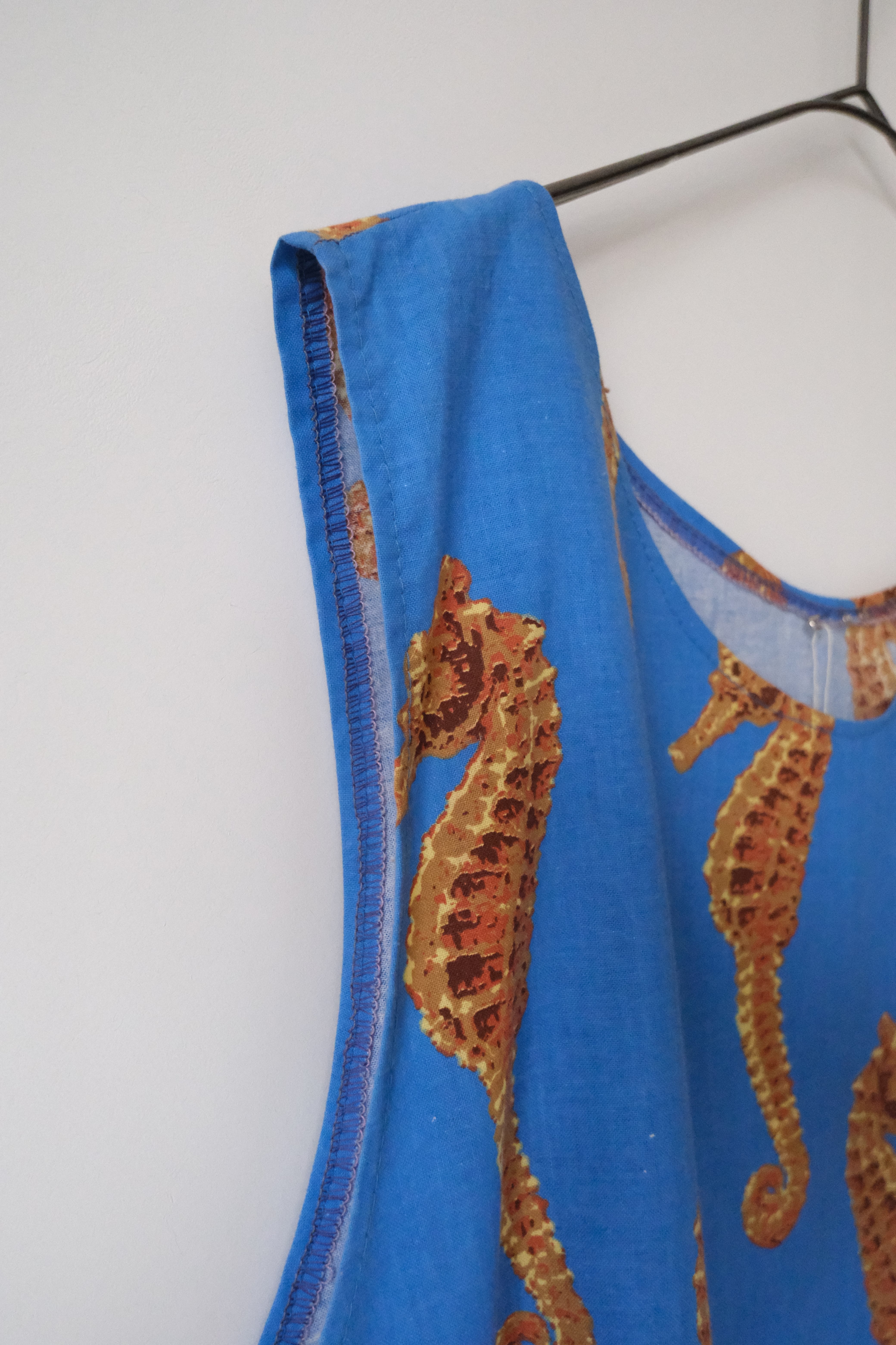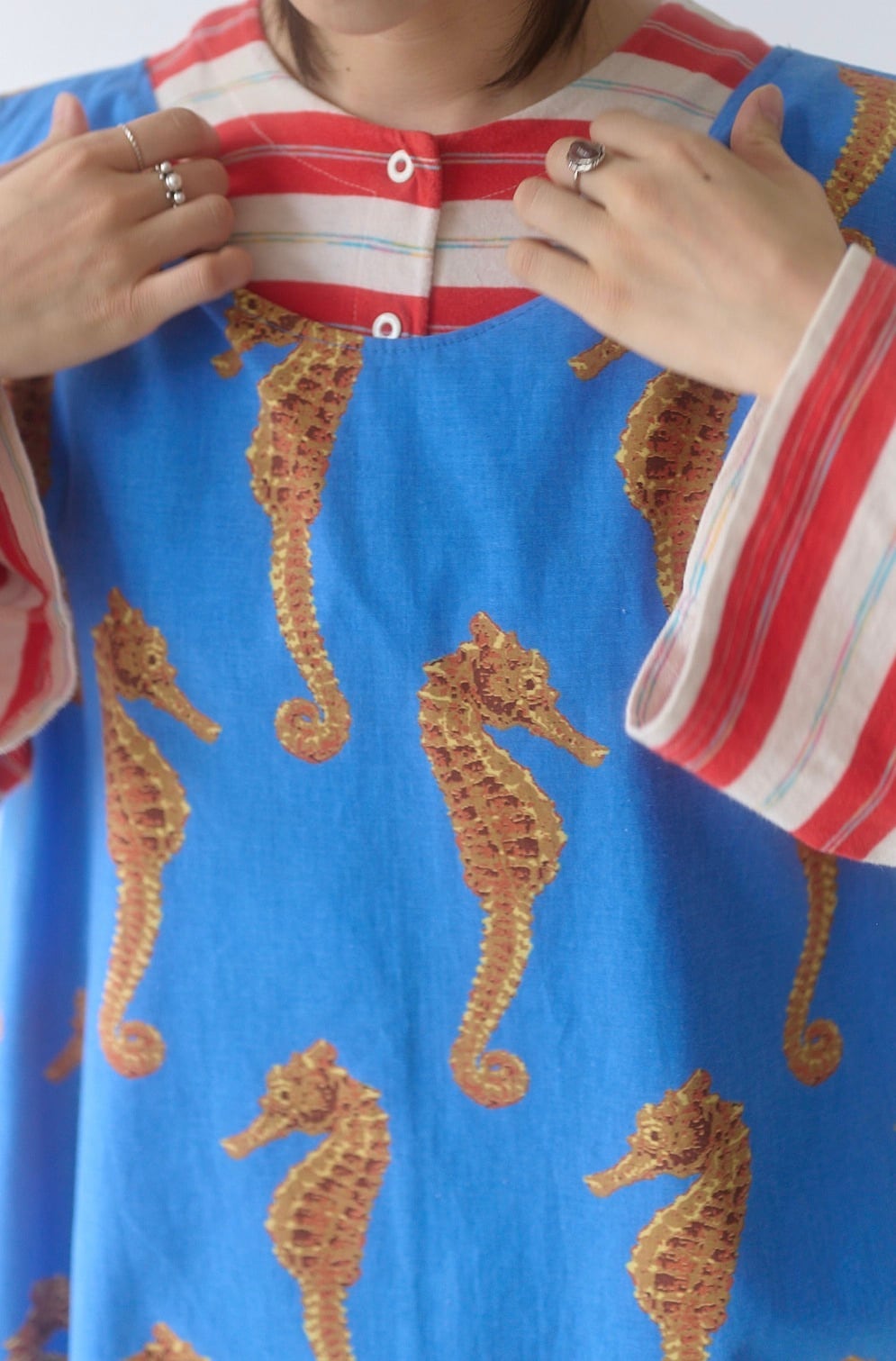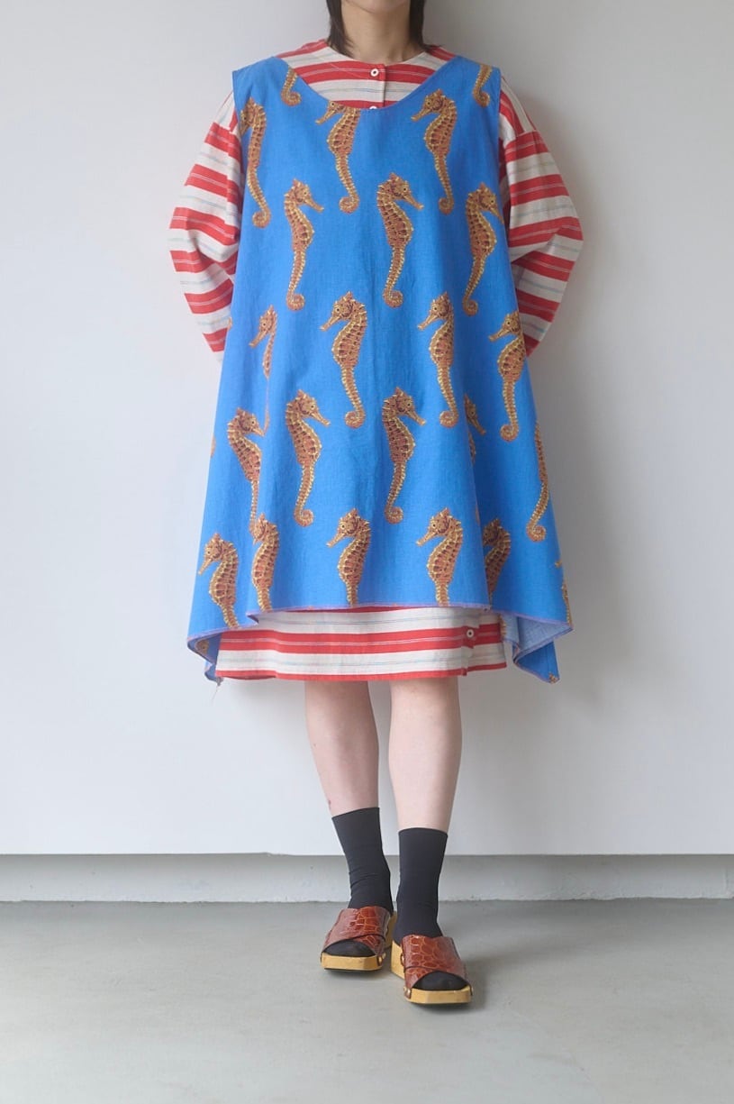 鮮やかなブルーにタツノオトシゴのパターンが映えるドレス。フィンランドで買い付けた、おそらくハンドメイドと思われる一着です。