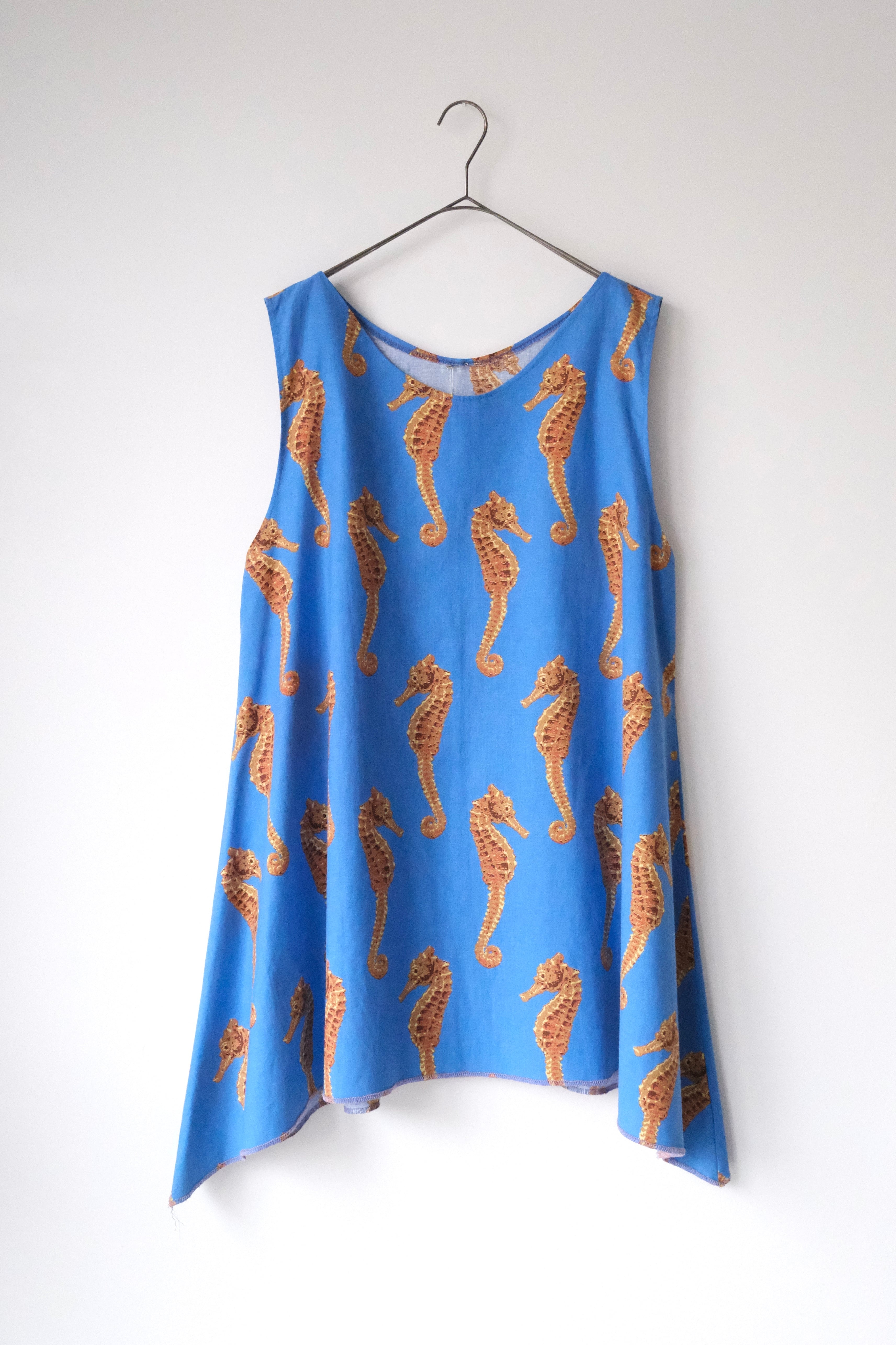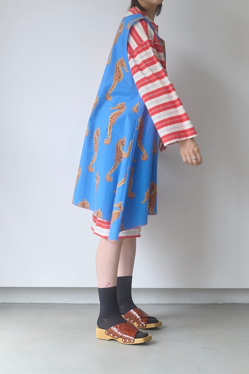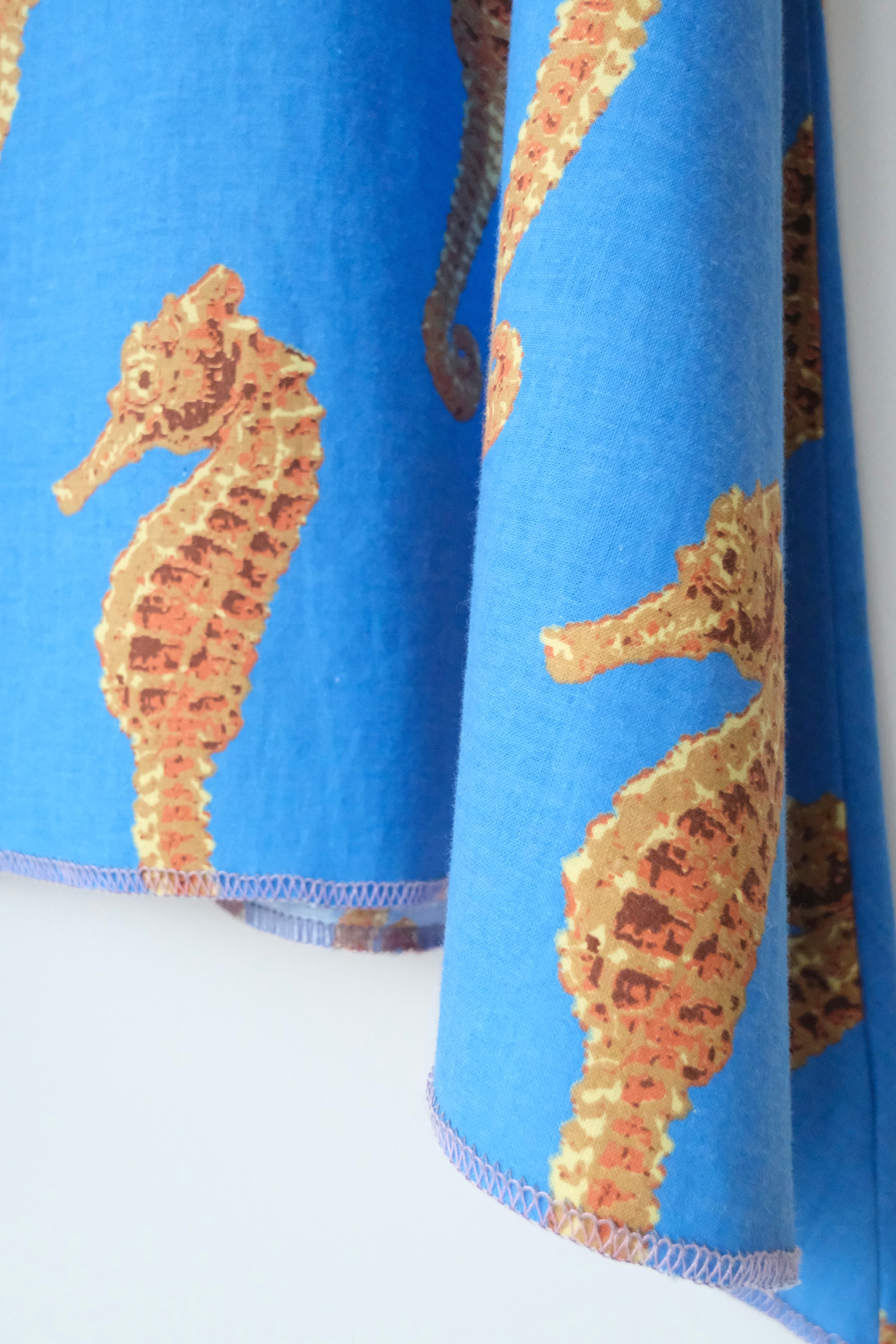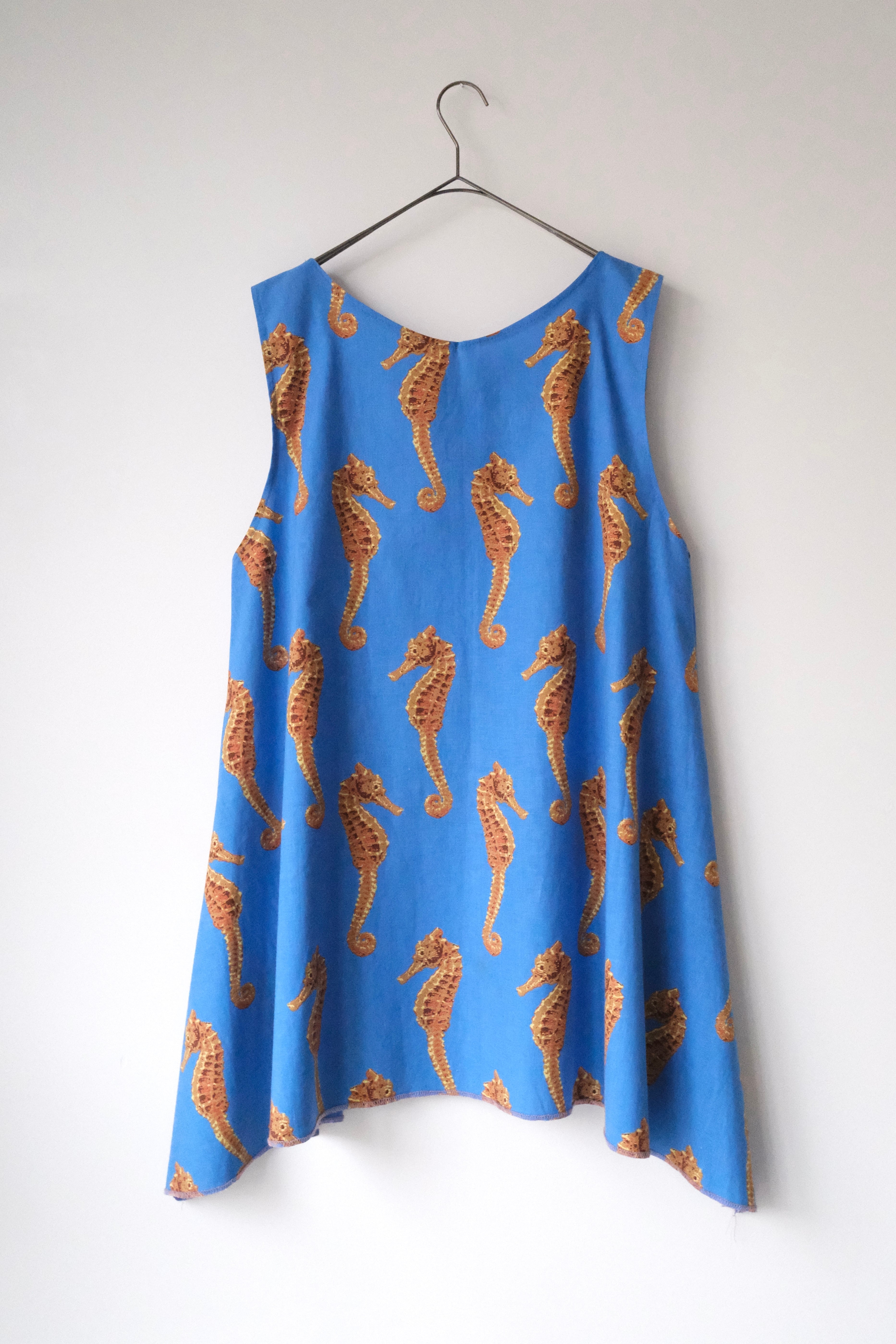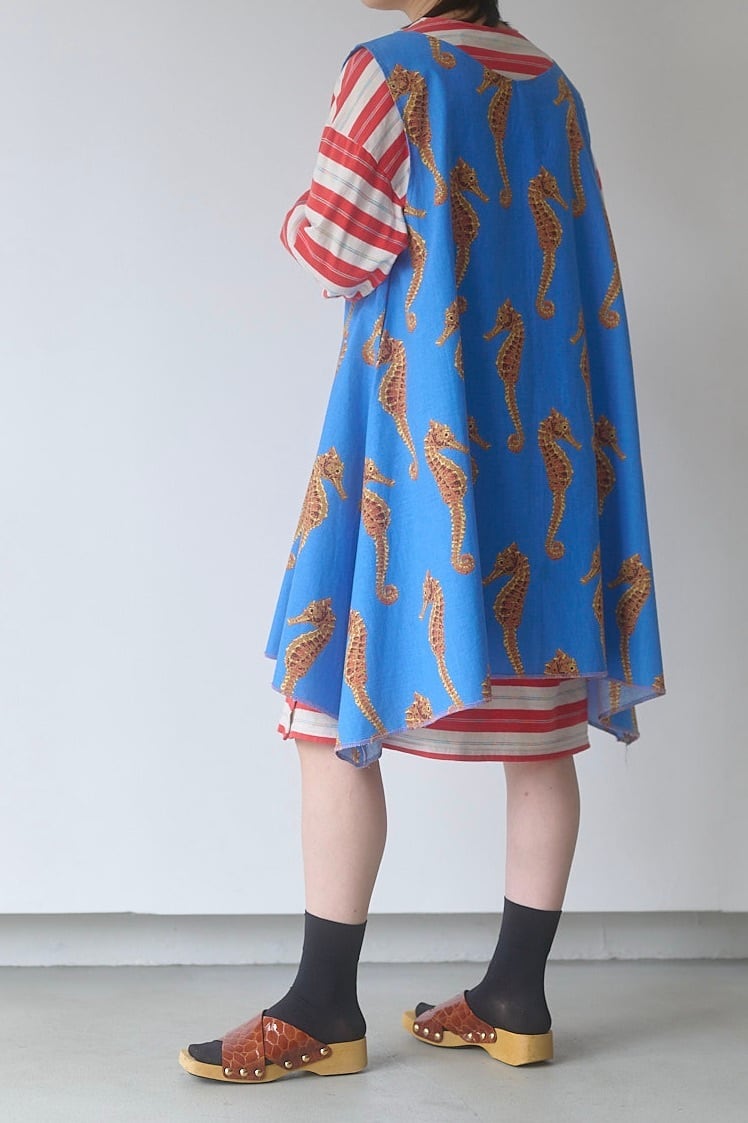 鮮やかなブルーにタツノオトシゴのパターンが映えるドレス。フィンランドで買い付けた、おそらくハンドメイドと思われる一着です。