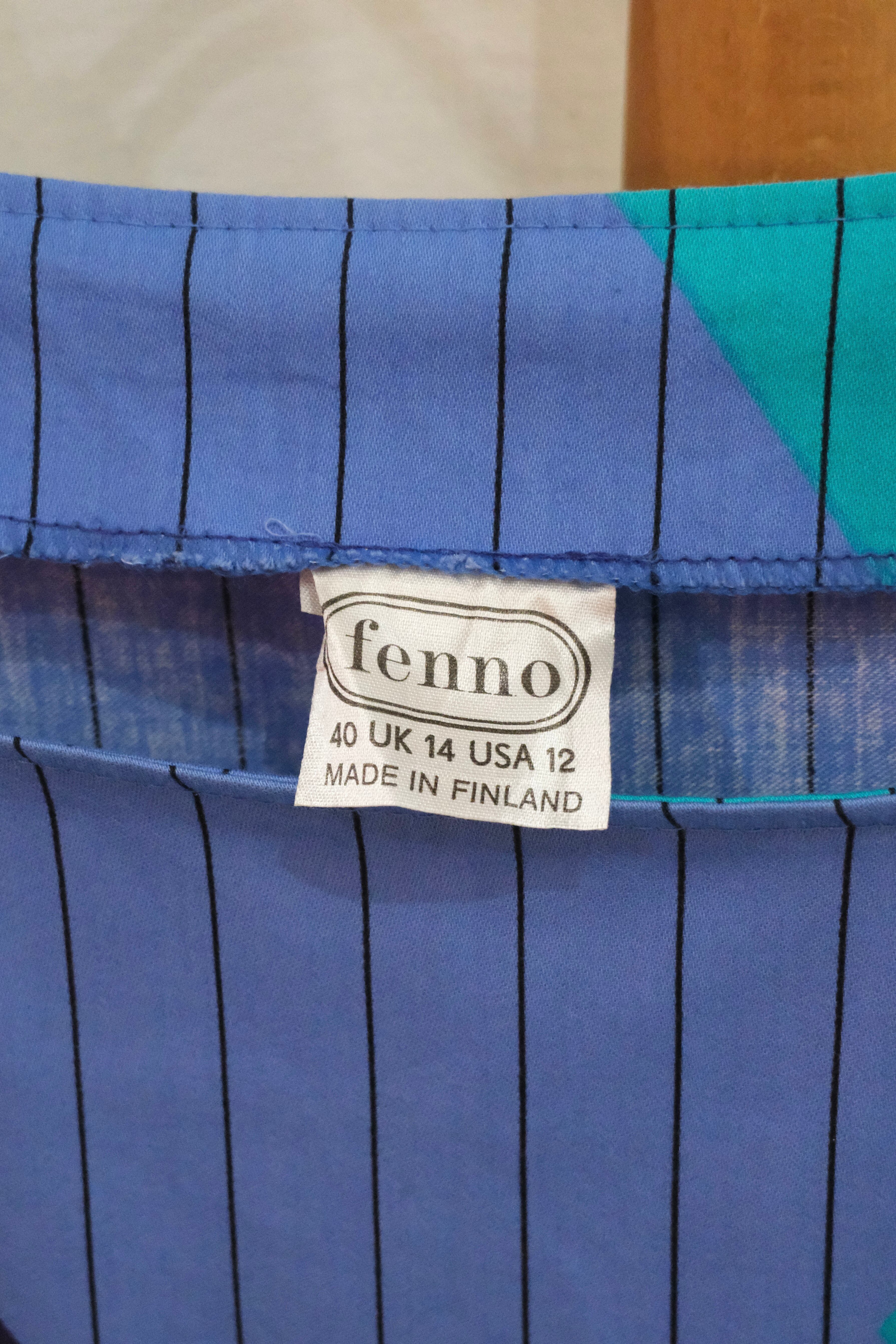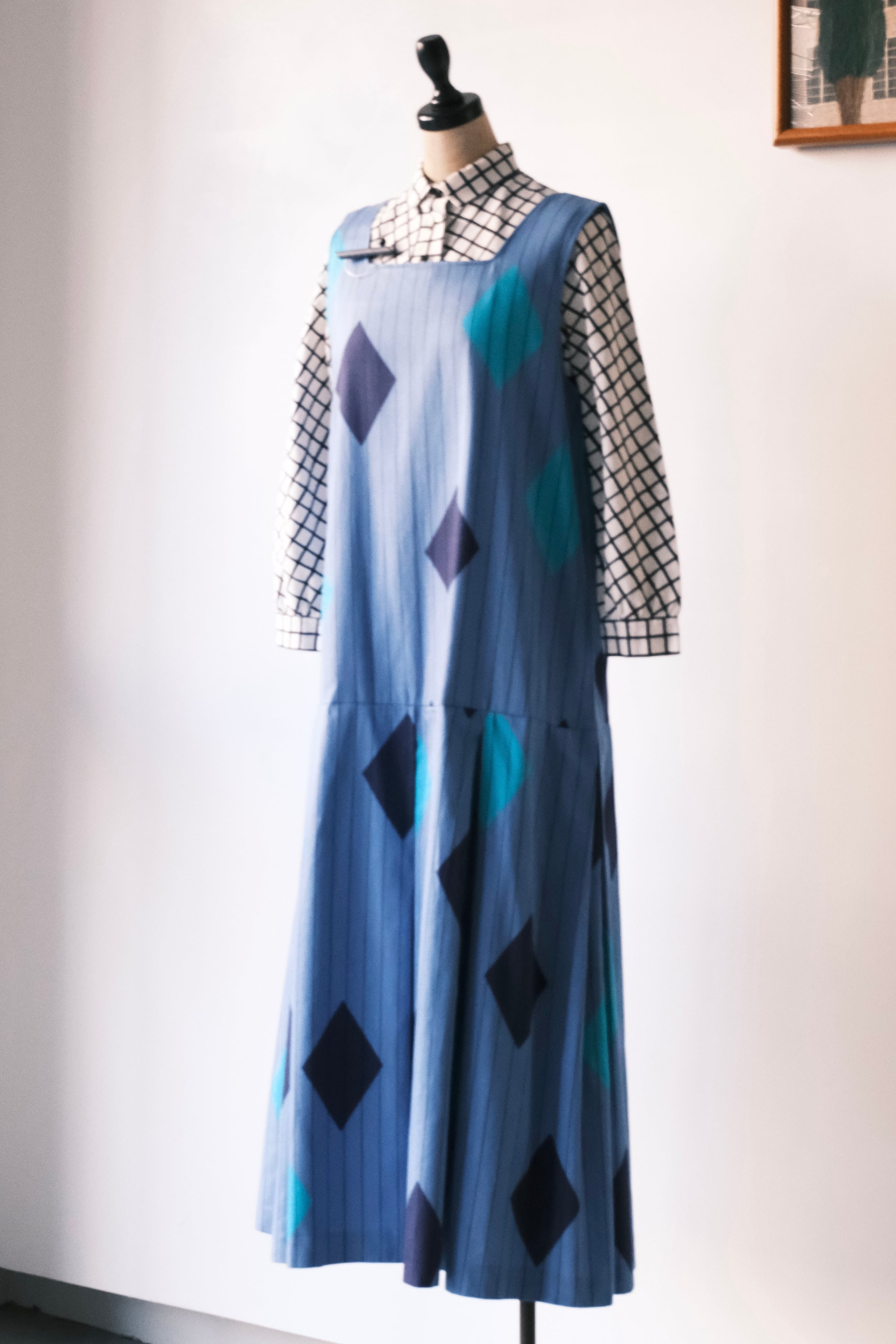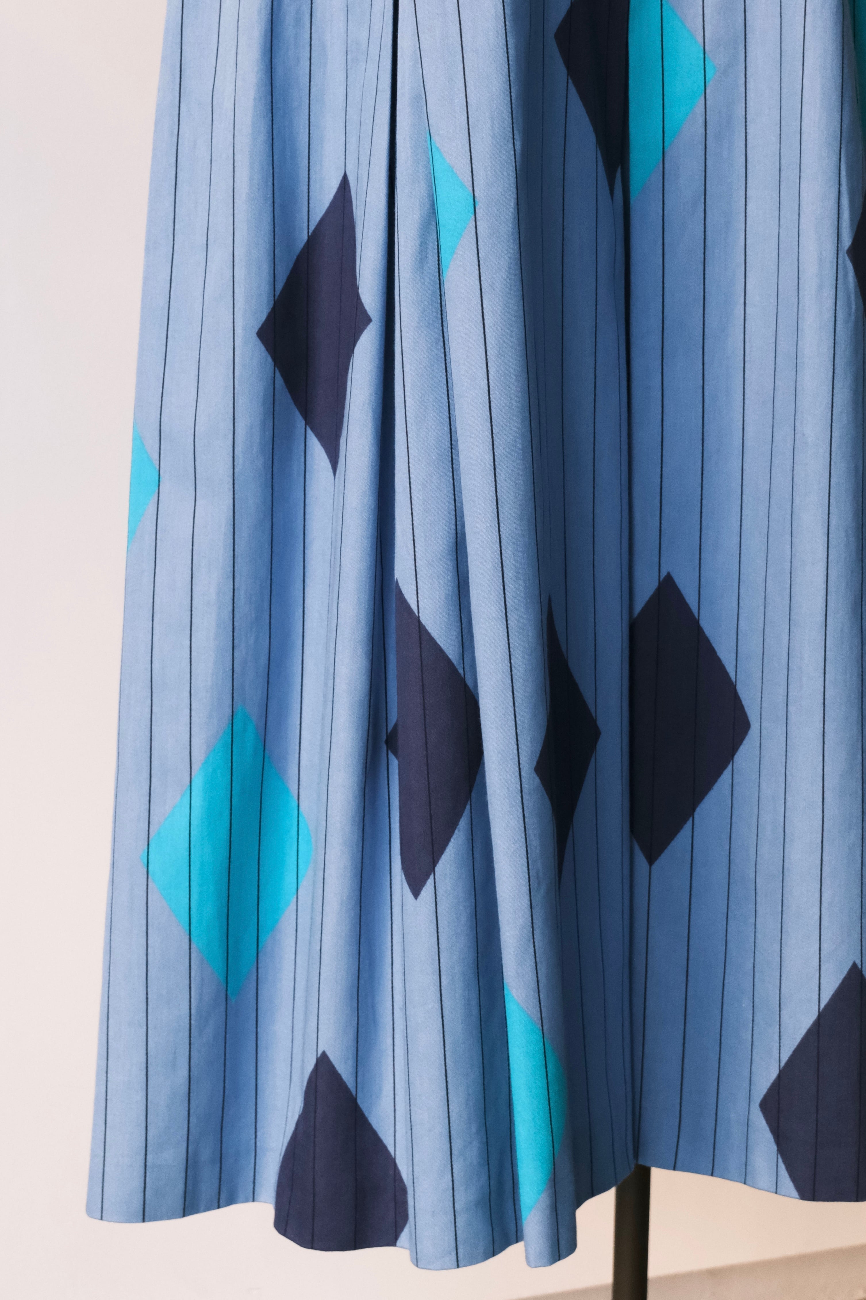 鮮やかなブルーに、ストライプと大ぶりのダイヤ柄を組み合わせたプリントが目を引くロングドレス。フィンランドの70年代頃のアイテムで、当時あった「fenno」というブランドの一着です。
