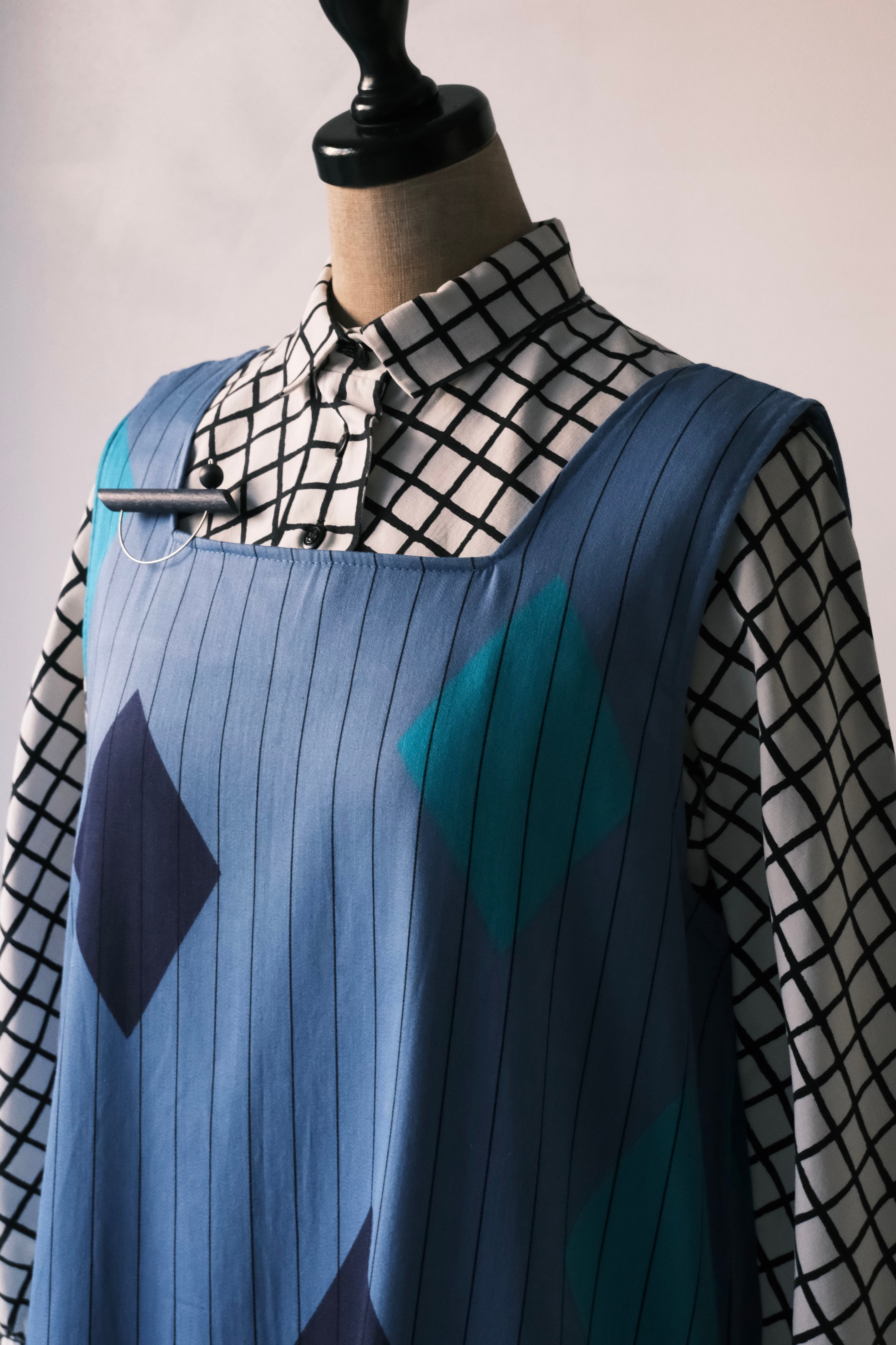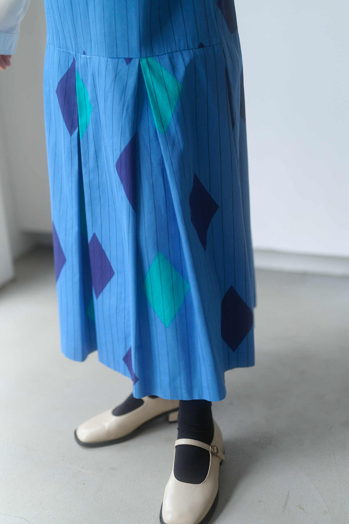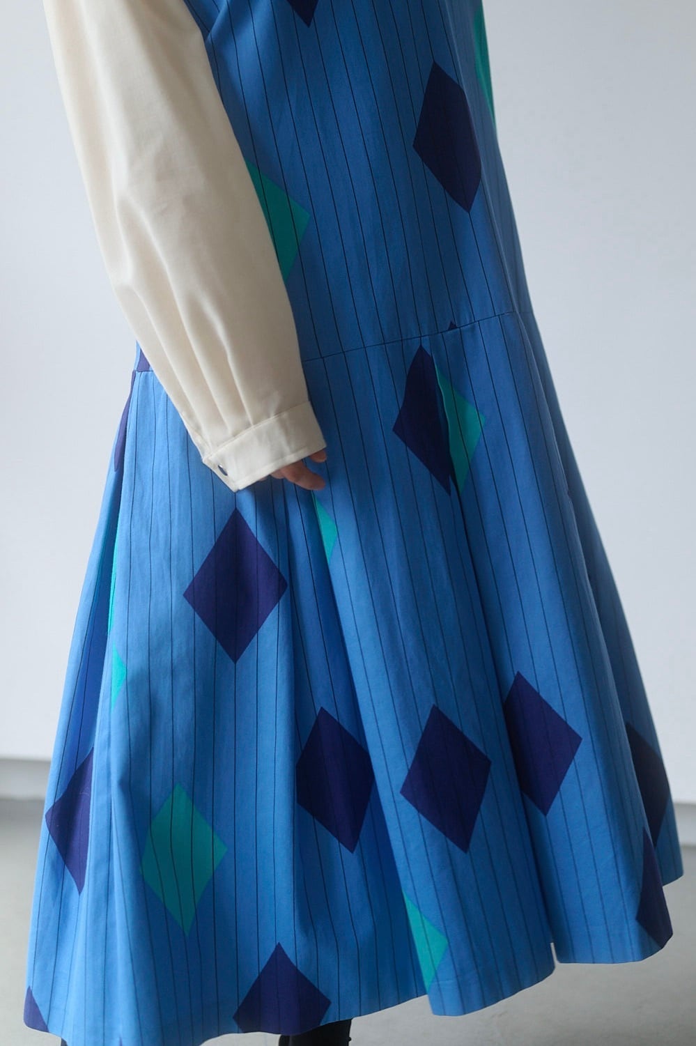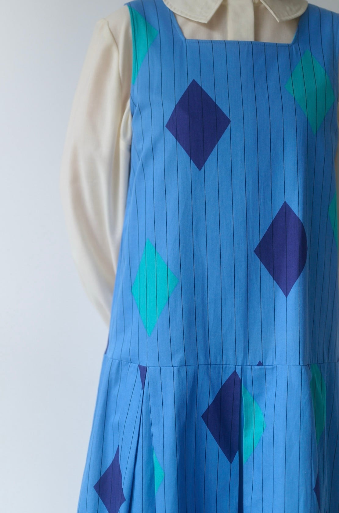 鮮やかなブルーに、ストライプと大ぶりのダイヤ柄を組み合わせたプリントが目を引くロングドレス。フィンランドの70年代頃のアイテムで、当時あった「fenno」というブランドの一着です。