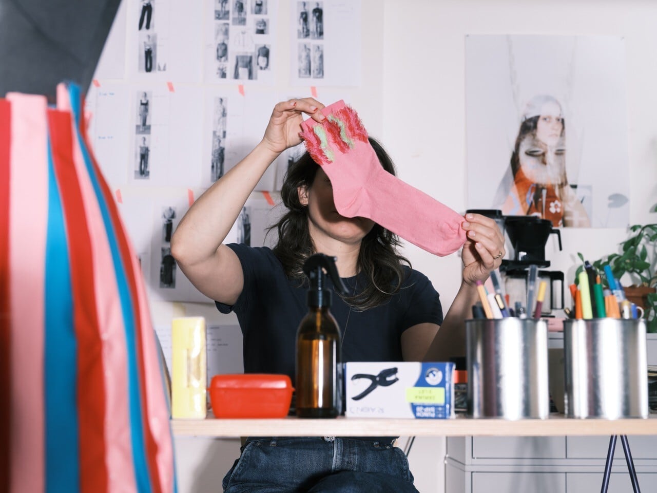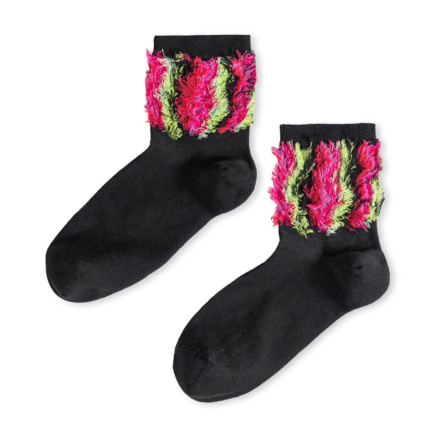 靴下が本来そうであるべき裏表をひっくり返し、織り糸を切り裂いて足首に炎をまとったかのように仕立てたソックス。チェコのファッションデザイナー、テレザ・ロザリー・クラドショヴァーによるデザインです。短めの丈感で、足元でもけもけとした存在感を放ちます。